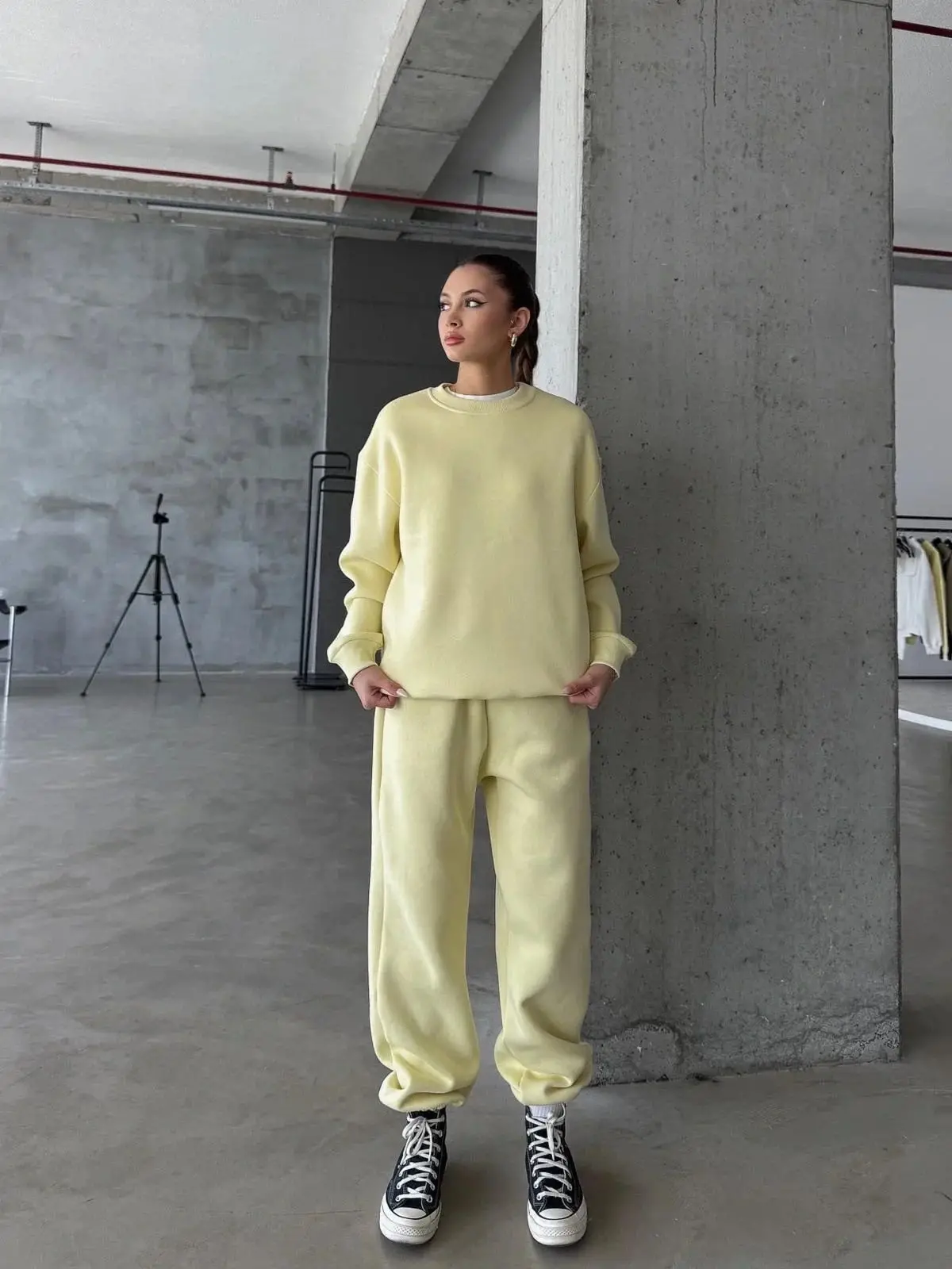 Terzi Bey markasının tasarladığı sarı renkli lastik paça eşofman, şıklığı ve rahatlığı bir arada sunuyor.