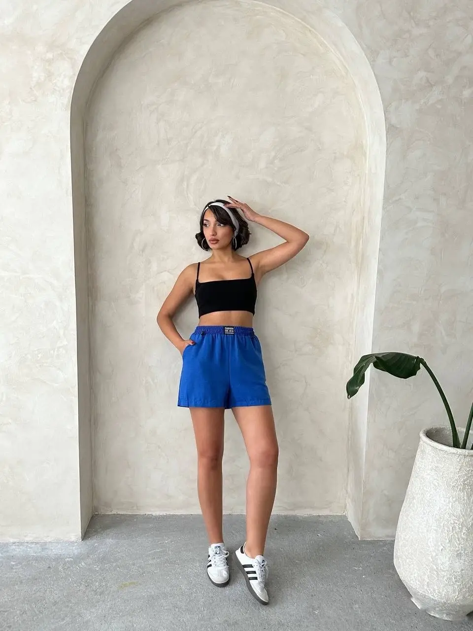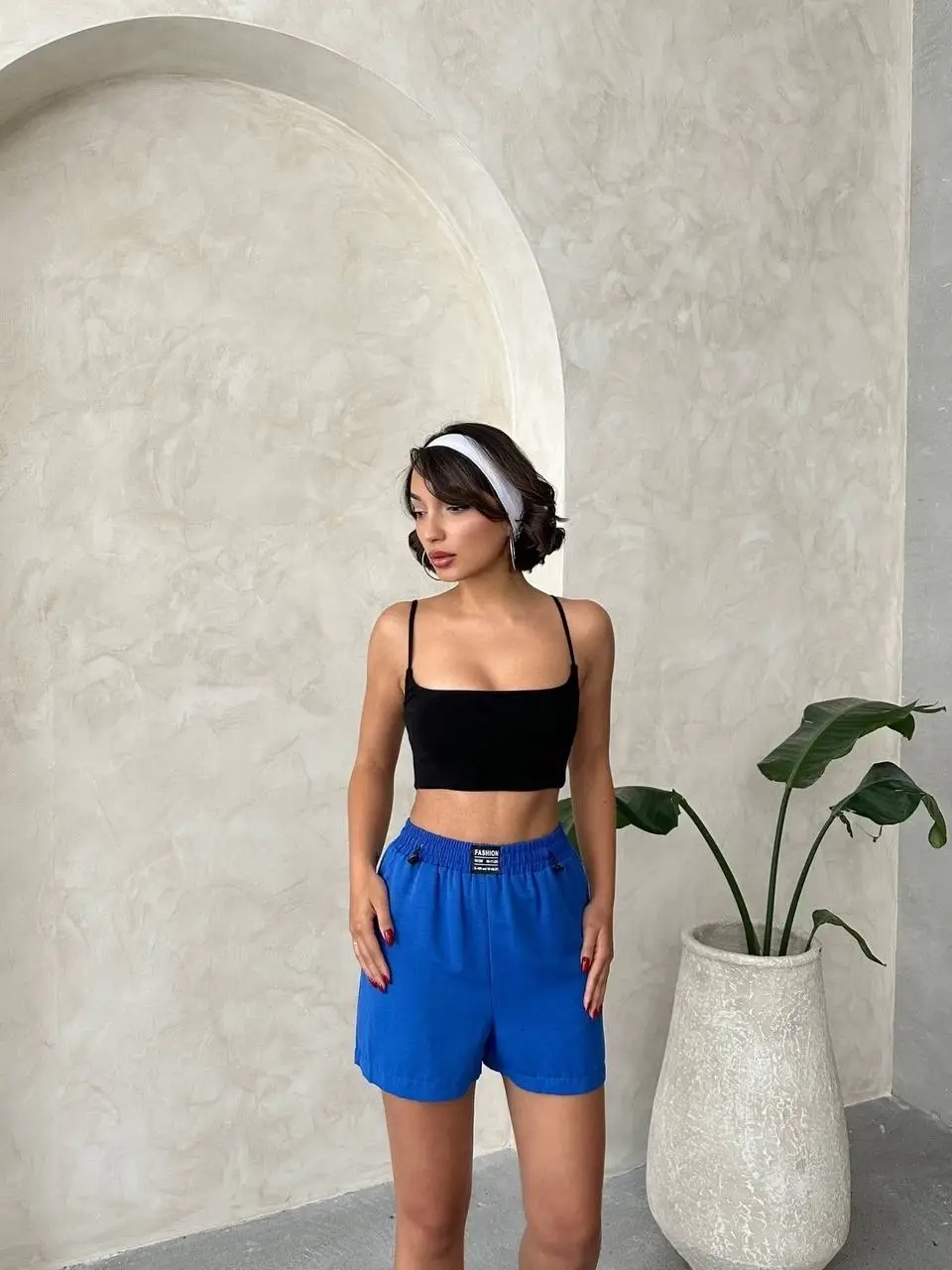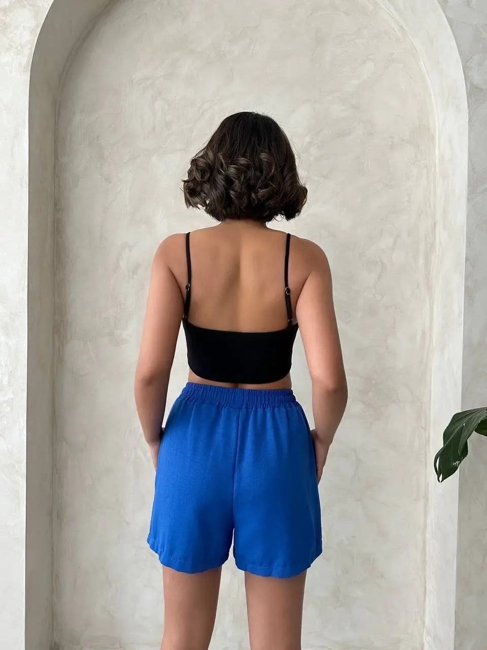 Armalı keten şort saks mavisi, yaz aylarında şıklığı ve rahatlığı bir arada sunar.