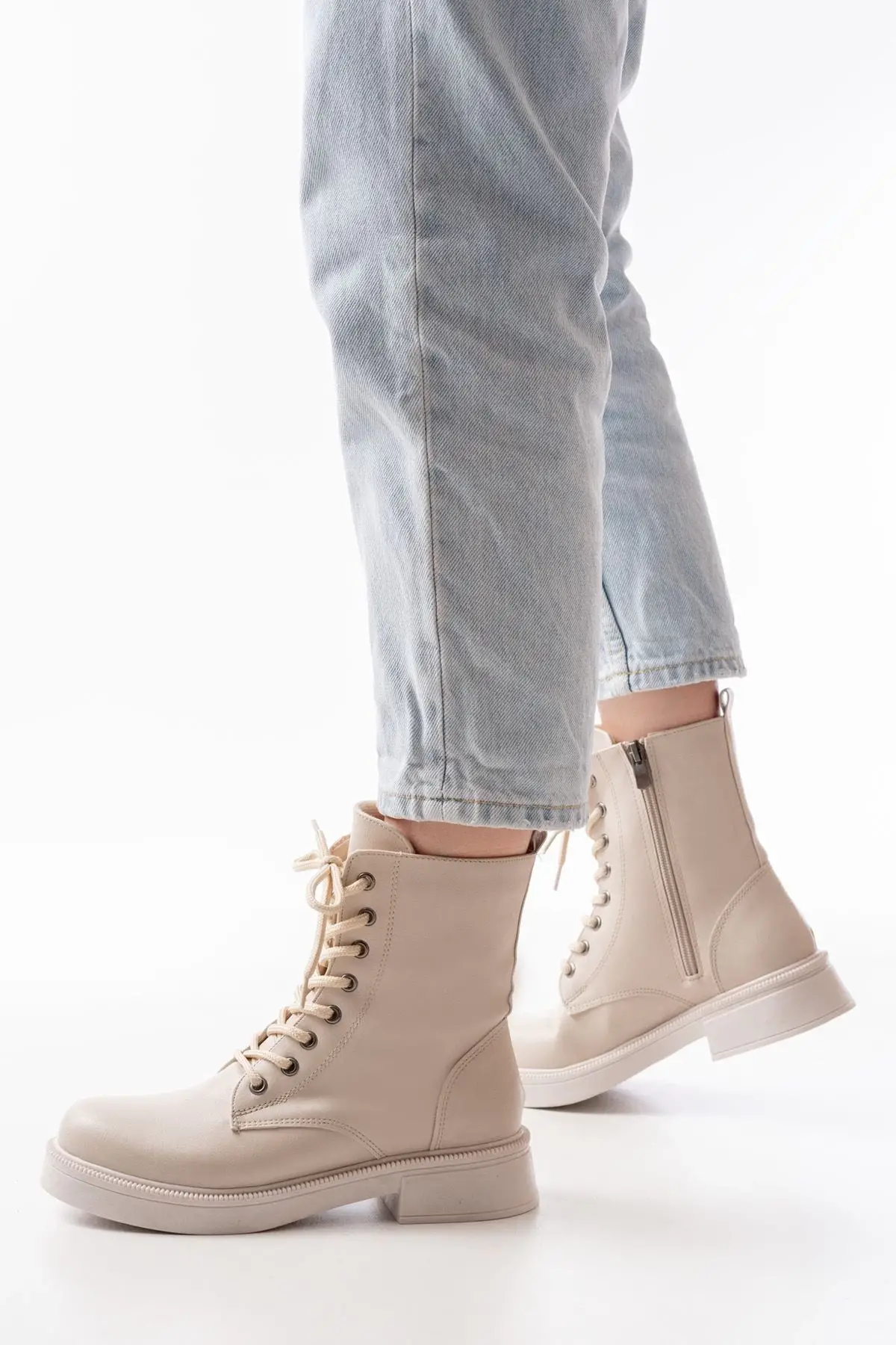 Bej Düz Topuklu Bağcıklı Fermuarlı Günlük Kadın Bot, modern tasarımı ve üstün konforu bir araya getiren eşsiz bir üründür. Günlük kullanıma uygun yapısı, kaliteli malzeme seçimi ve şık görünümü ile kadınların gardırobunun vazgeçilmez parçalarından biri olmaya adaydır.
