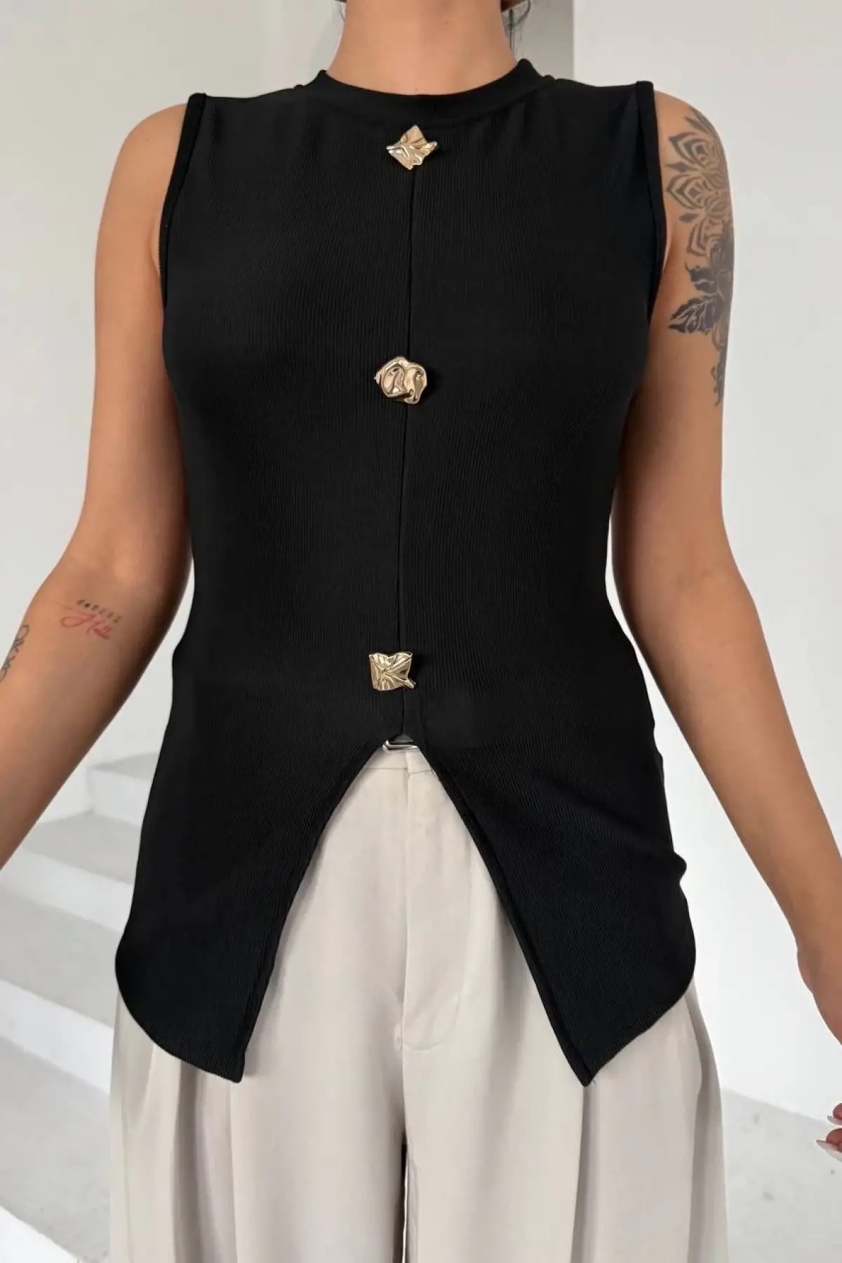 Kadın Siyah Bisiklet Yaka Gold Düğmeli Ottoman Bluz