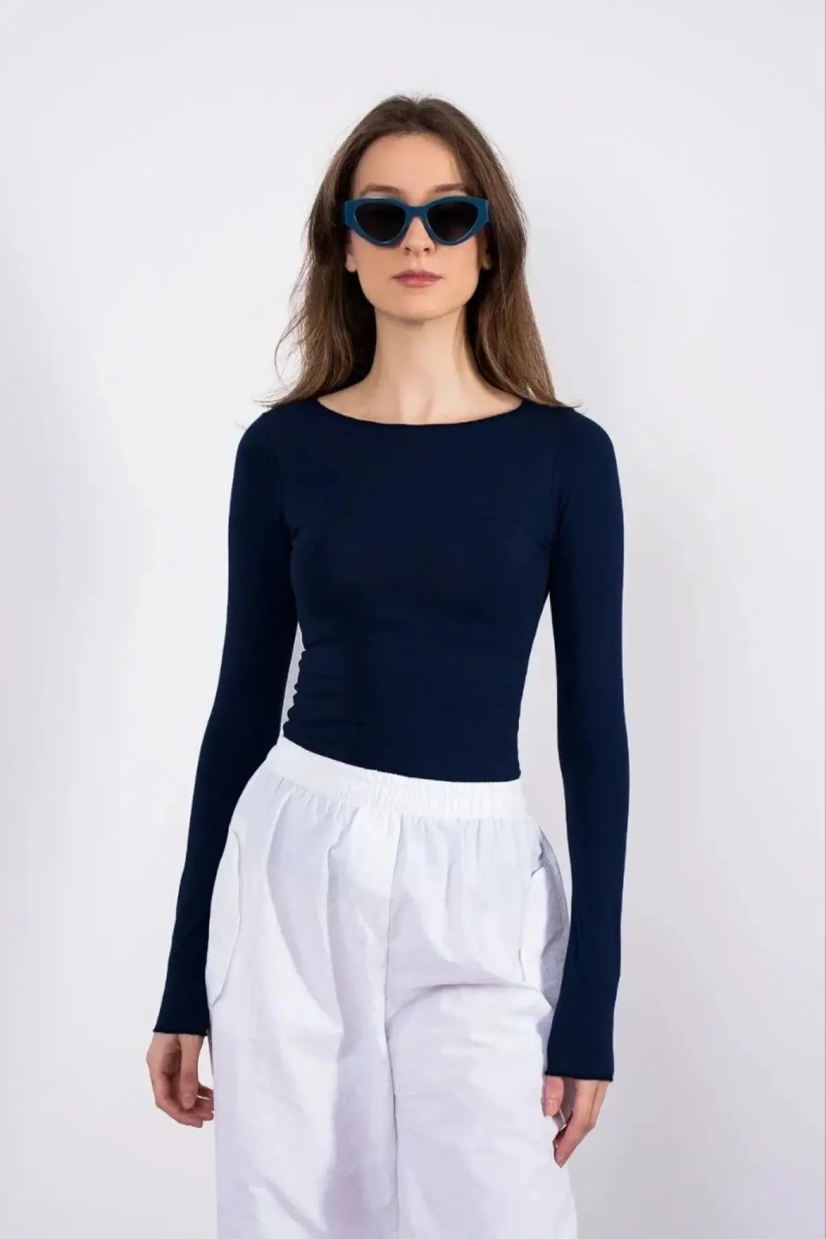 Kayık Yaka Uzun Kollu Bluz Lacivert Pt