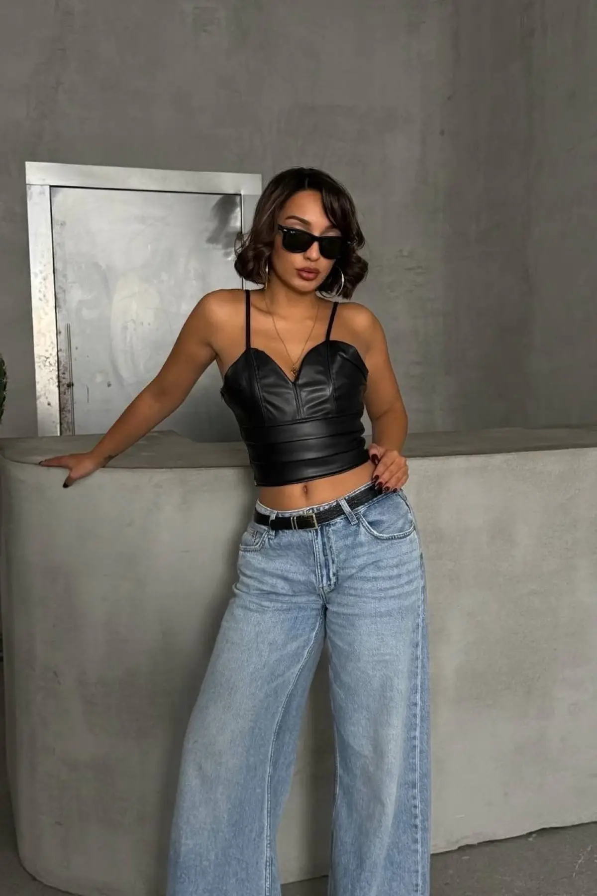 İp Askılı Yandan Fermuarlı Rastale Deri Crop Siyah S24113