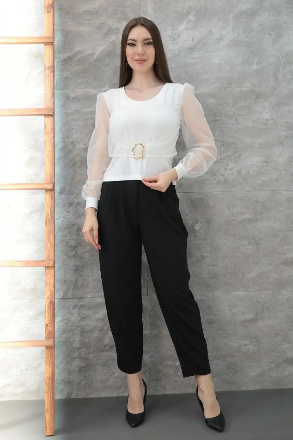 Tokalı Tül Kollu Bluz Beyaz T4071