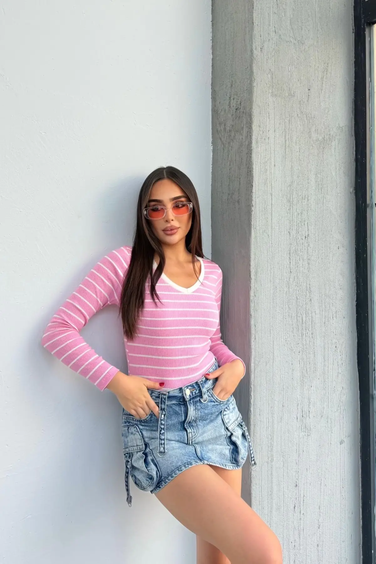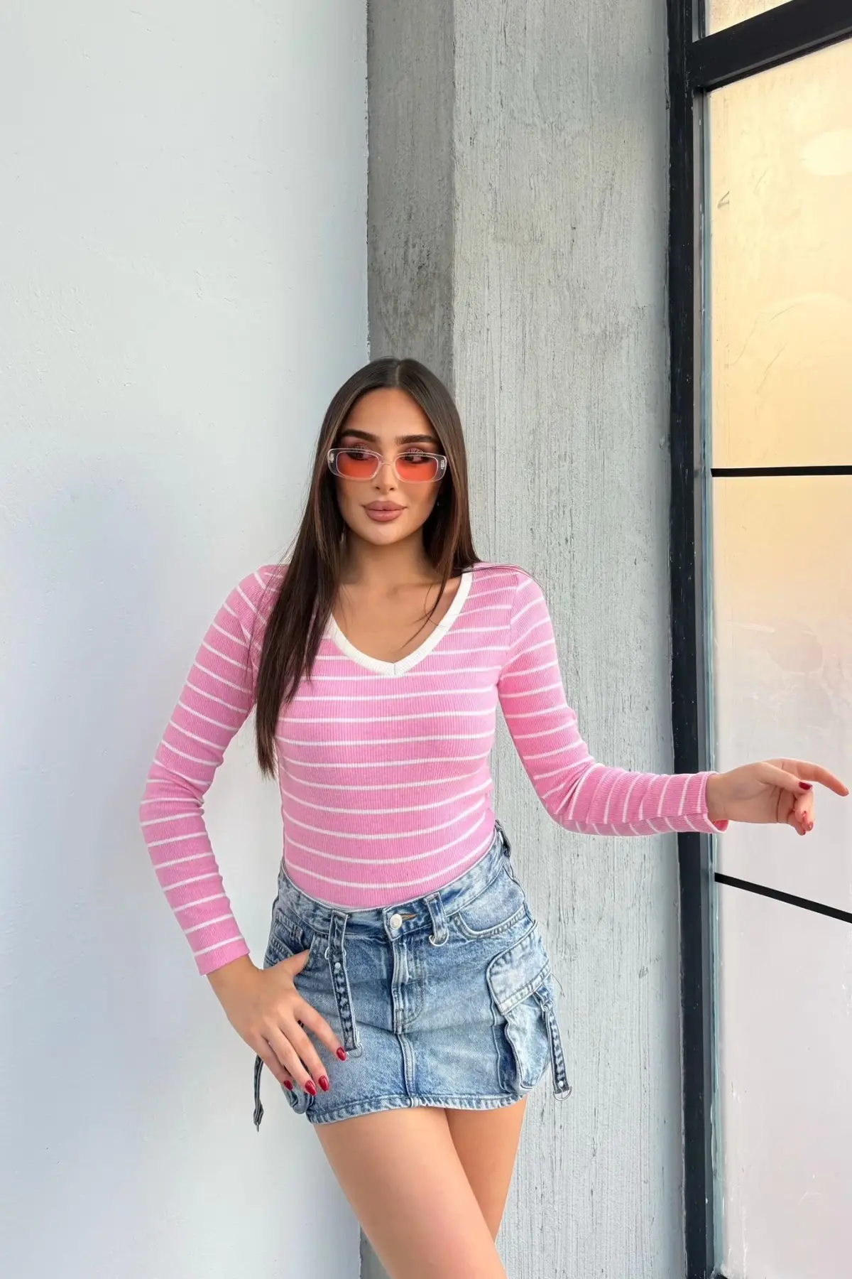 V Yaka Çizgili Bluz Pembe A3699