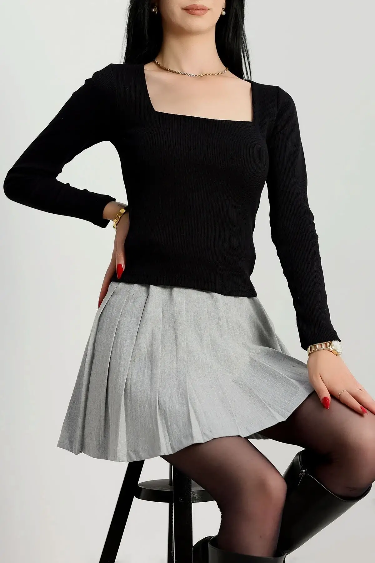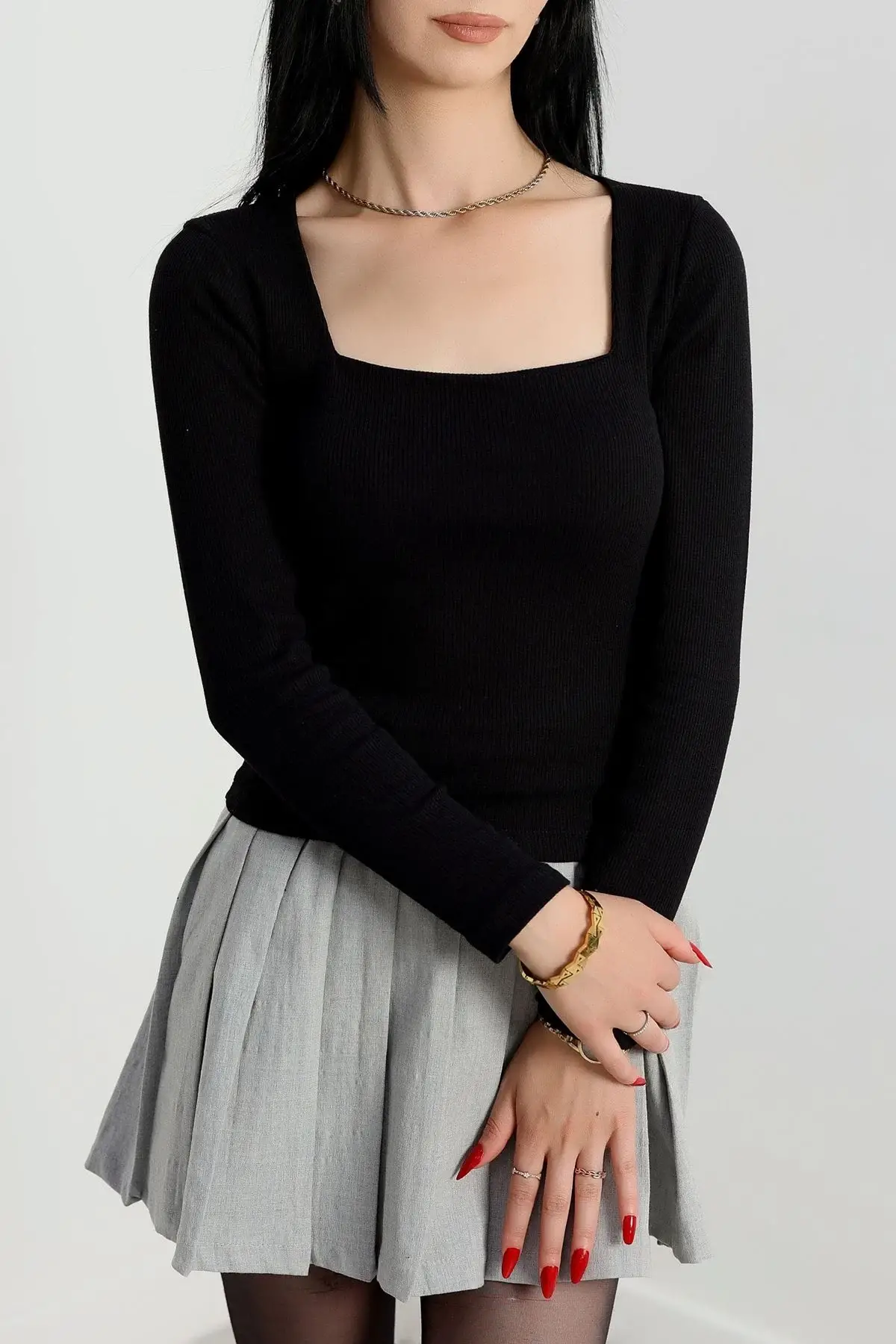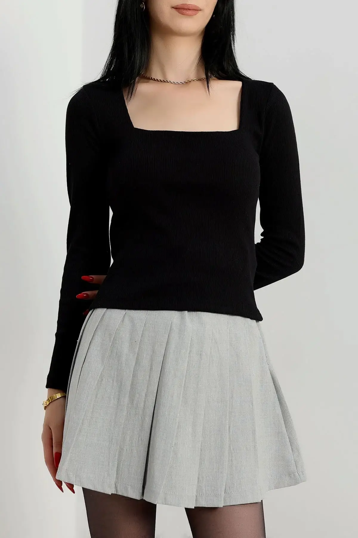 Kelebek Yaka Uzun Kol Bluz Siyah