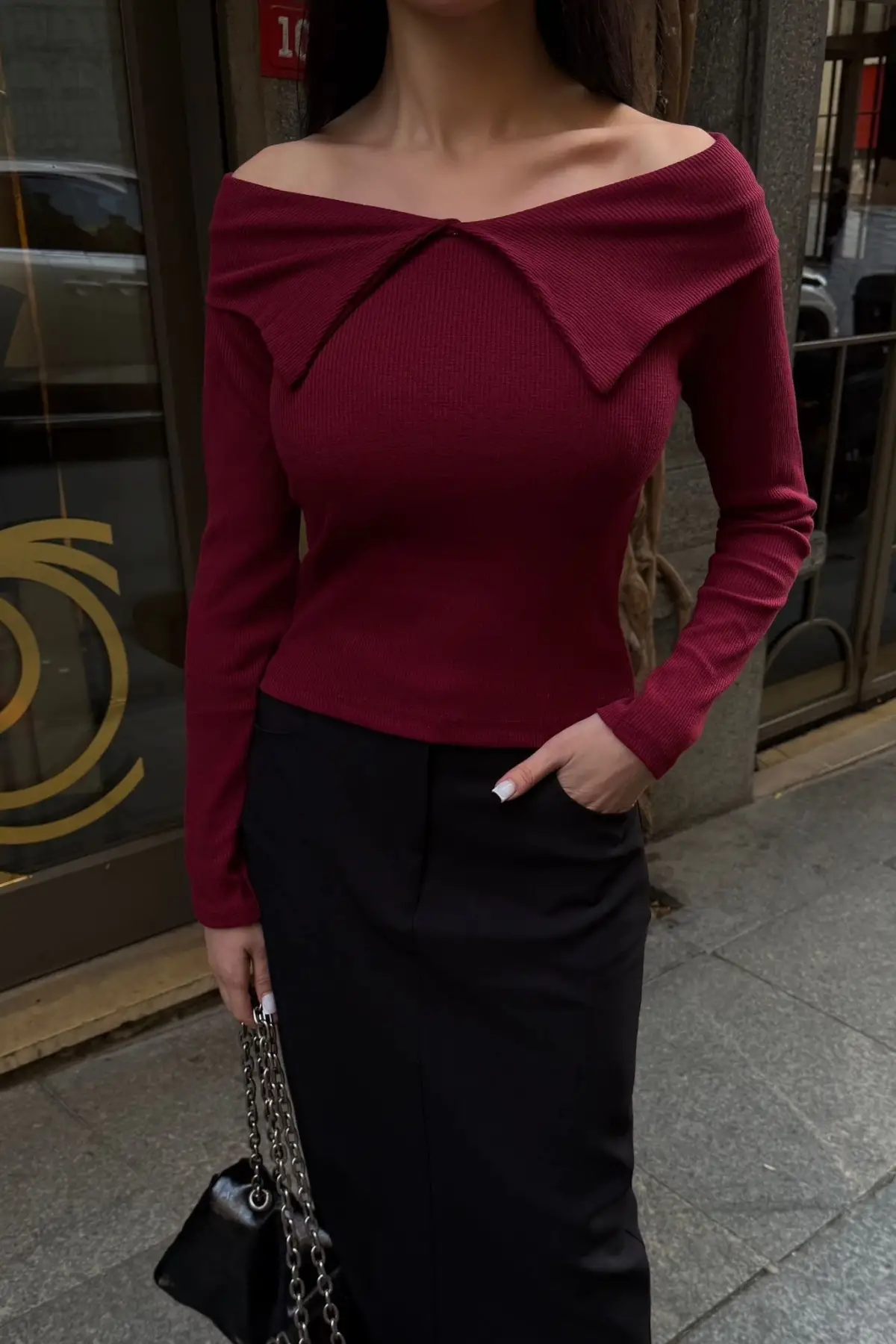 Kelebek Yaka Uzun Kol Bluz Bordo