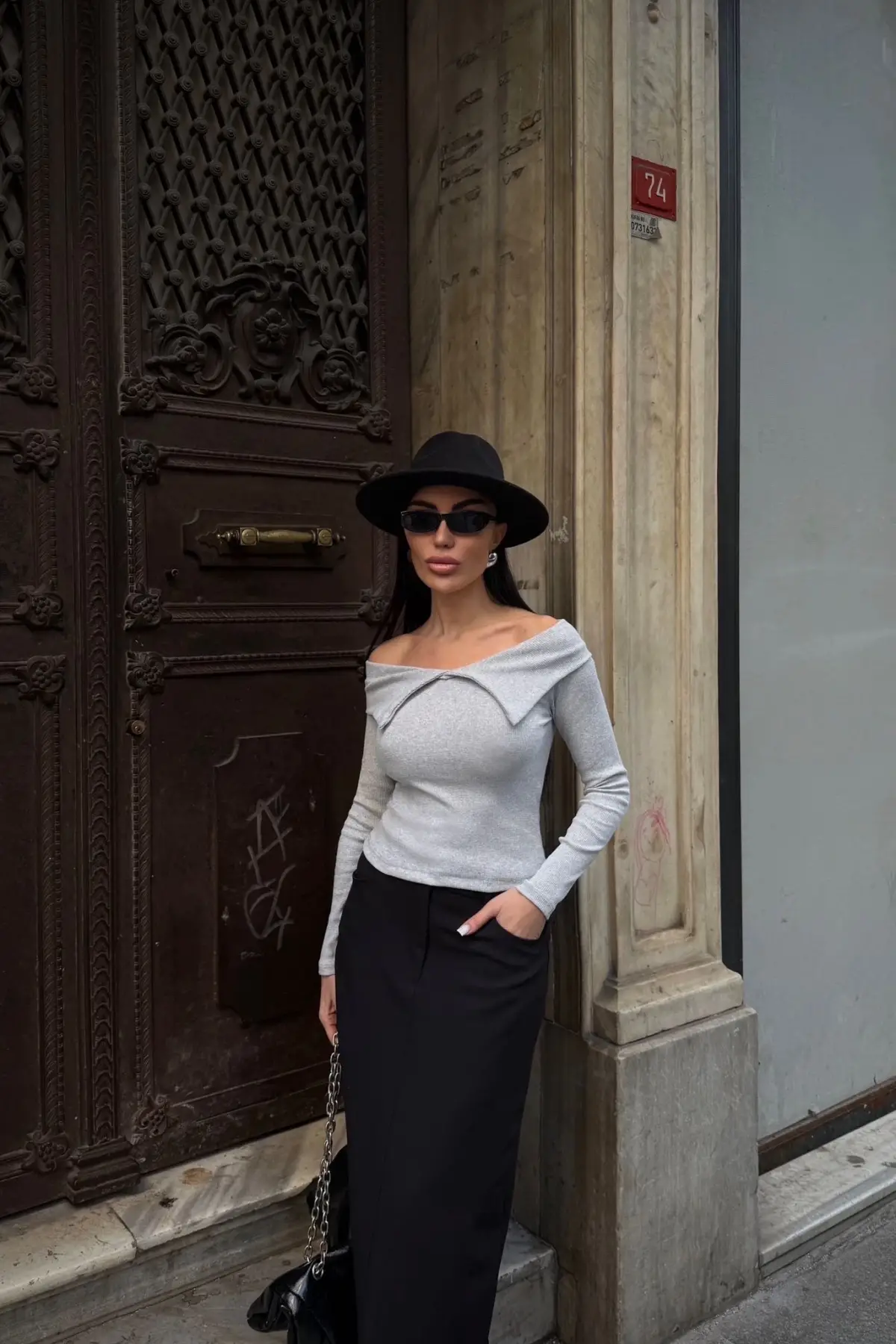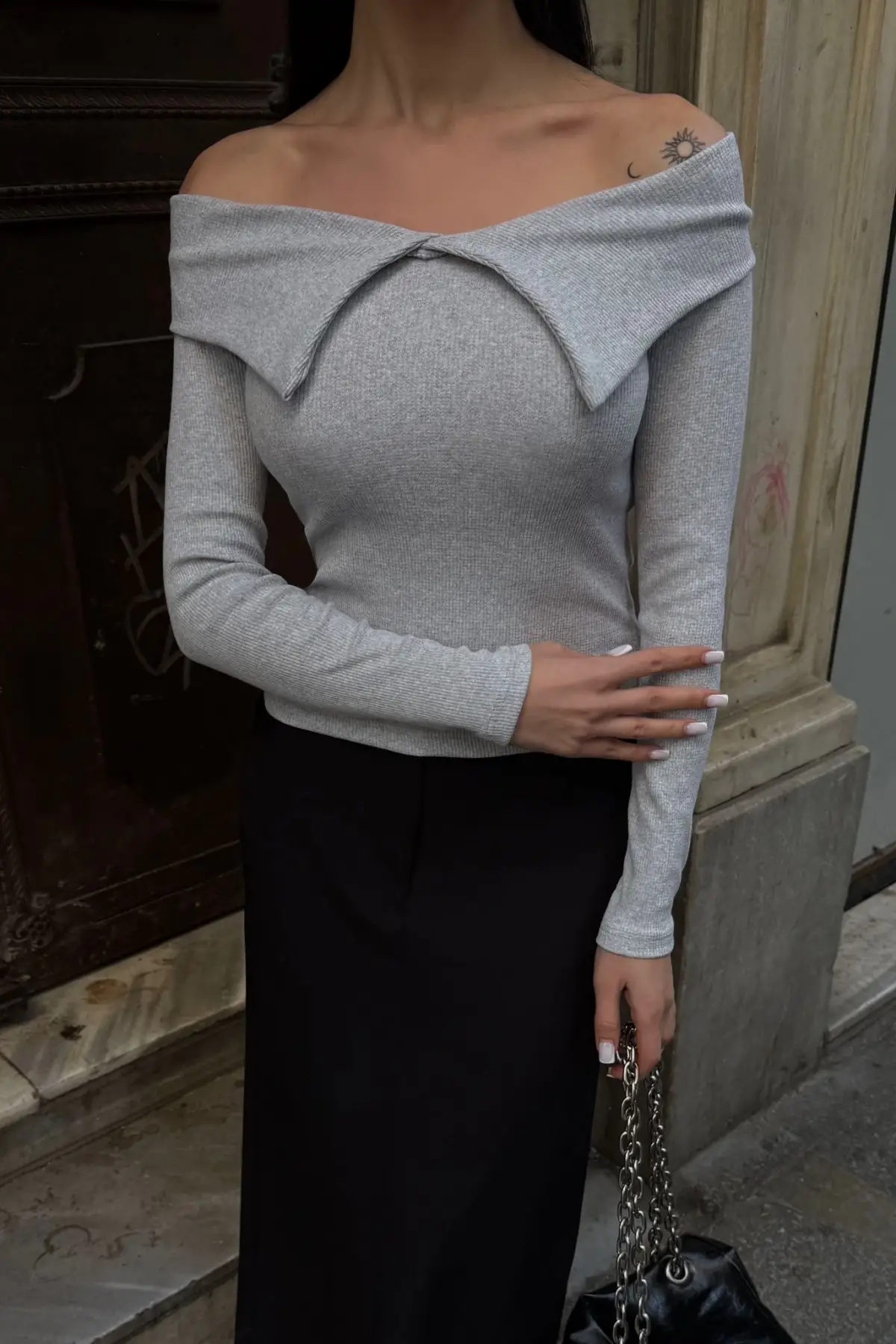 Çerçeve Yaka Kaşkorse Bluz Gri