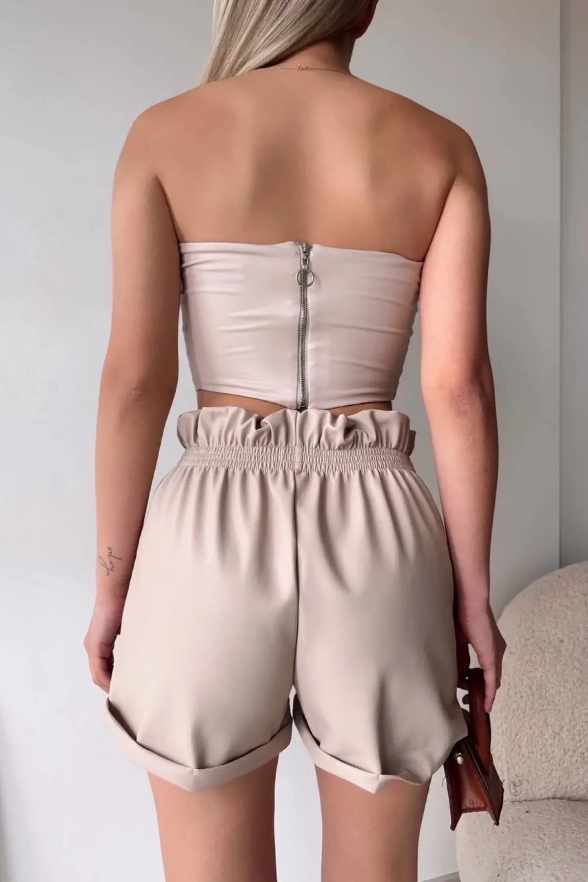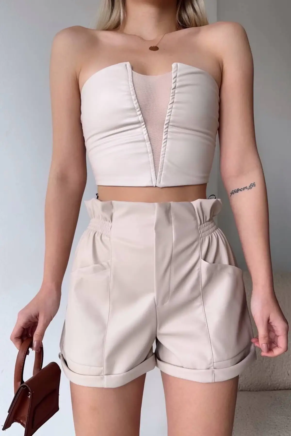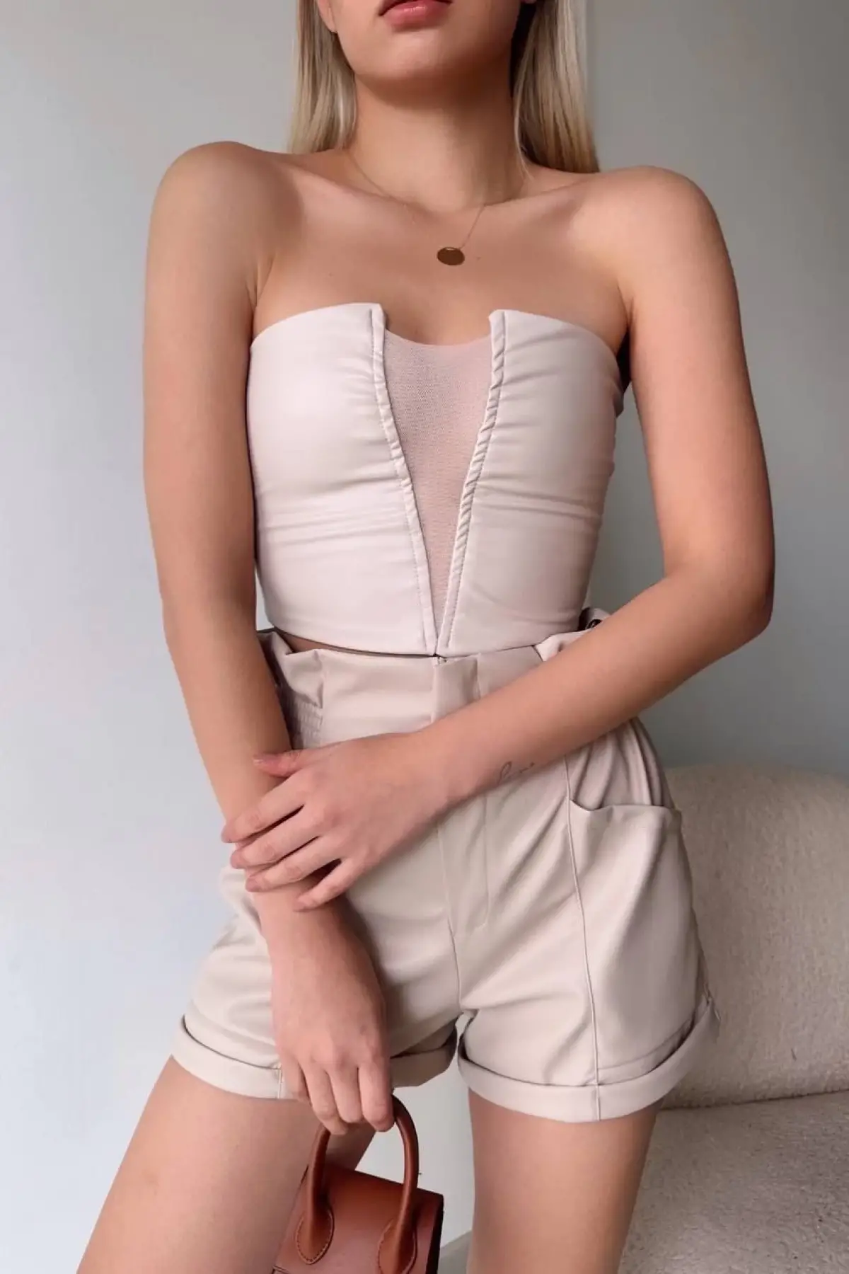 Arkadan Büzgülü Esnek Büstiyer Bej