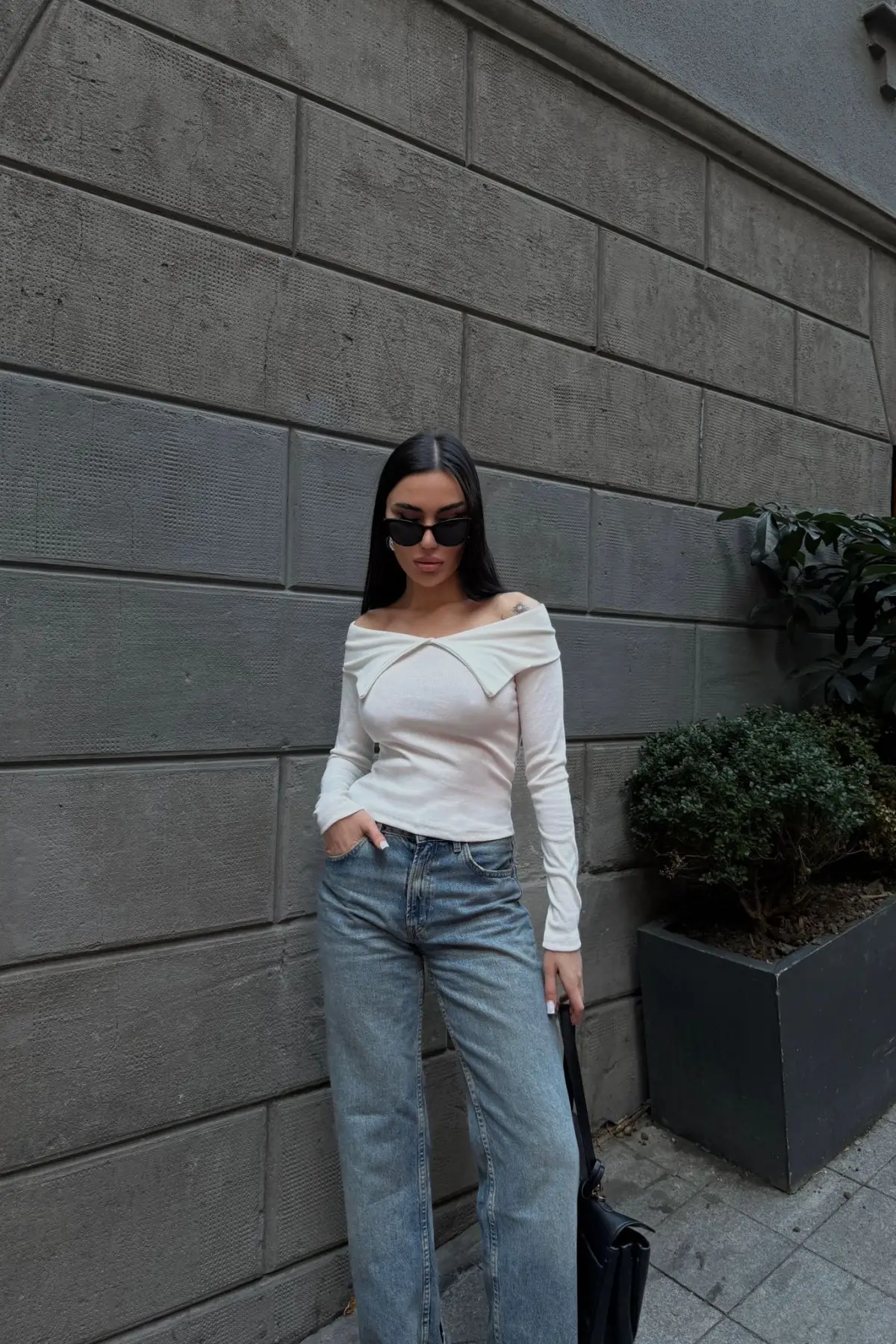 Uzun Kol Madonna Yaka Bluz Beyaz