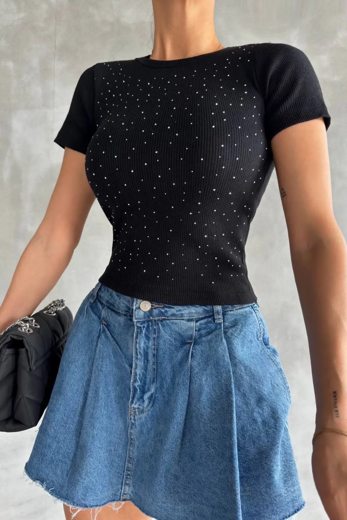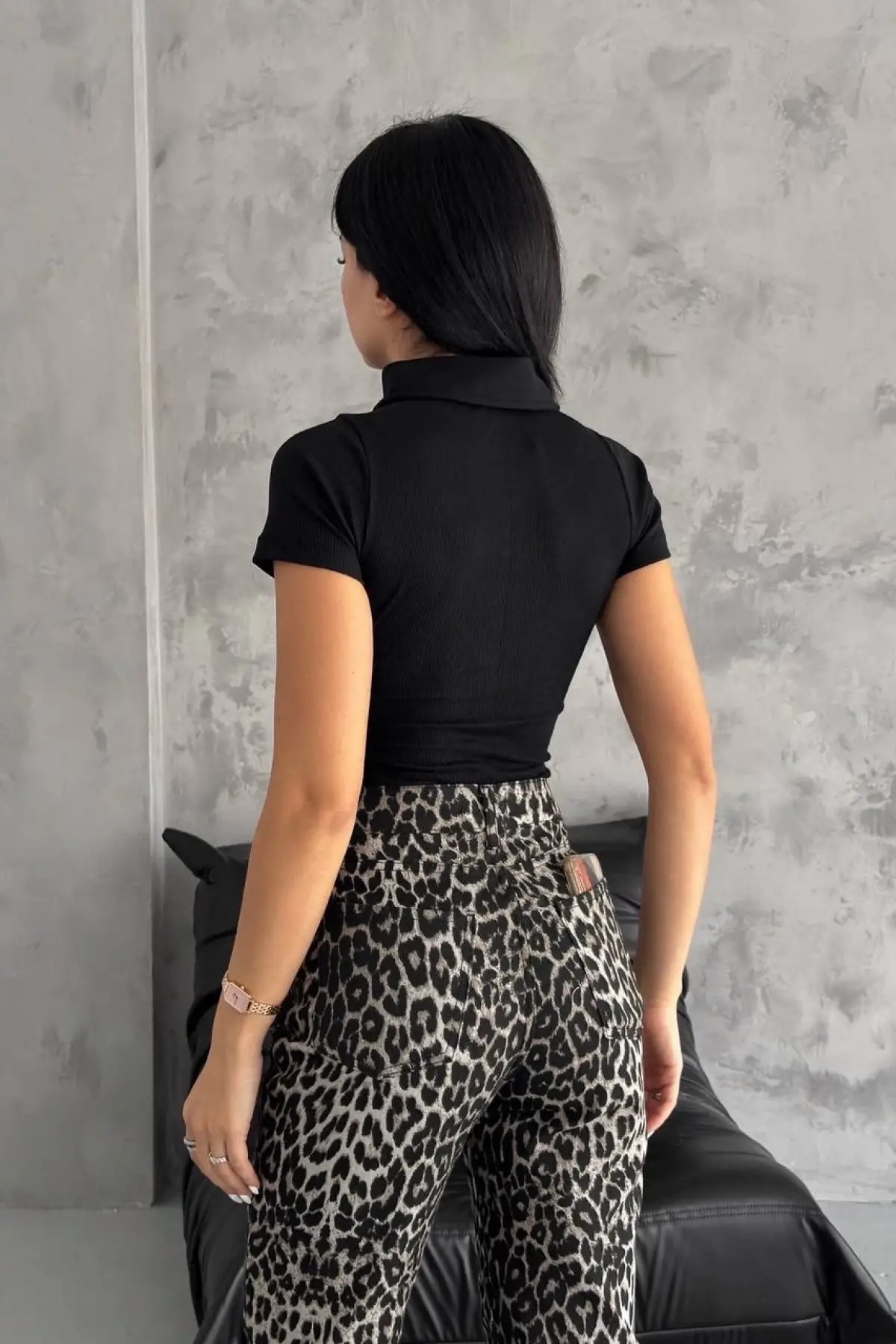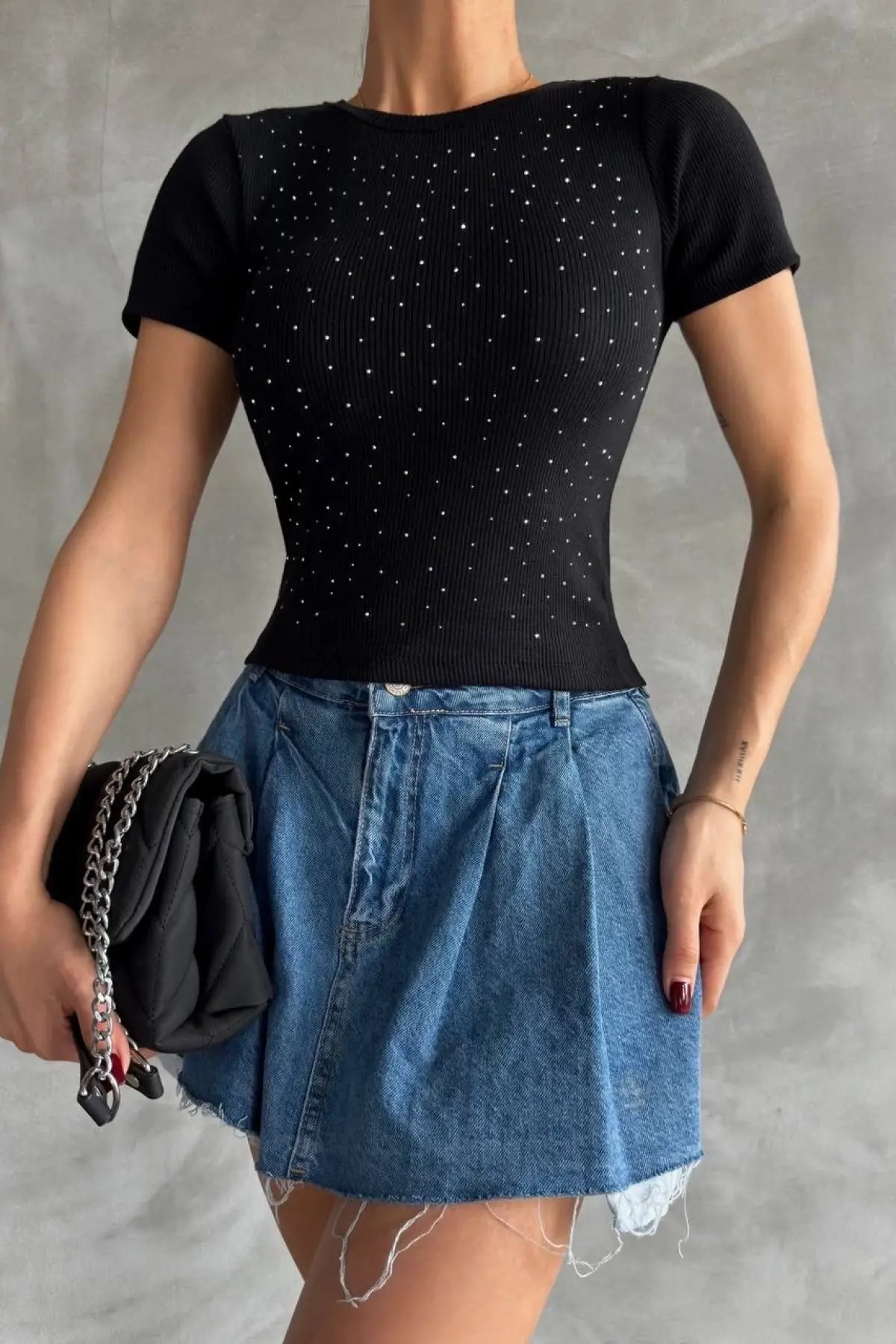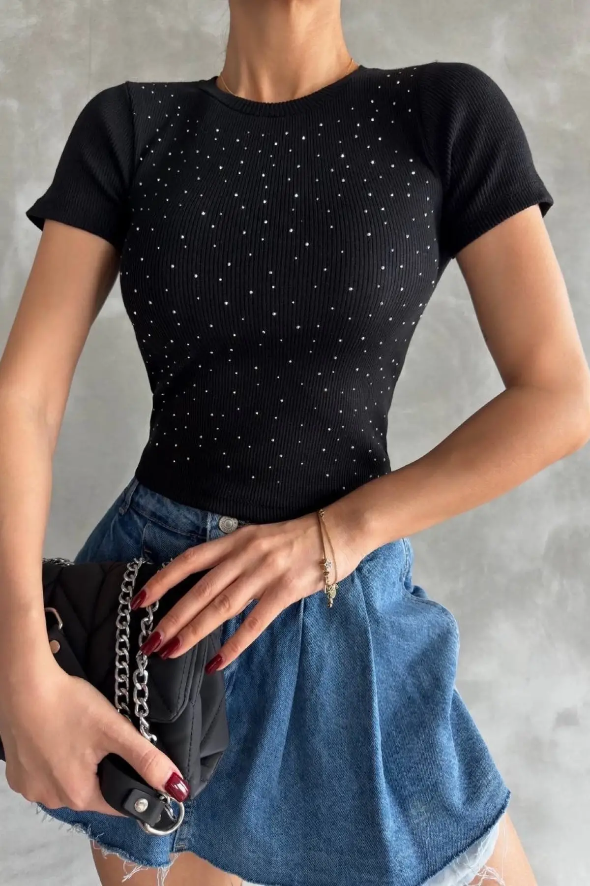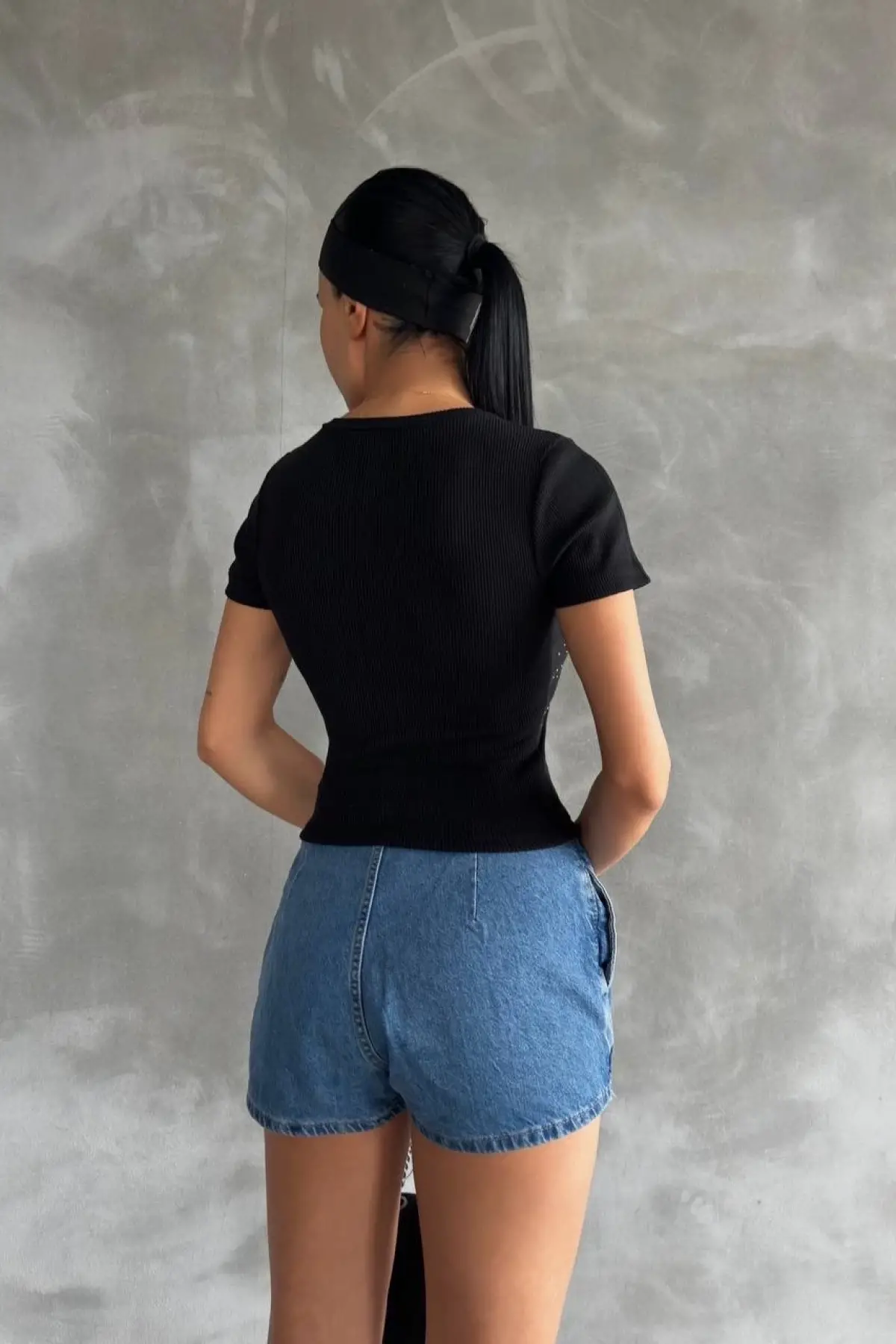 Kadın Siyah Bisiklet Yaka Gold Düğmeli Ottoman Bluz