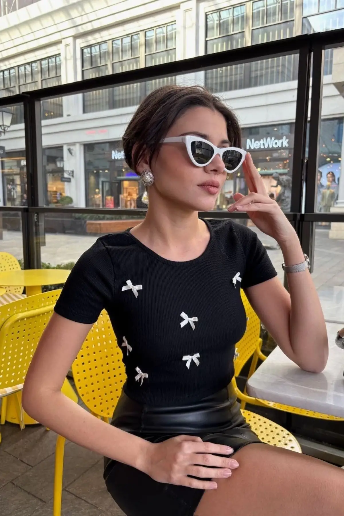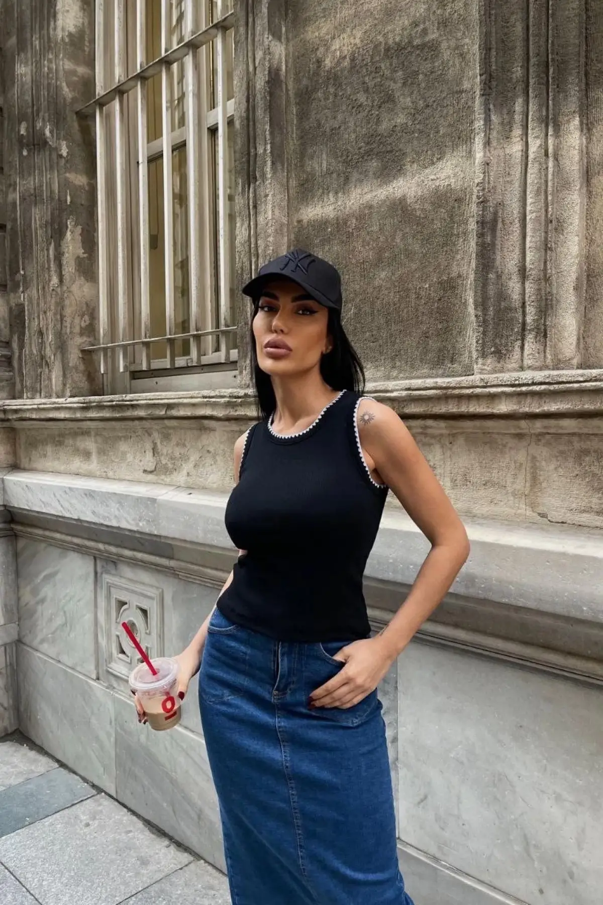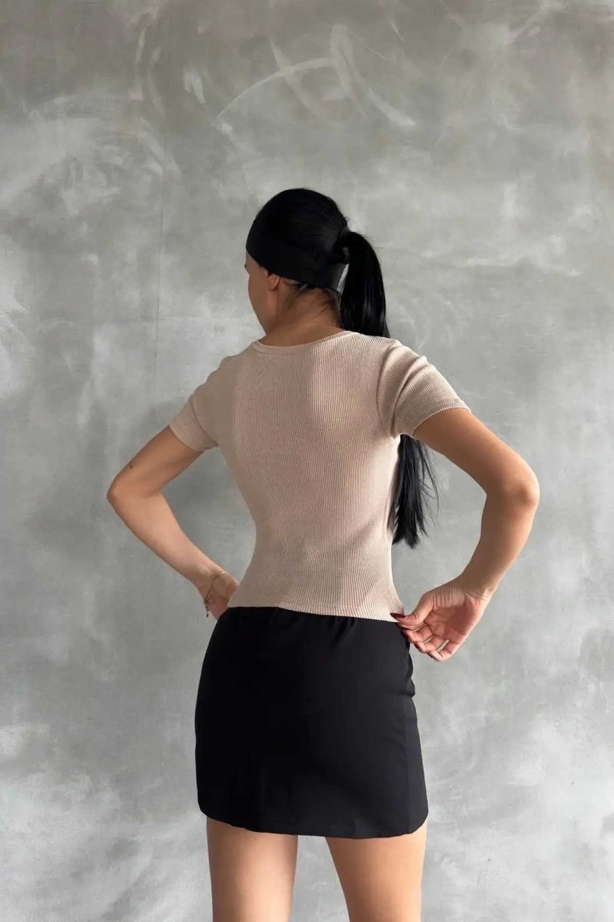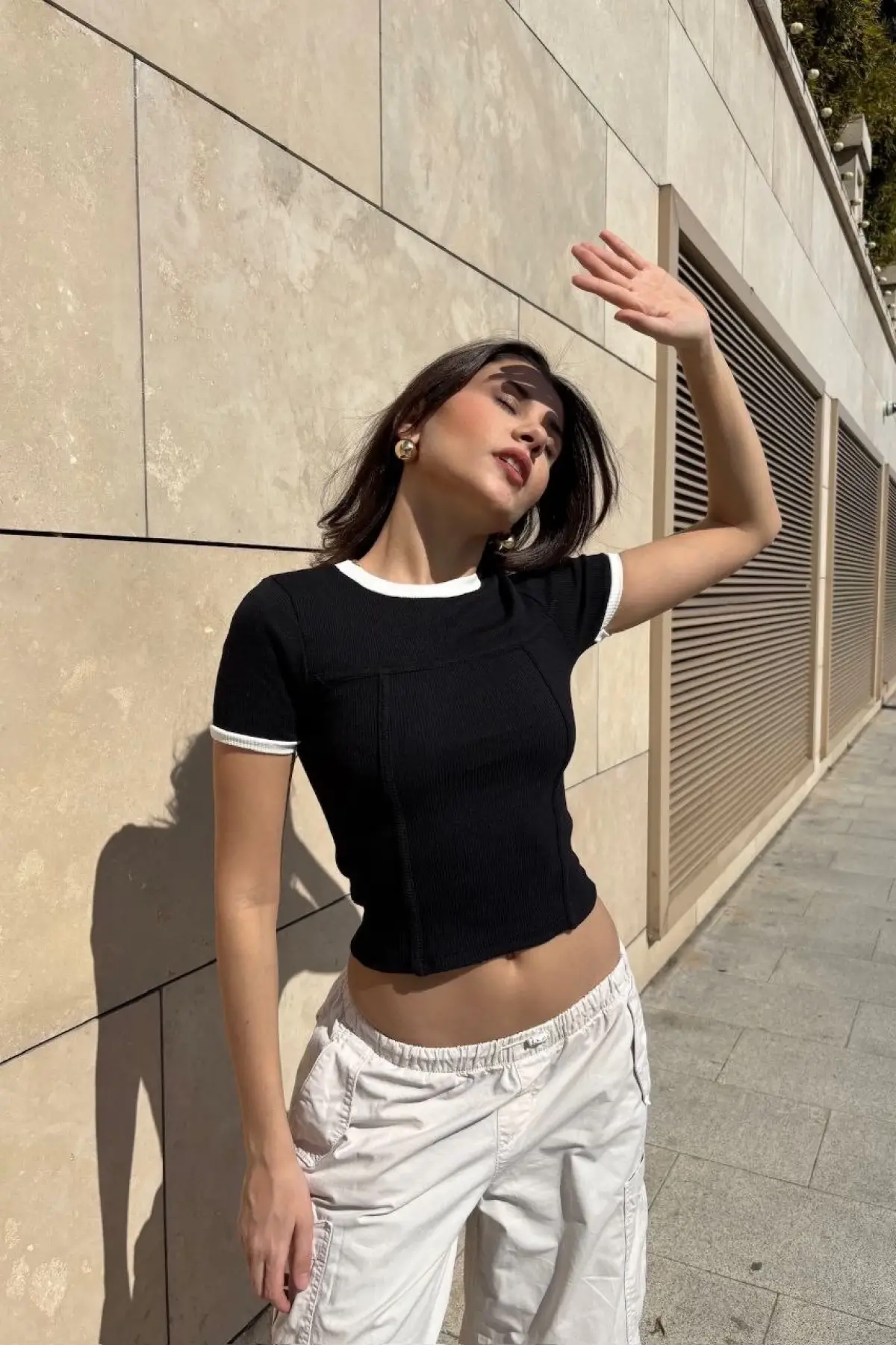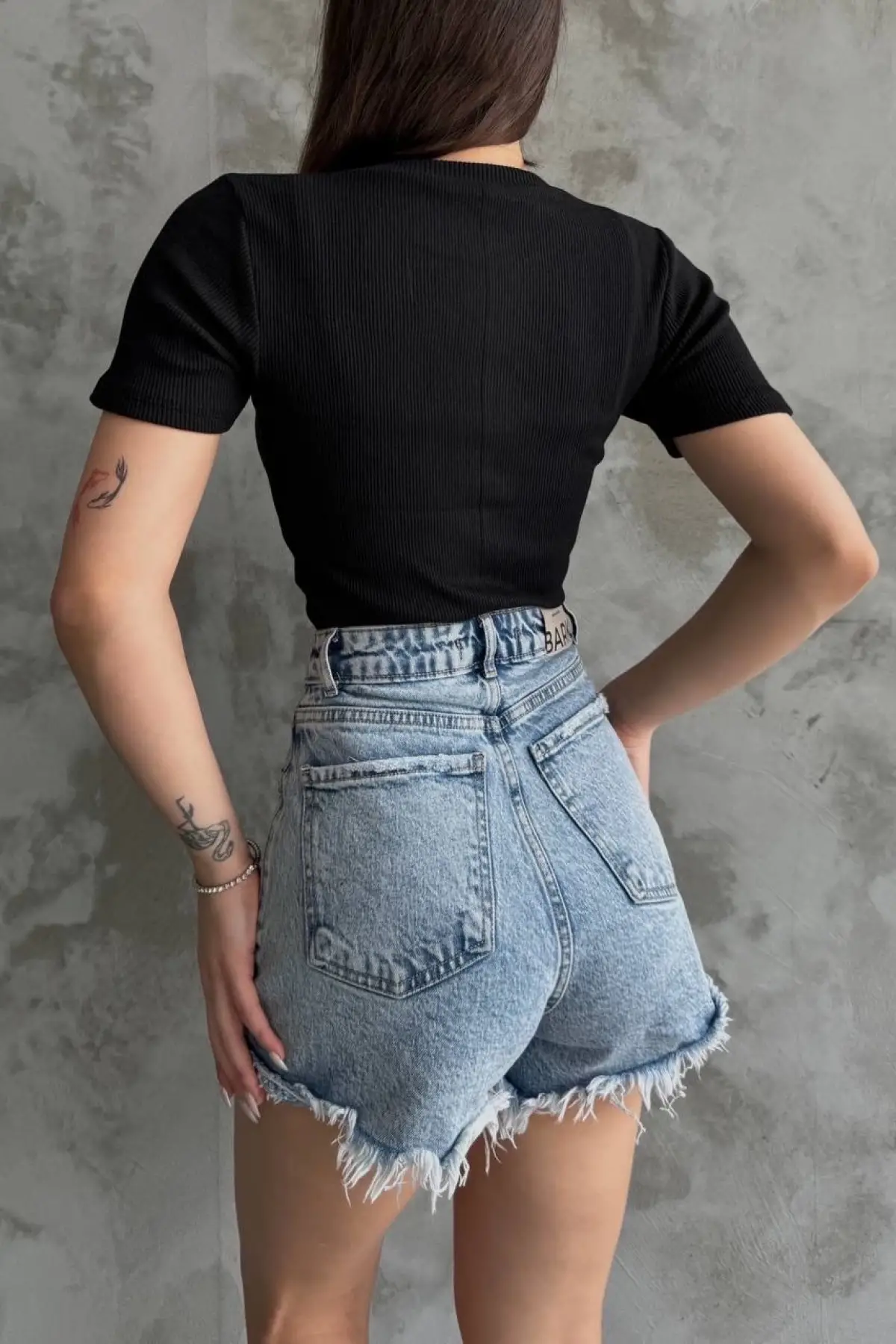 Kadın Siyah Bisiklet Yaka Gold Düğmeli Ottoman Bluz