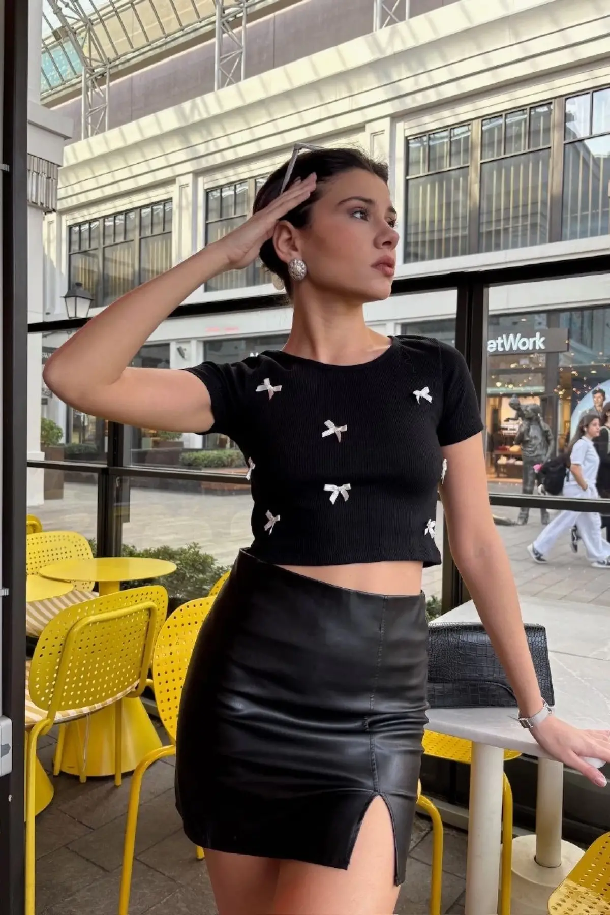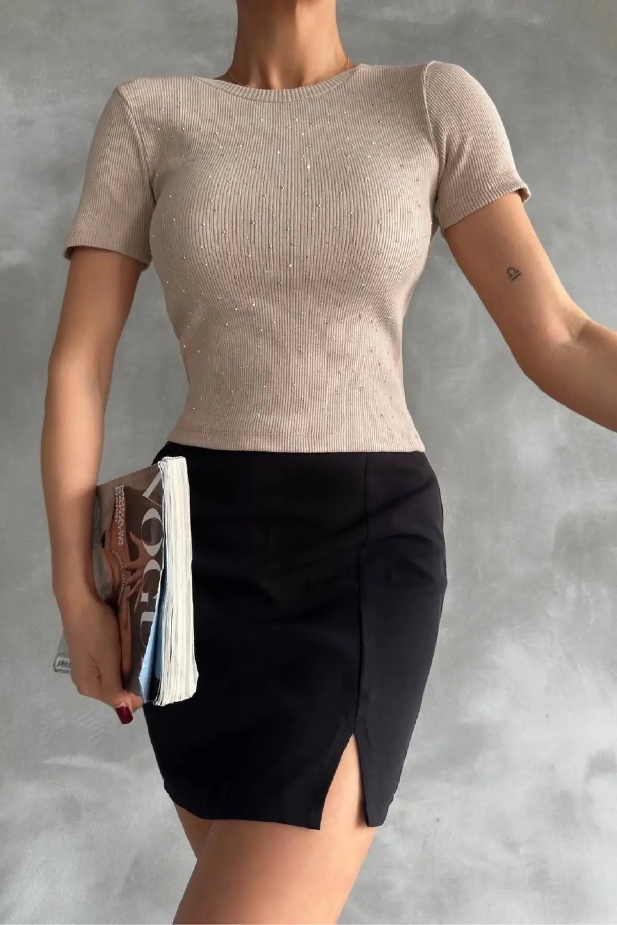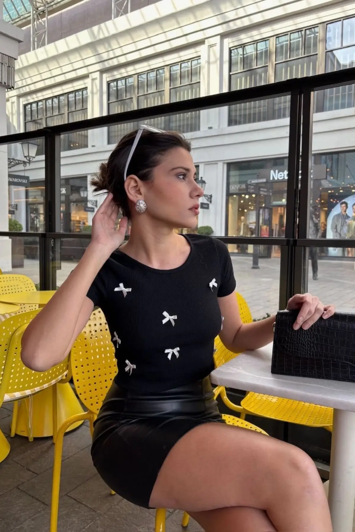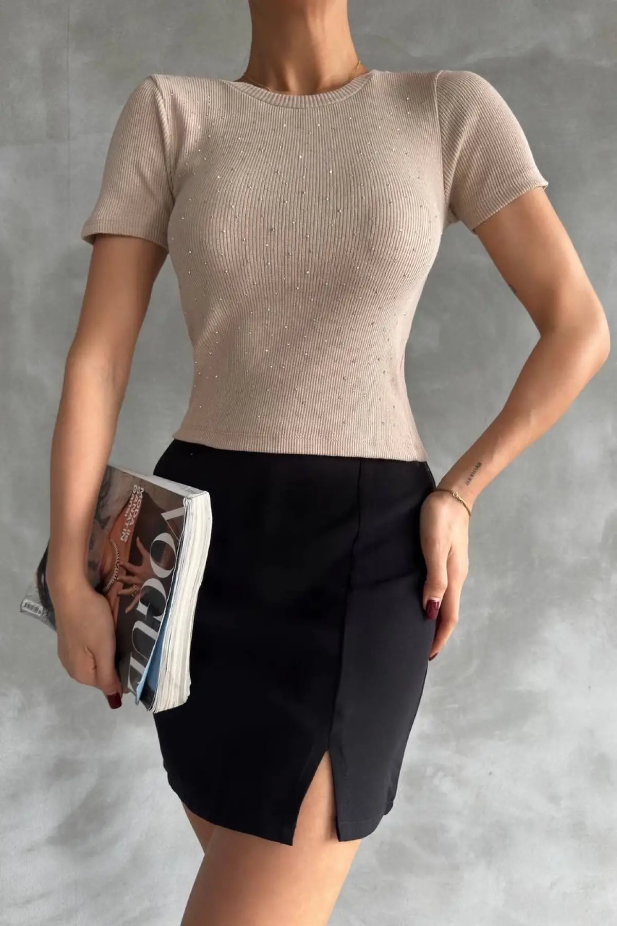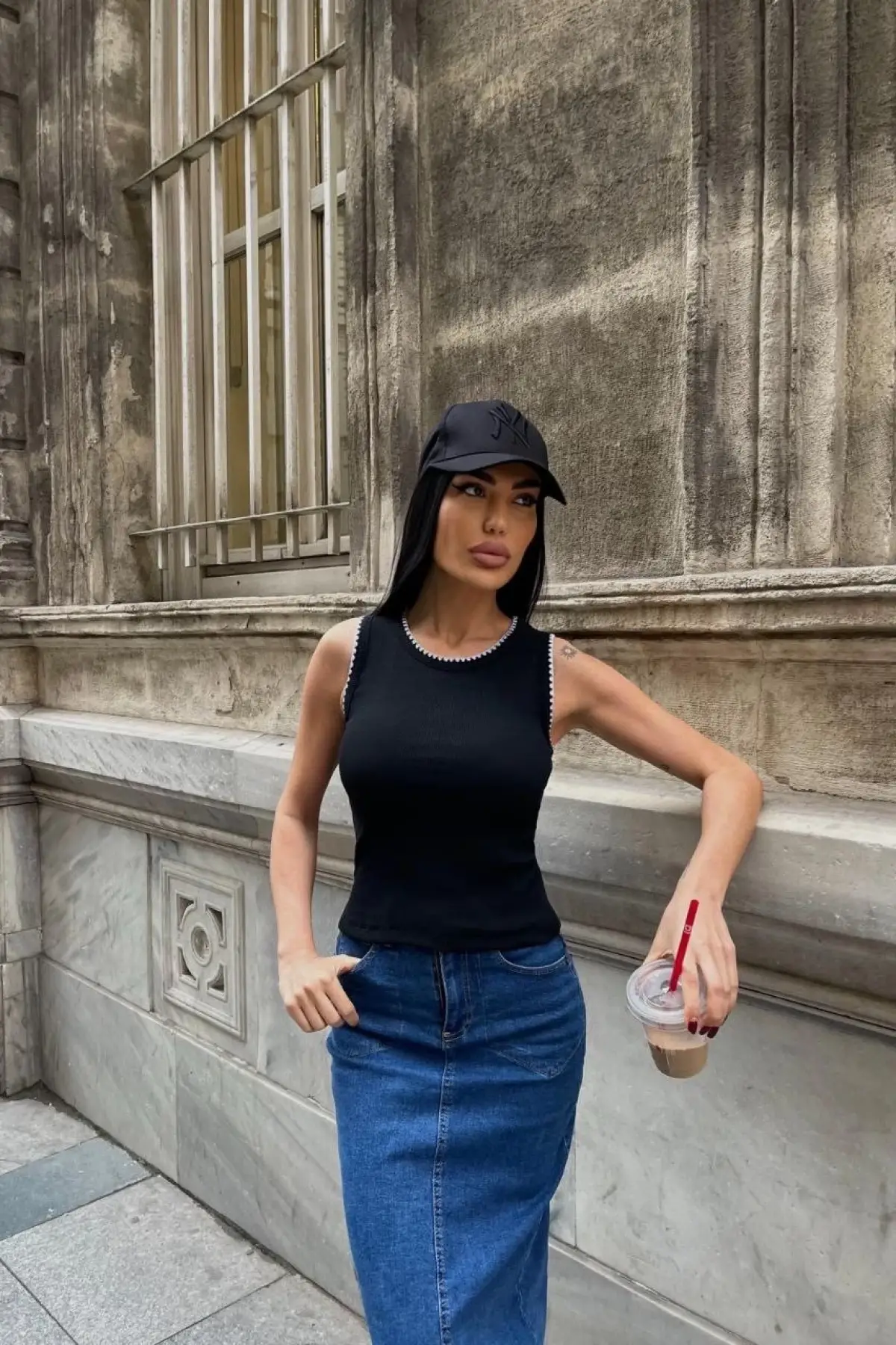 Kadın Siyah Bisiklet Yaka Gold Düğmeli Ottoman Bluz