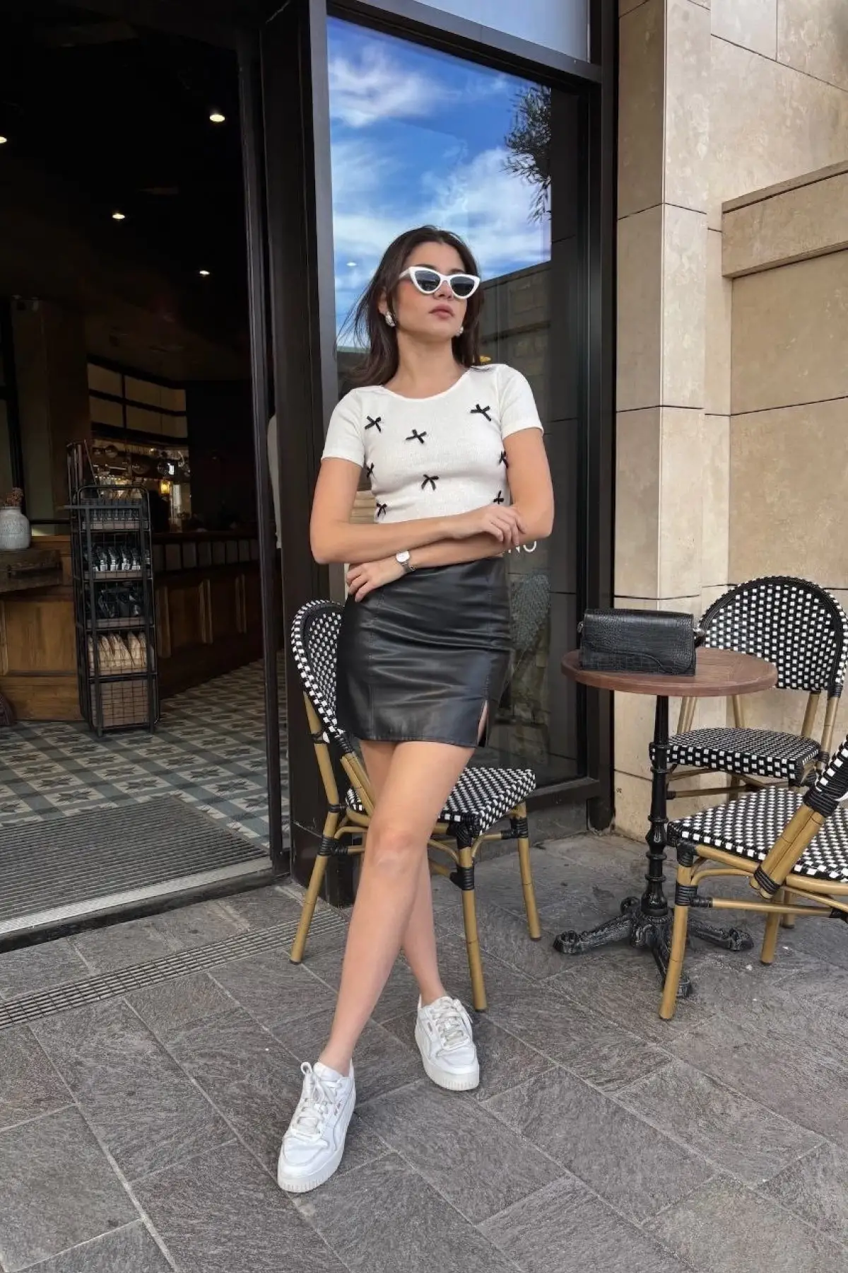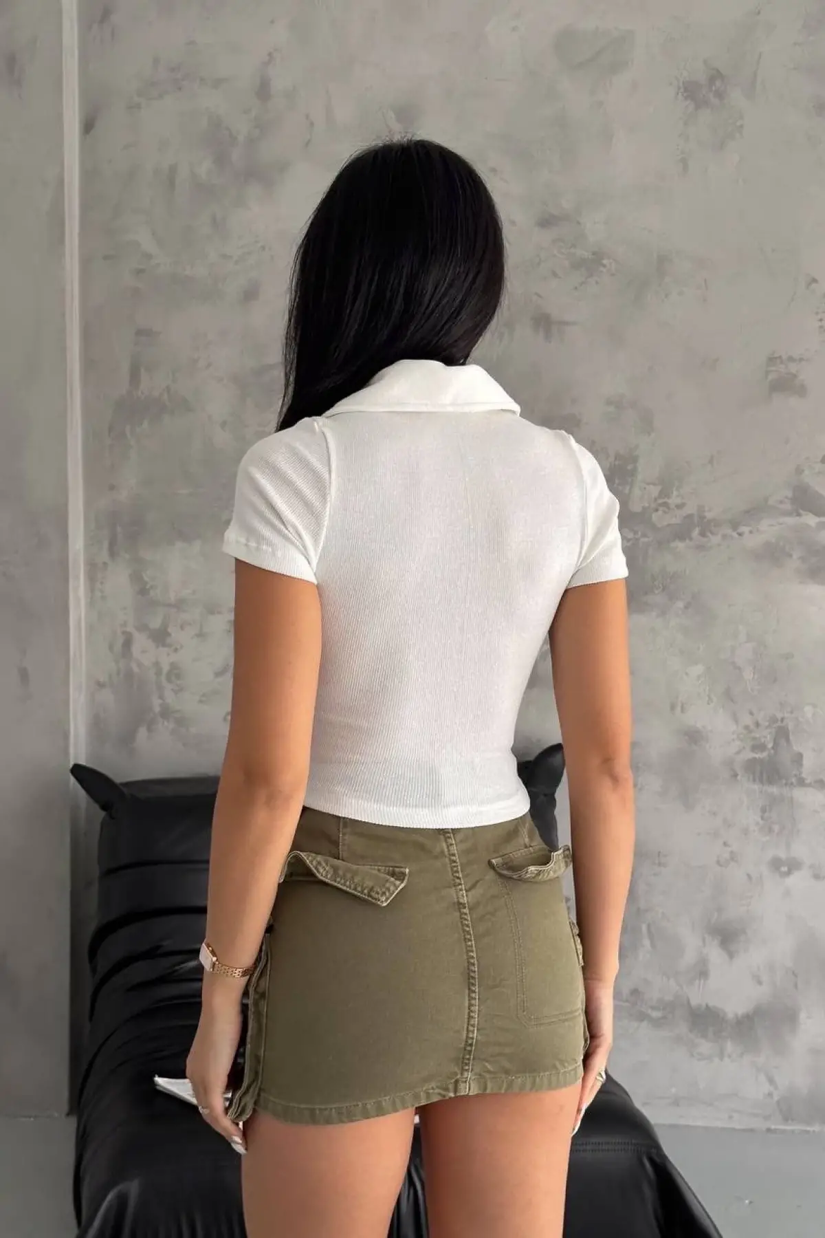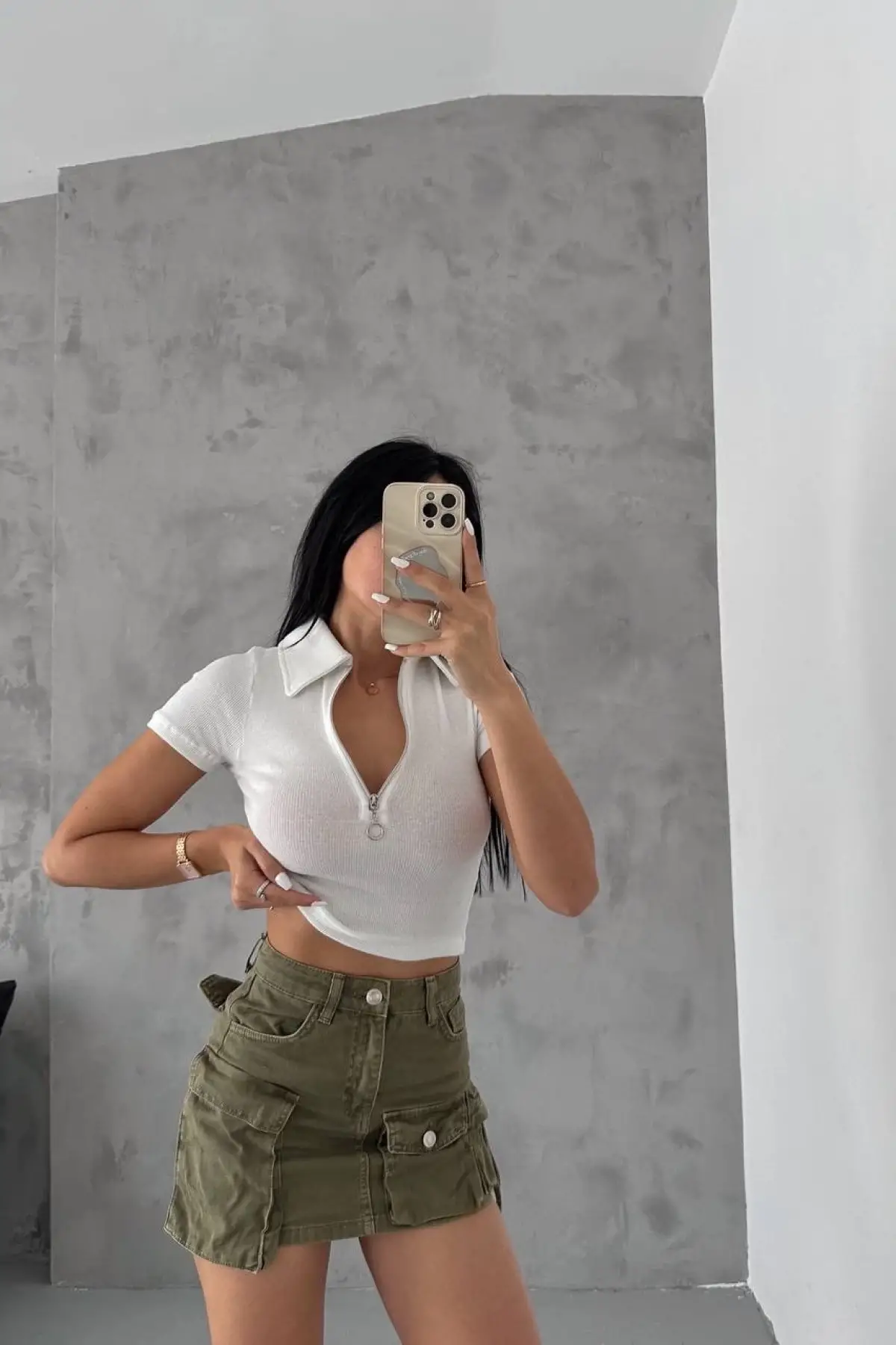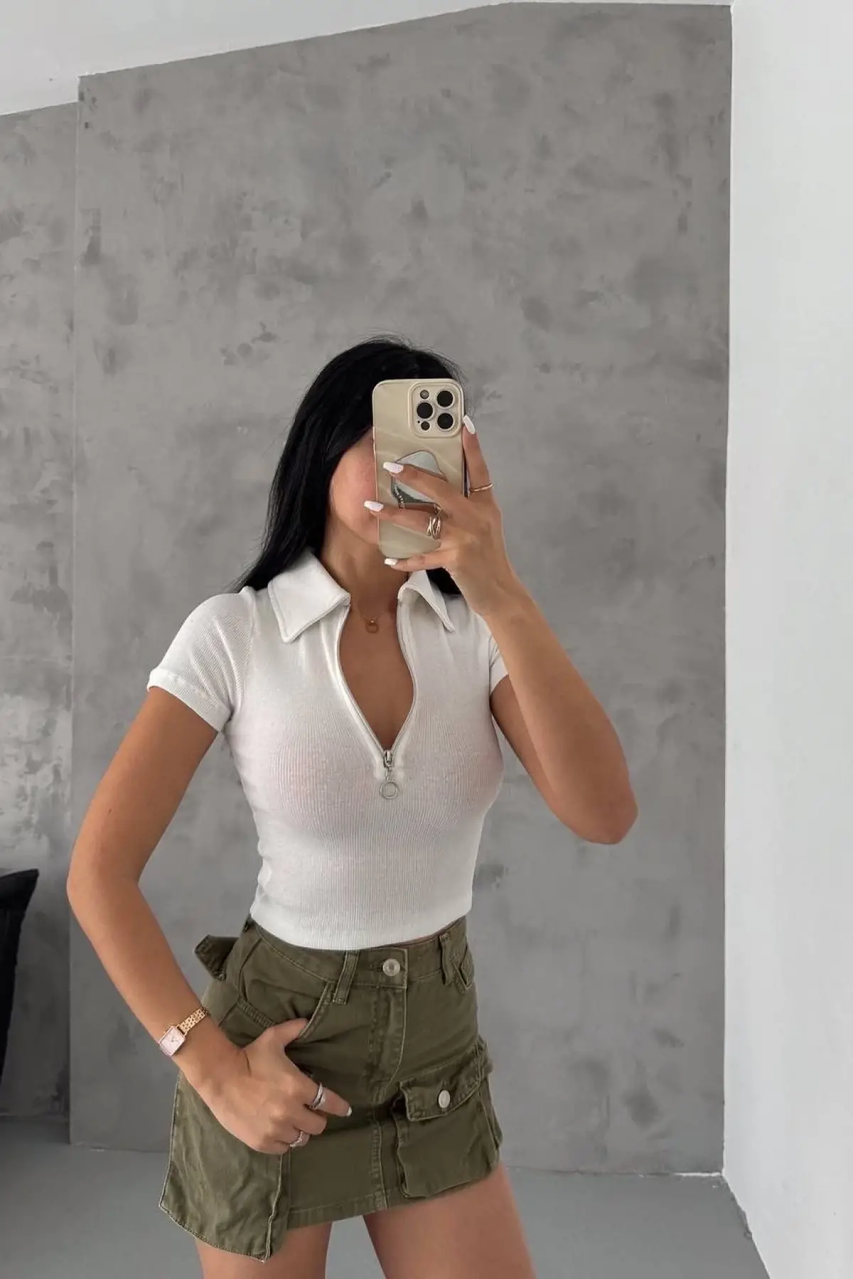 Kaşkorse Yaka Fermuarlı Bluz Beyaz
