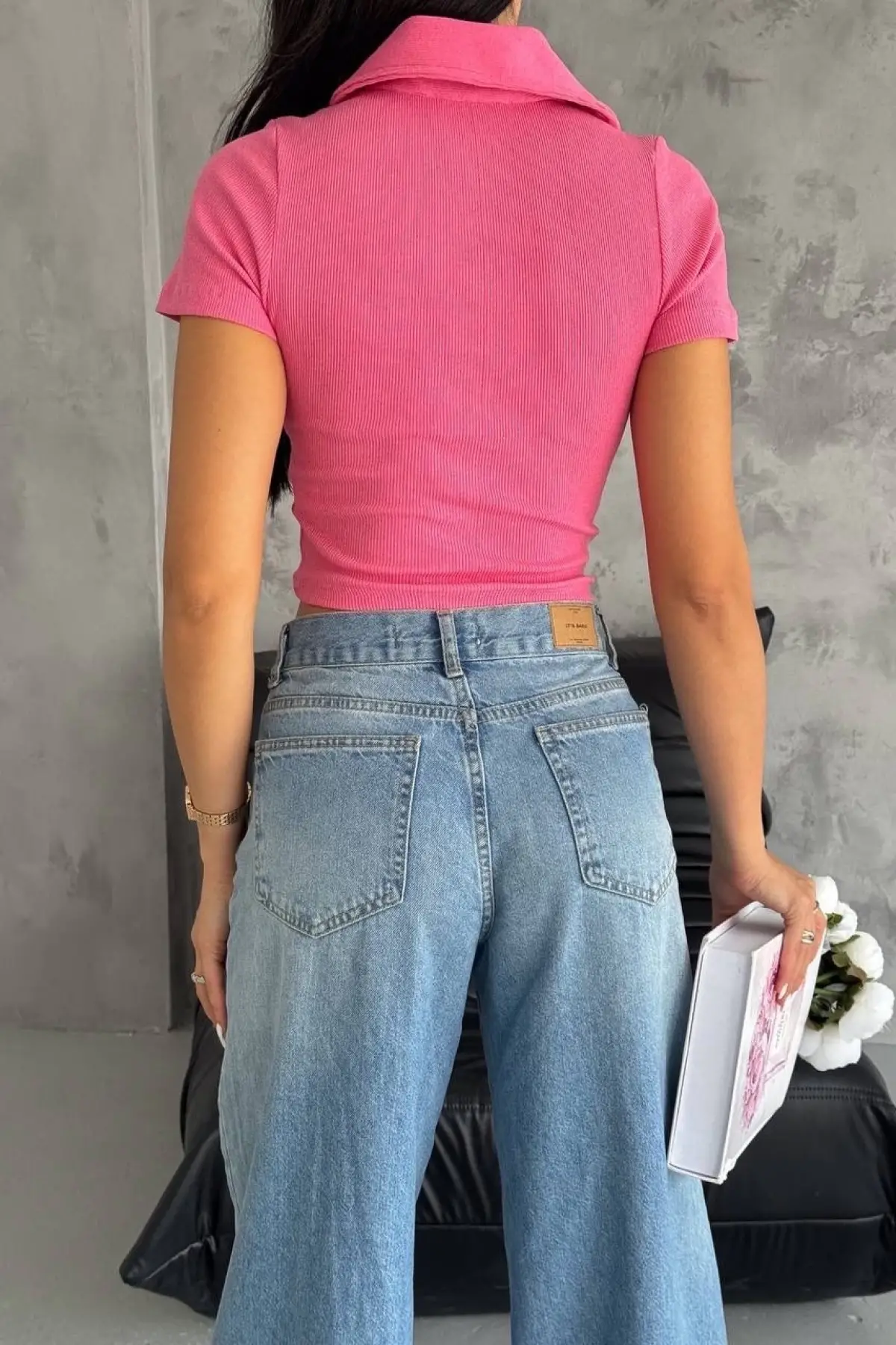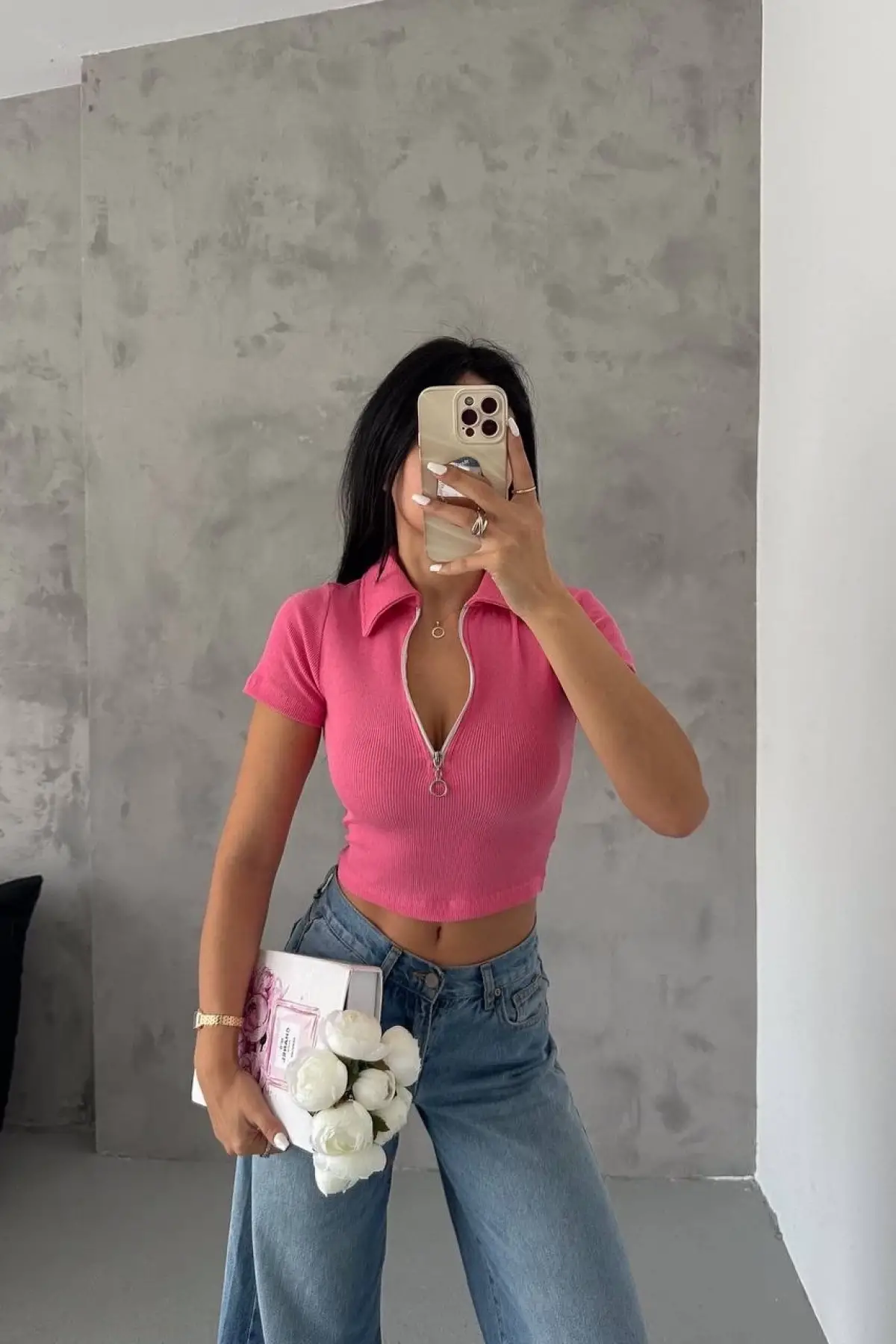 Kaşkorse Yaka Fermuarlı Bluz Fuşya
