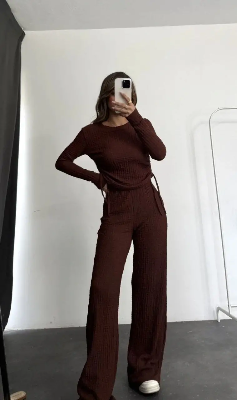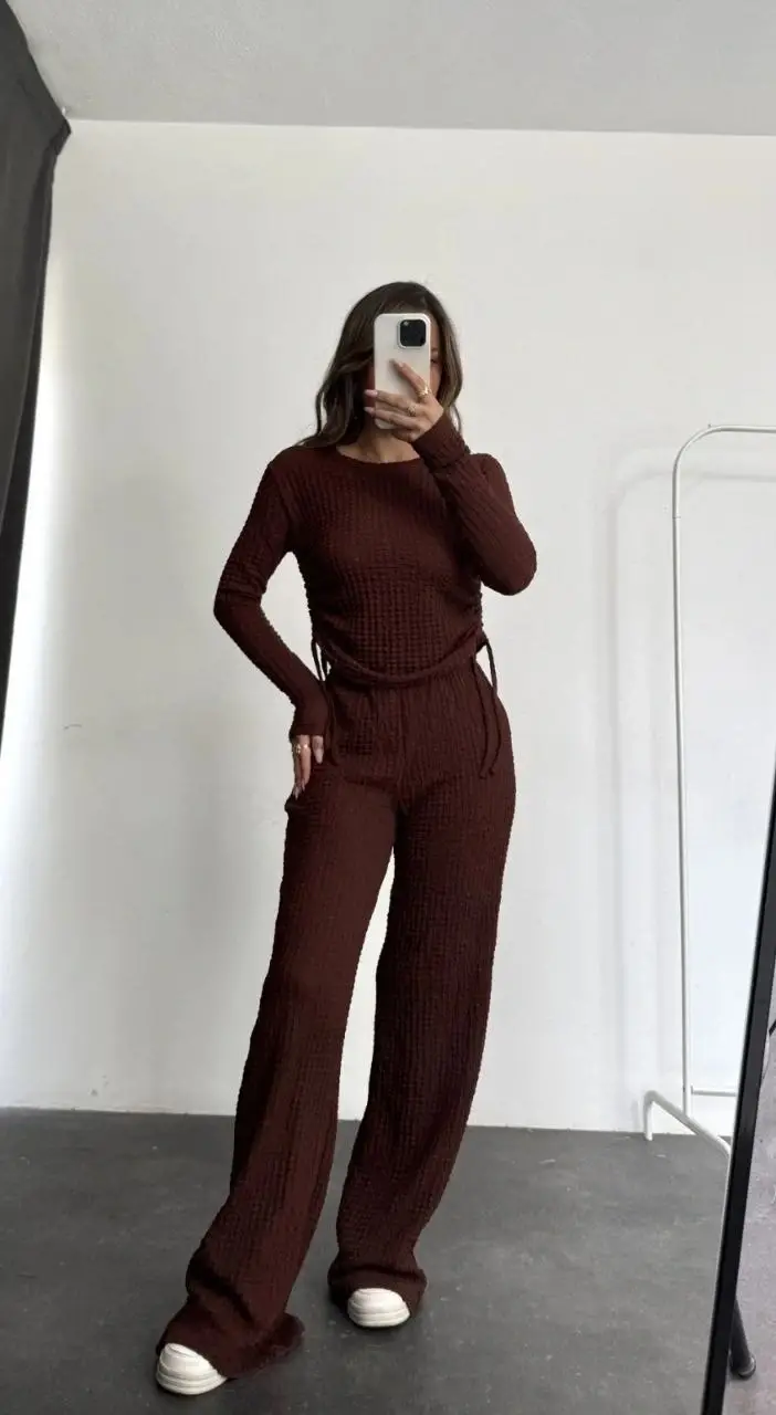 Bubble alt üst takım kahve rengiyle gardırobunuzdaki favori parçalarınızdan biri olmaya aday. Şıklık ve rahatlığı bir arada arayan kadınların tercihi.