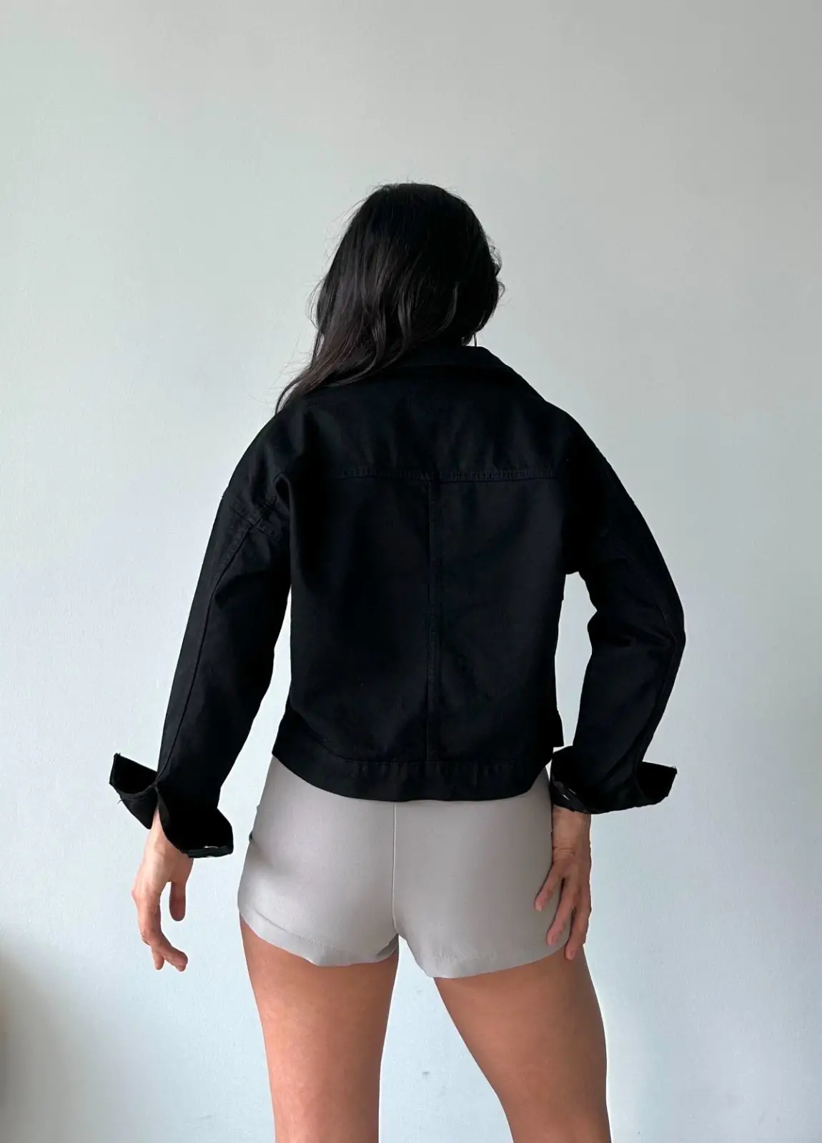 D2000 markalı çift cepli süper taş enzim yıkama crop ceket siyah, gardırobunuzun vazgeçilmezi olmaya aday!