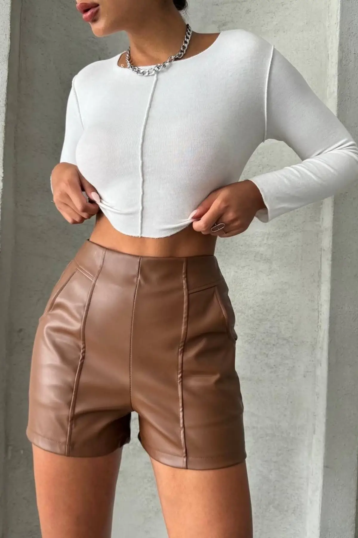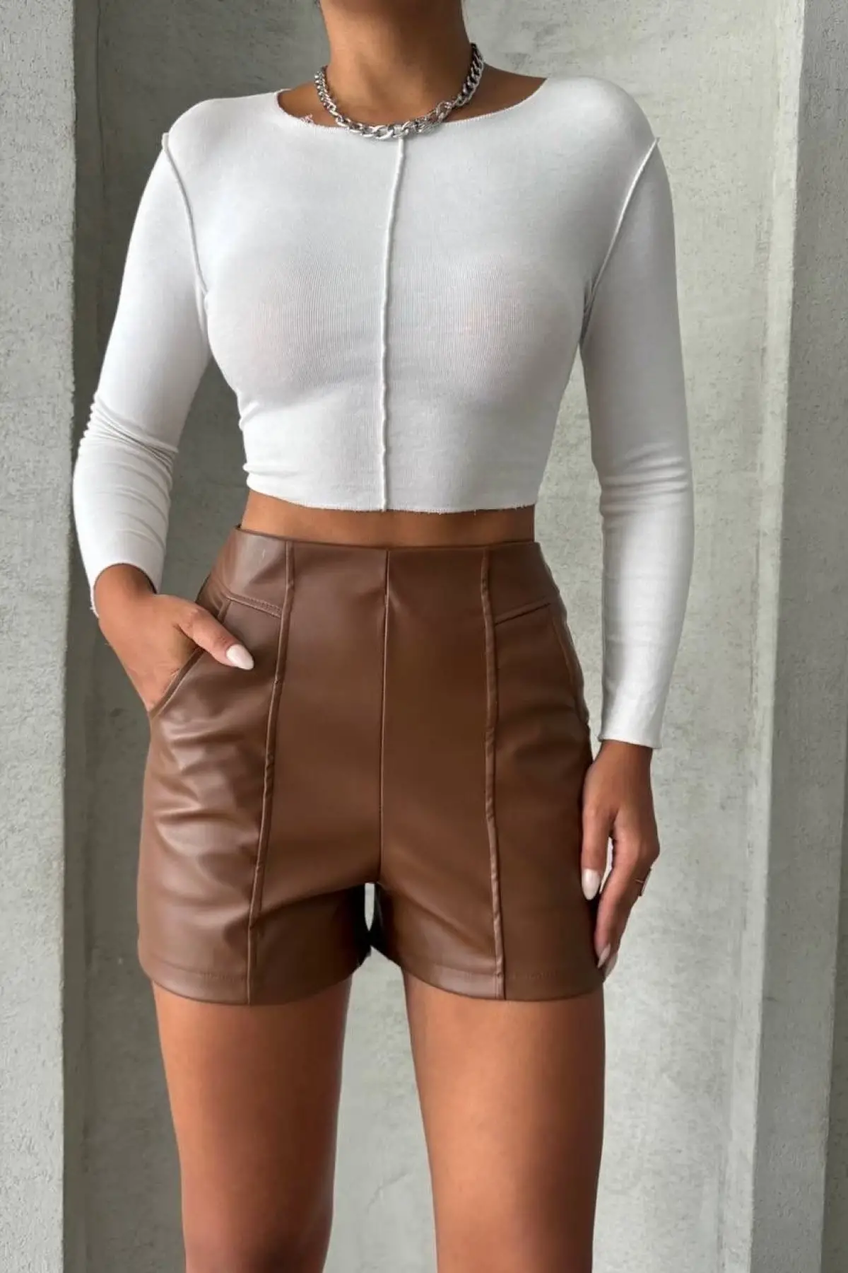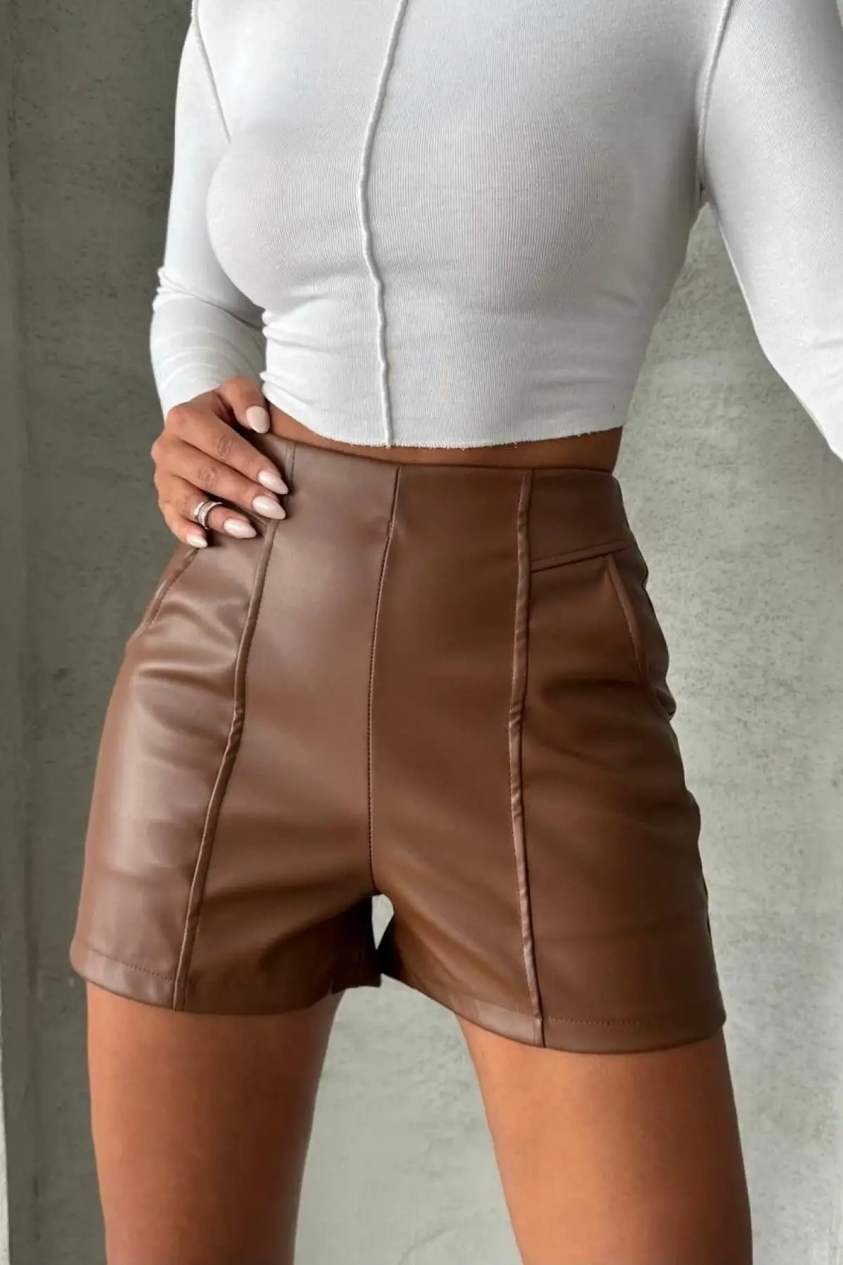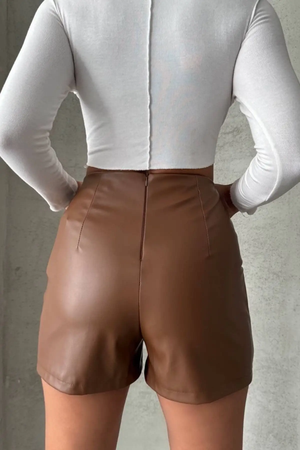 Çift fermuar detaylarıyla şıklığı ve rahatlığı bir arada sunan Kahve Deri Şort ile tarzınızı yansıtın.