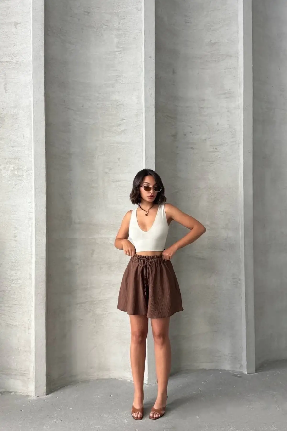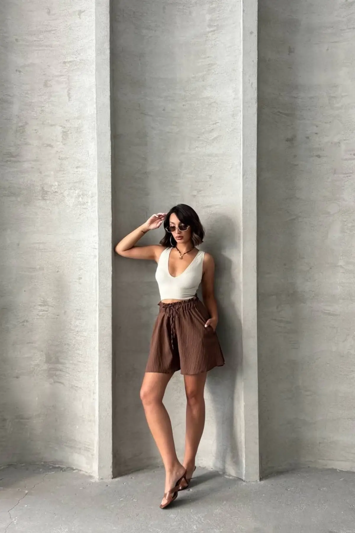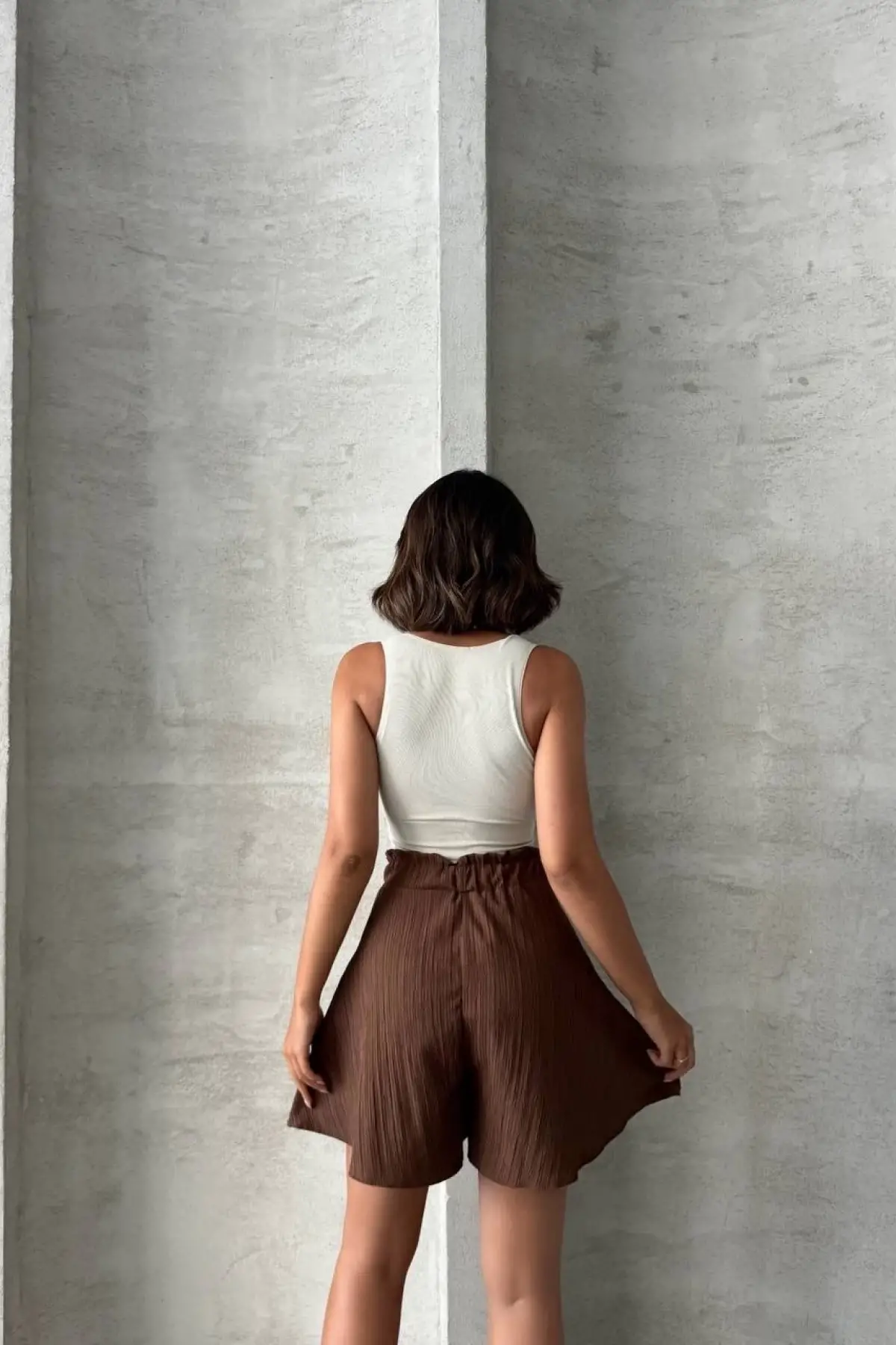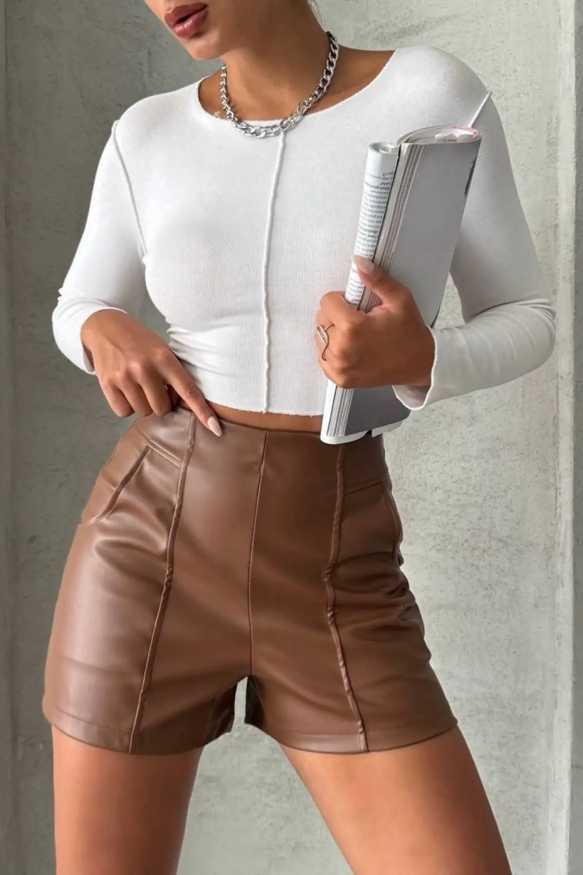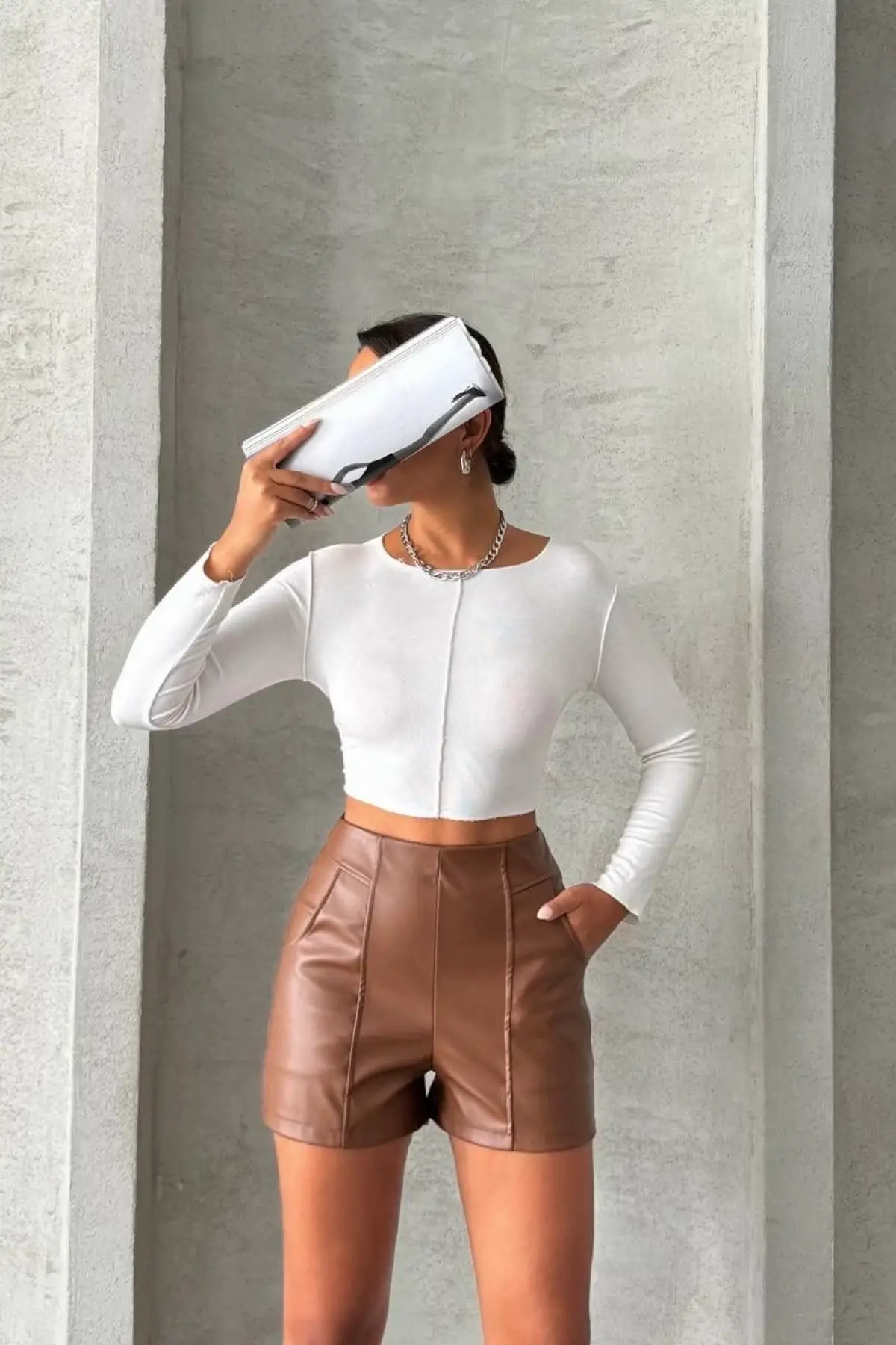Çift fermuar detaylarıyla şıklığı ve rahatlığı bir arada sunan Kahve Deri Şort ile tarzınızı yansıtın.