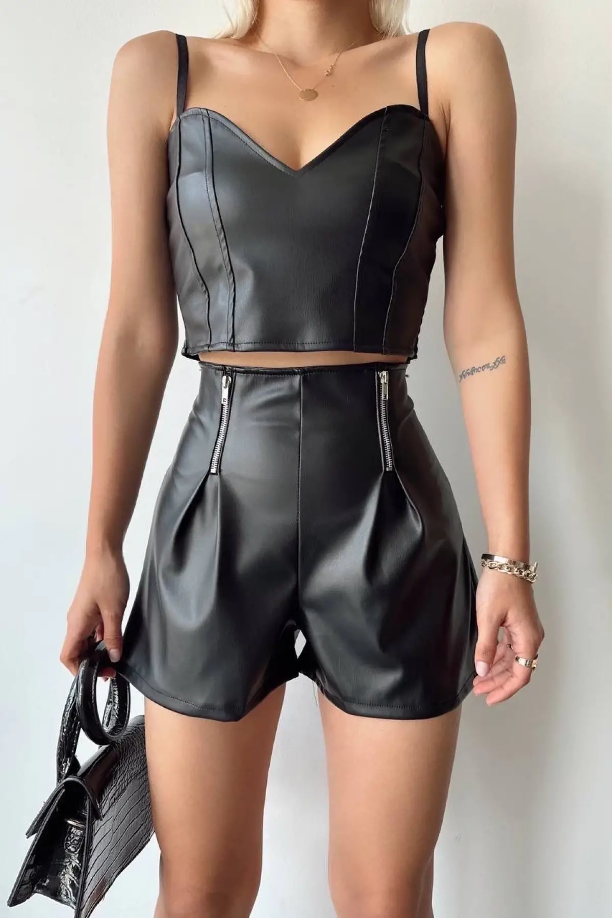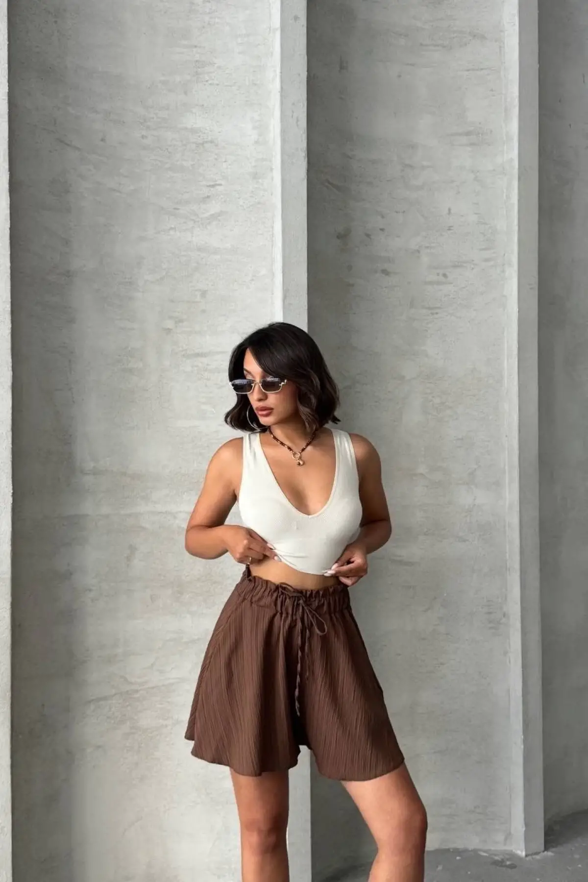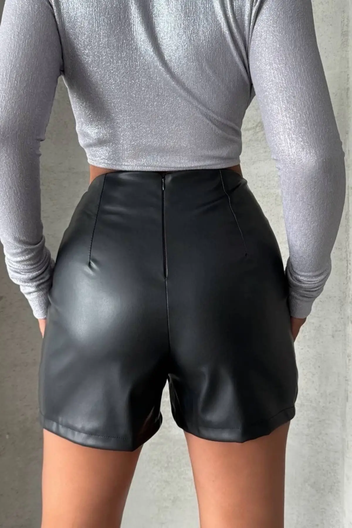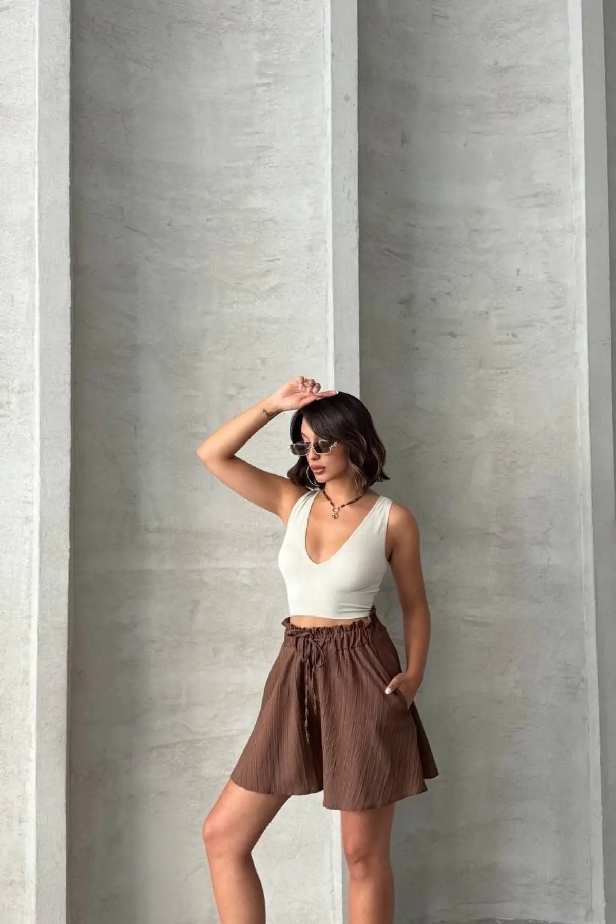 Çift fermuar detaylarıyla şıklığı ve rahatlığı bir arada sunan Kahve Deri Şort ile tarzınızı yansıtın.