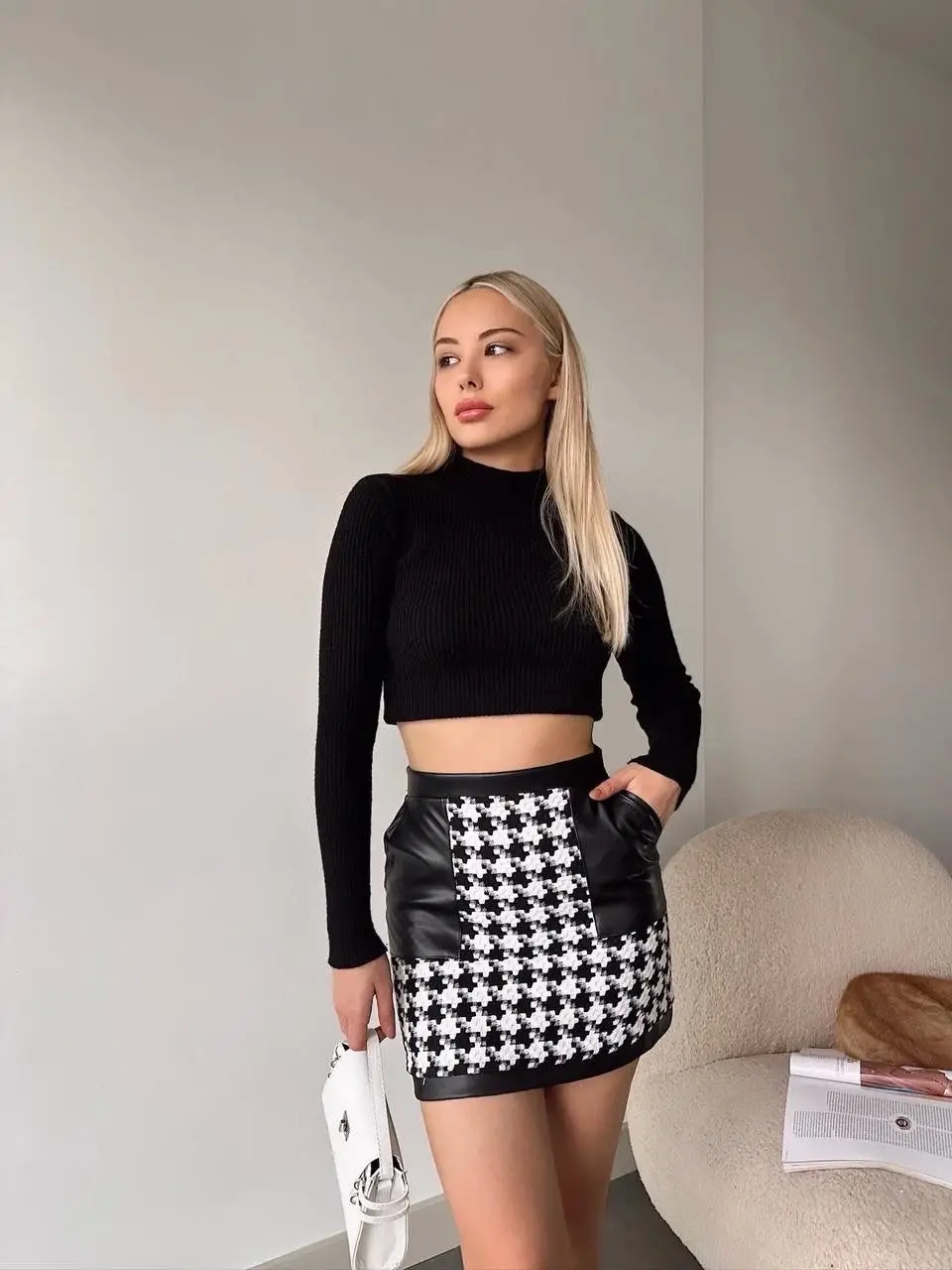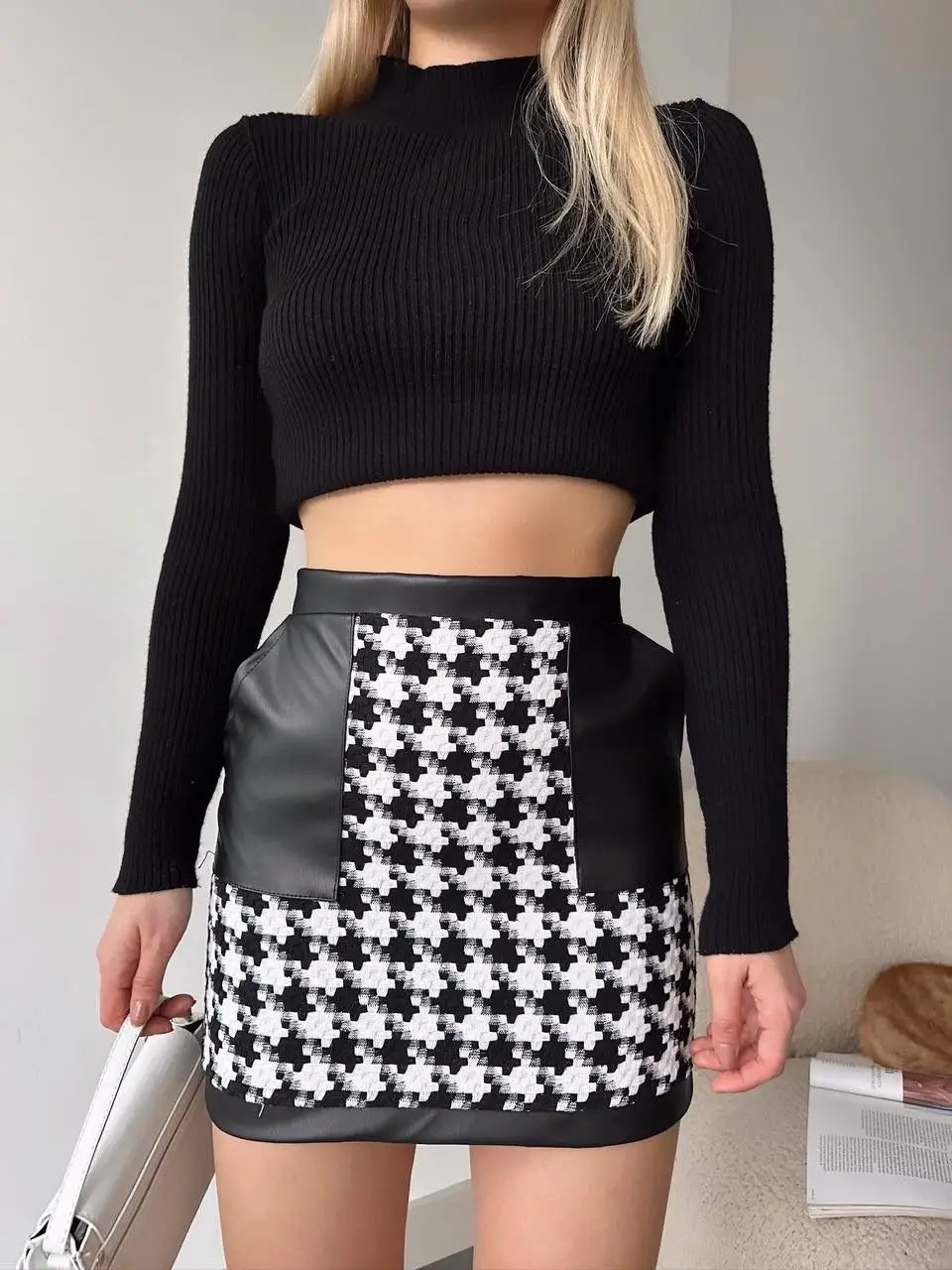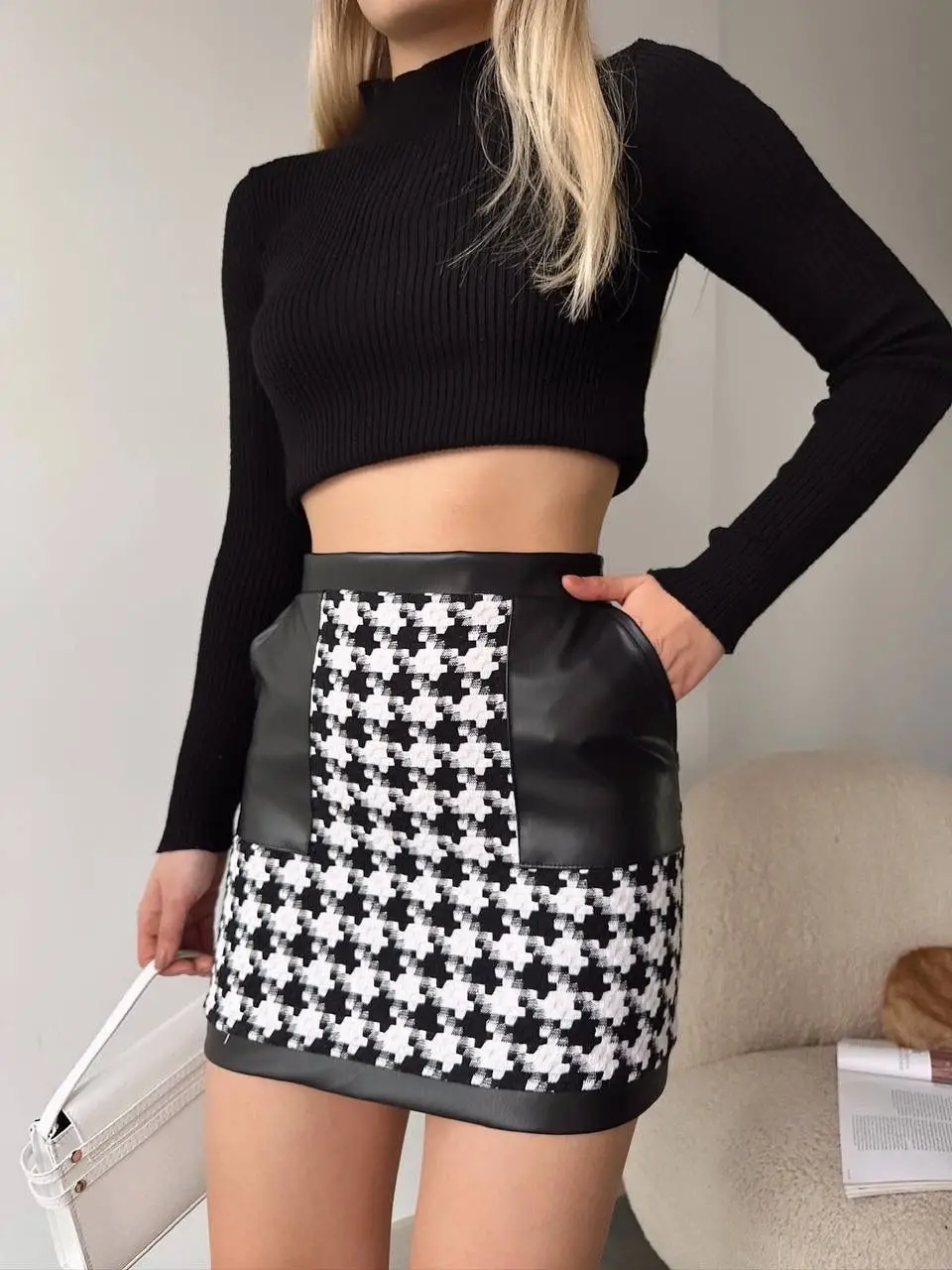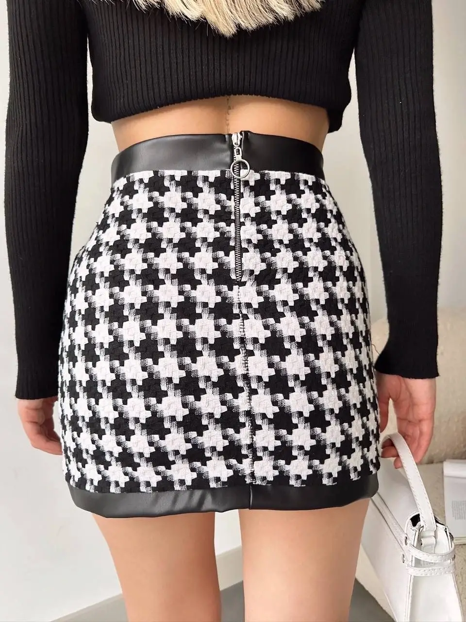 Deri garnili kaz ayağı desenli siyah eteğimiz, şıklığı ve rahatlığı bir arada sunar. Yüksek bel tasarımı ile vücudu saran kesimi, her bedene uyum sağlar. Günlük kullanıma uygun olan bu etek, farklı kombinasyonlarla hem spor hem de klasik tarzlarda kullanılabilir.