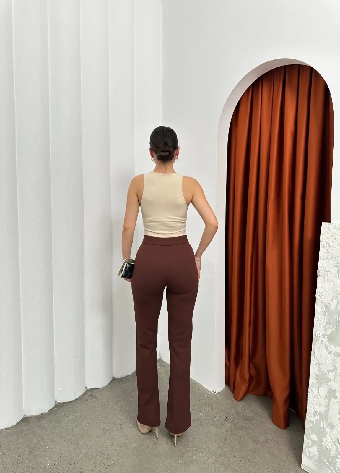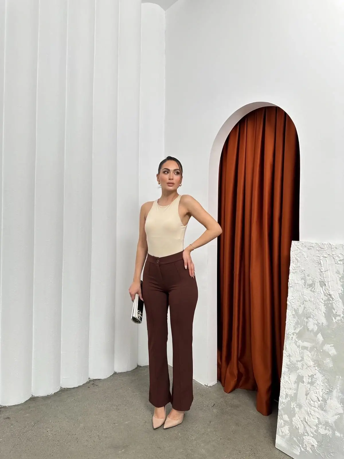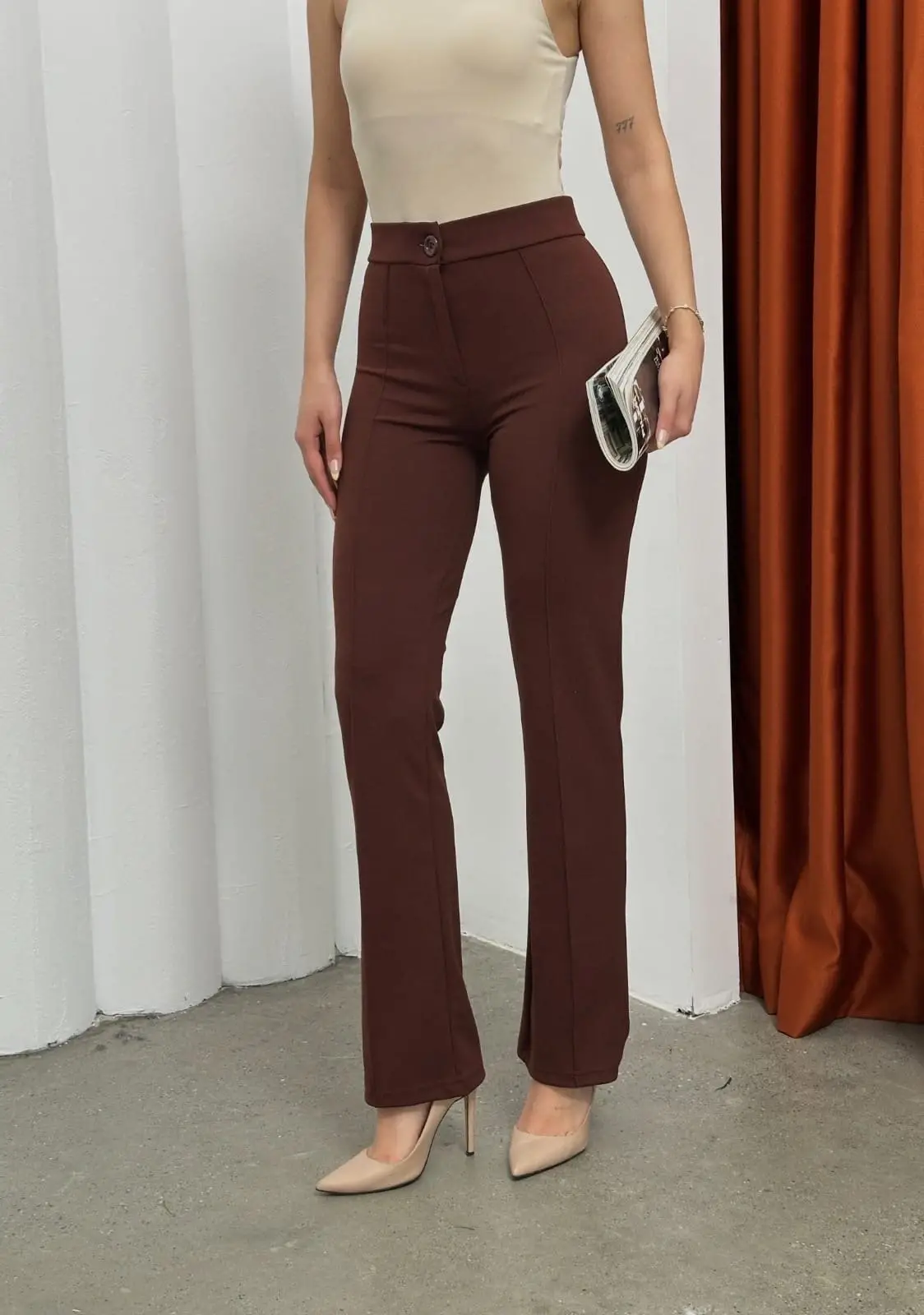 Terzi Bey'in şık ve rahat tasarımıyla öne çıkan Düğmeli Palazzo pantolon kahve p170091, gardırobunuzun vazgeçilmezi olmaya aday!