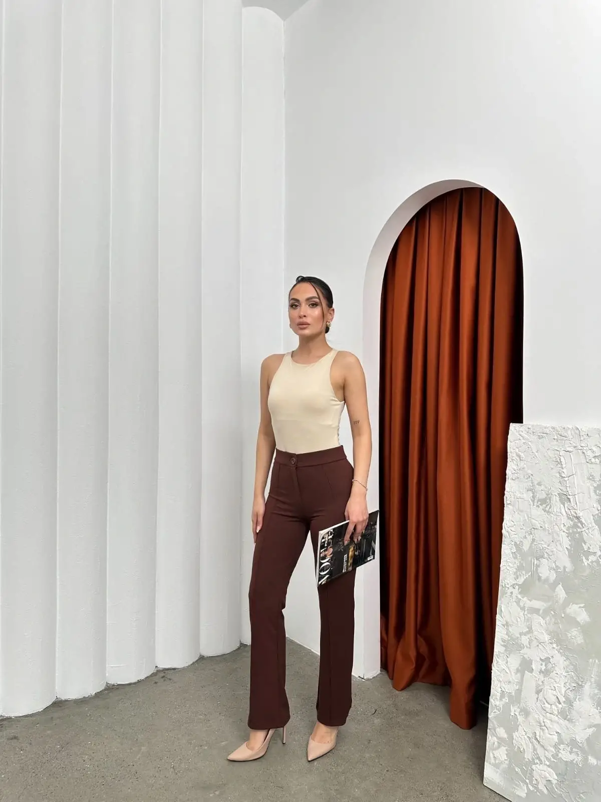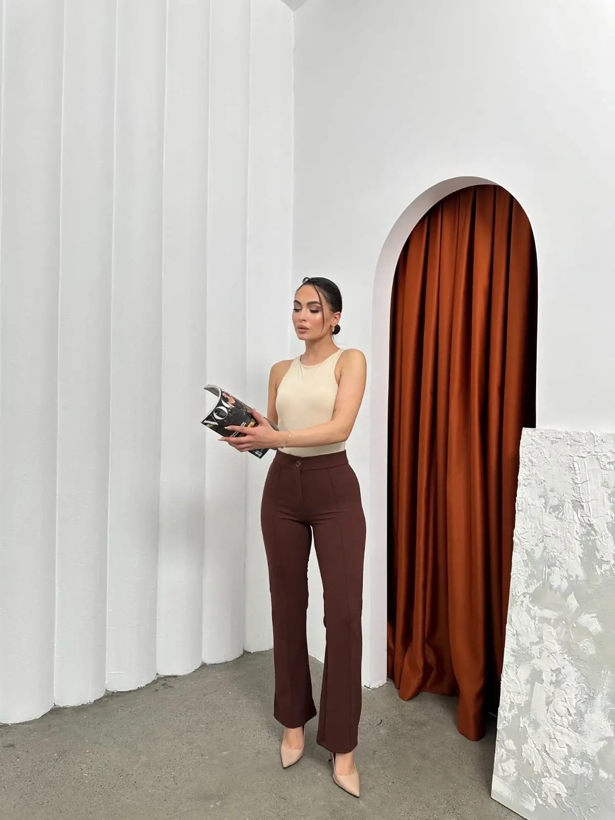 Şık detaylar, konforlu kesim ve yüksek kaliteyi bir arada sunan Terzi Bey Düğmeli Palazzo pantolon kahve p170091'e hemen sahip olun!