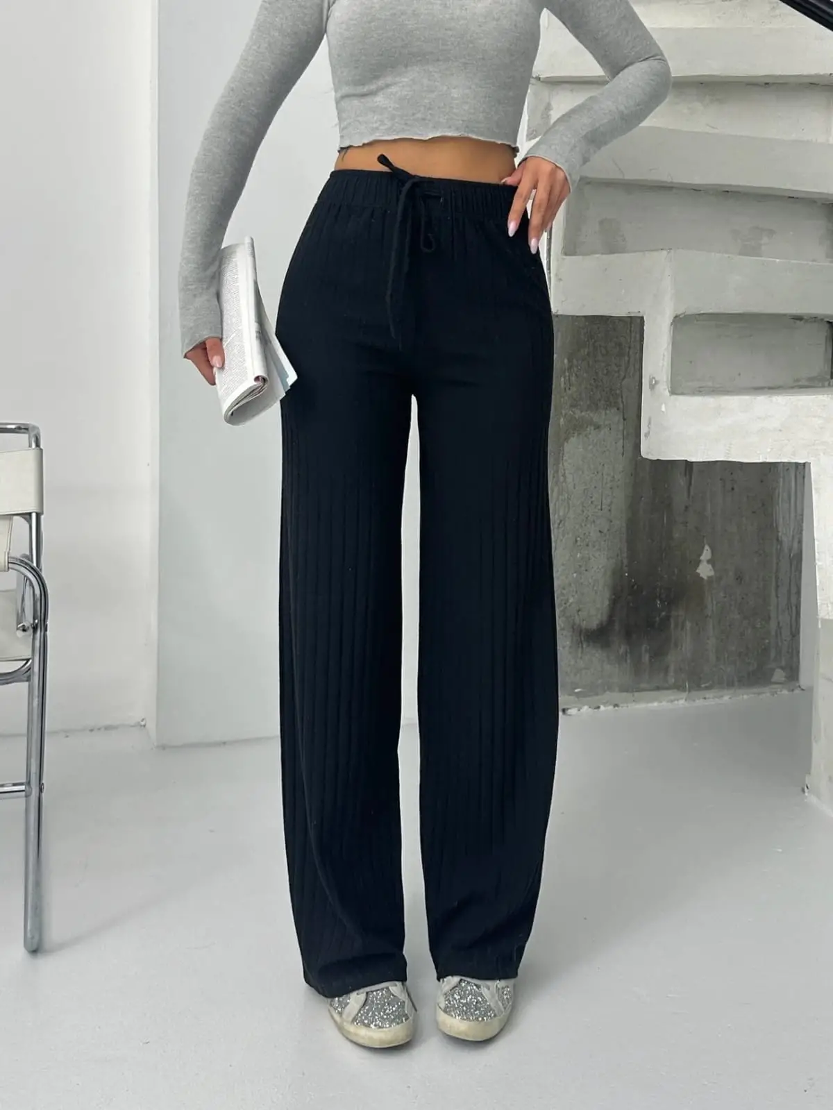 Fitilli şardonlu siyah pantolon, gardırobunuzun vazgeçilmezi olmaya aday bir parça.