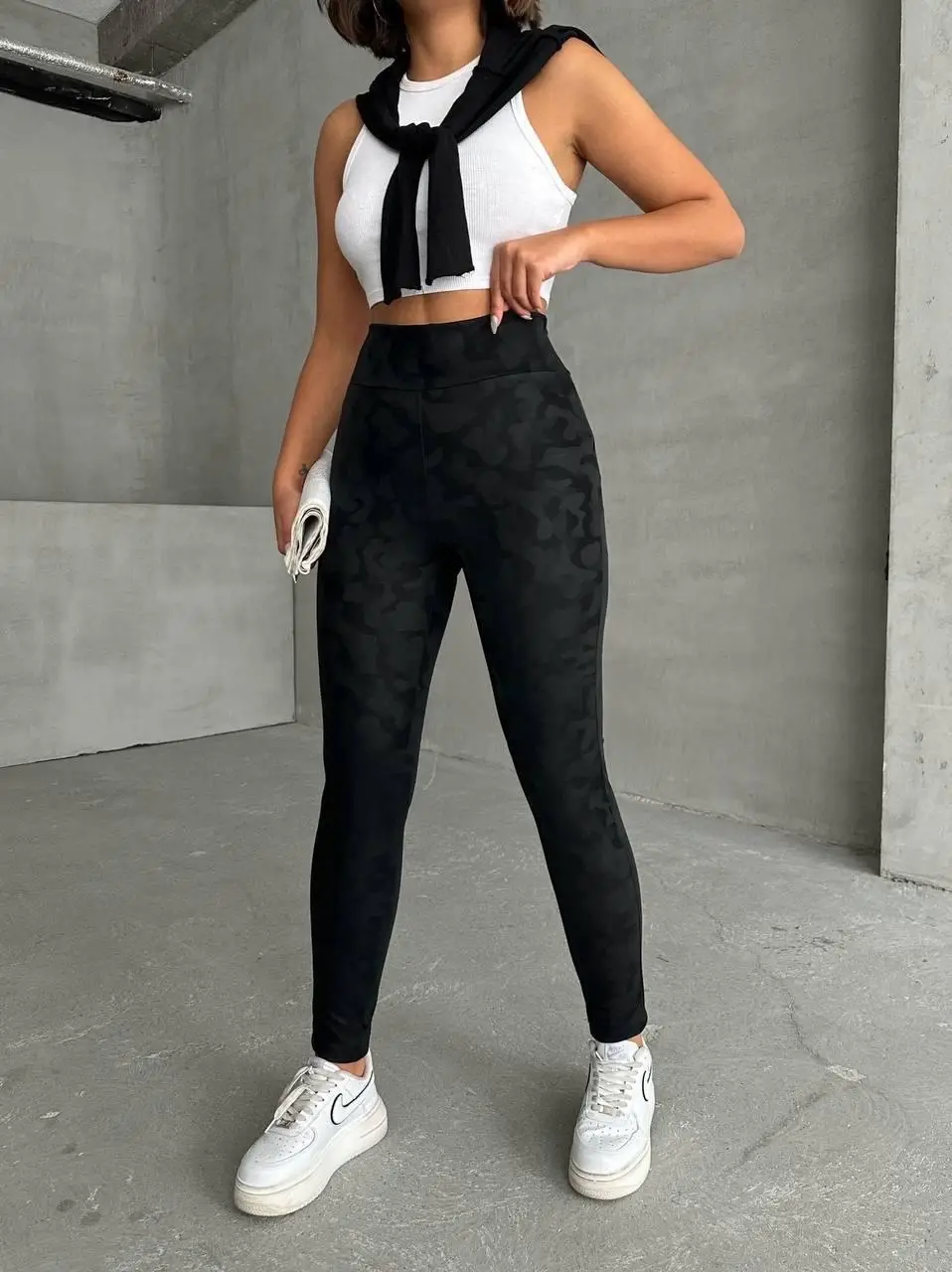 Trendleri takip eden kadınların favorisi olmaya aday, gizli yan fermuarlı bulut desenli siyah tayt ile şıklığı ve rahatlığı bir arada yaşayacaksınız.