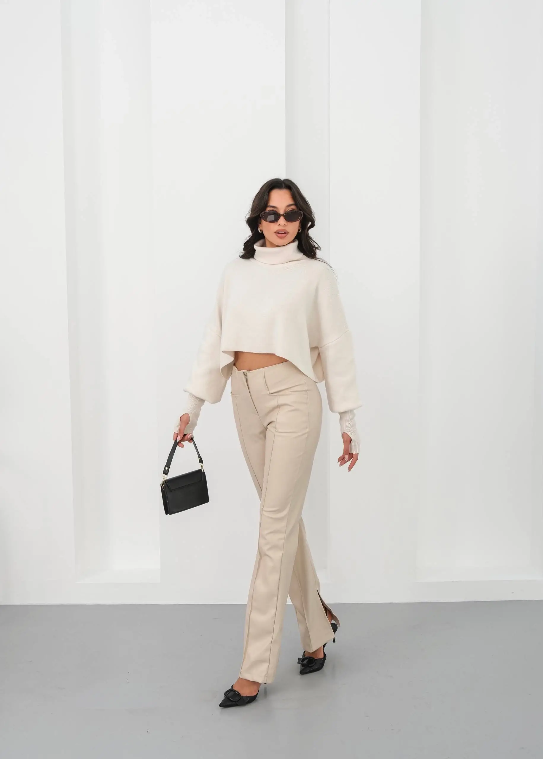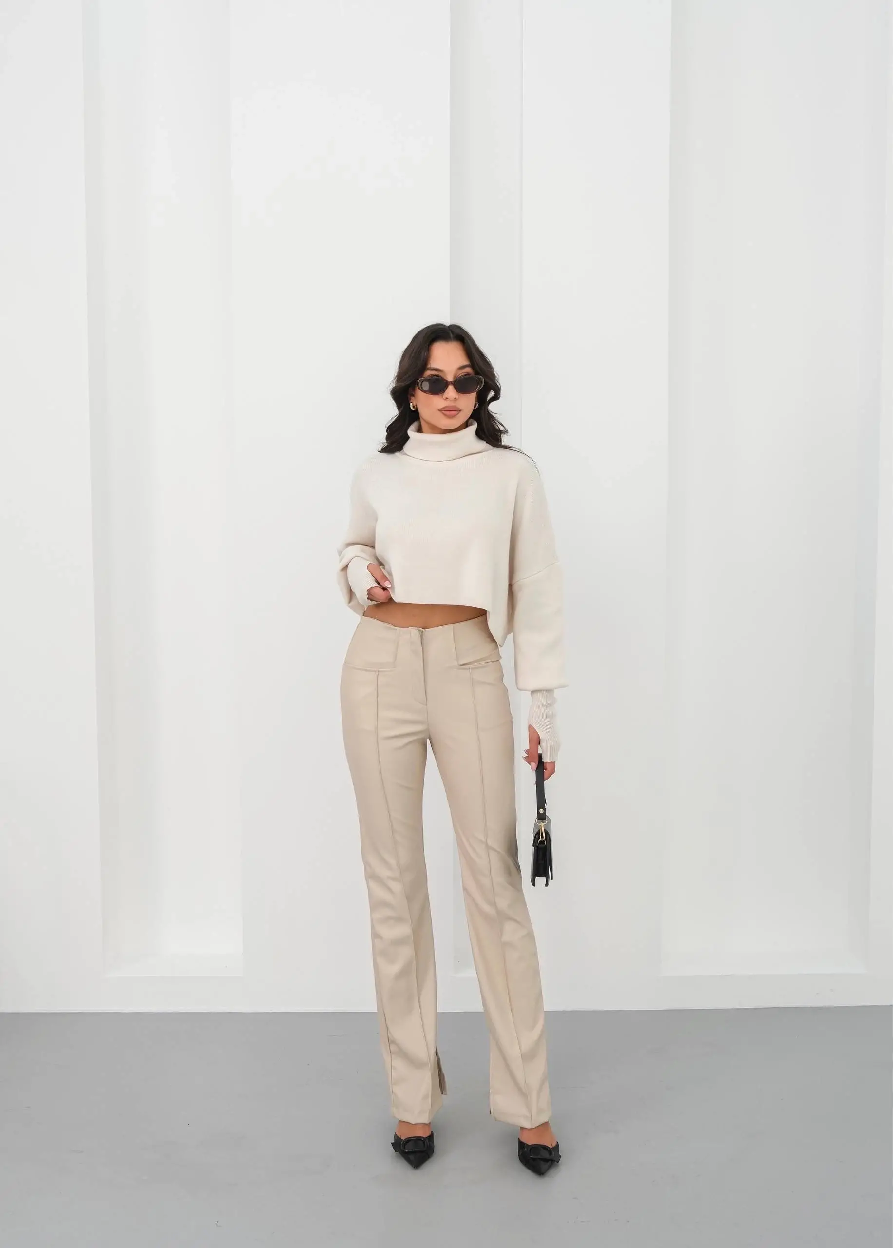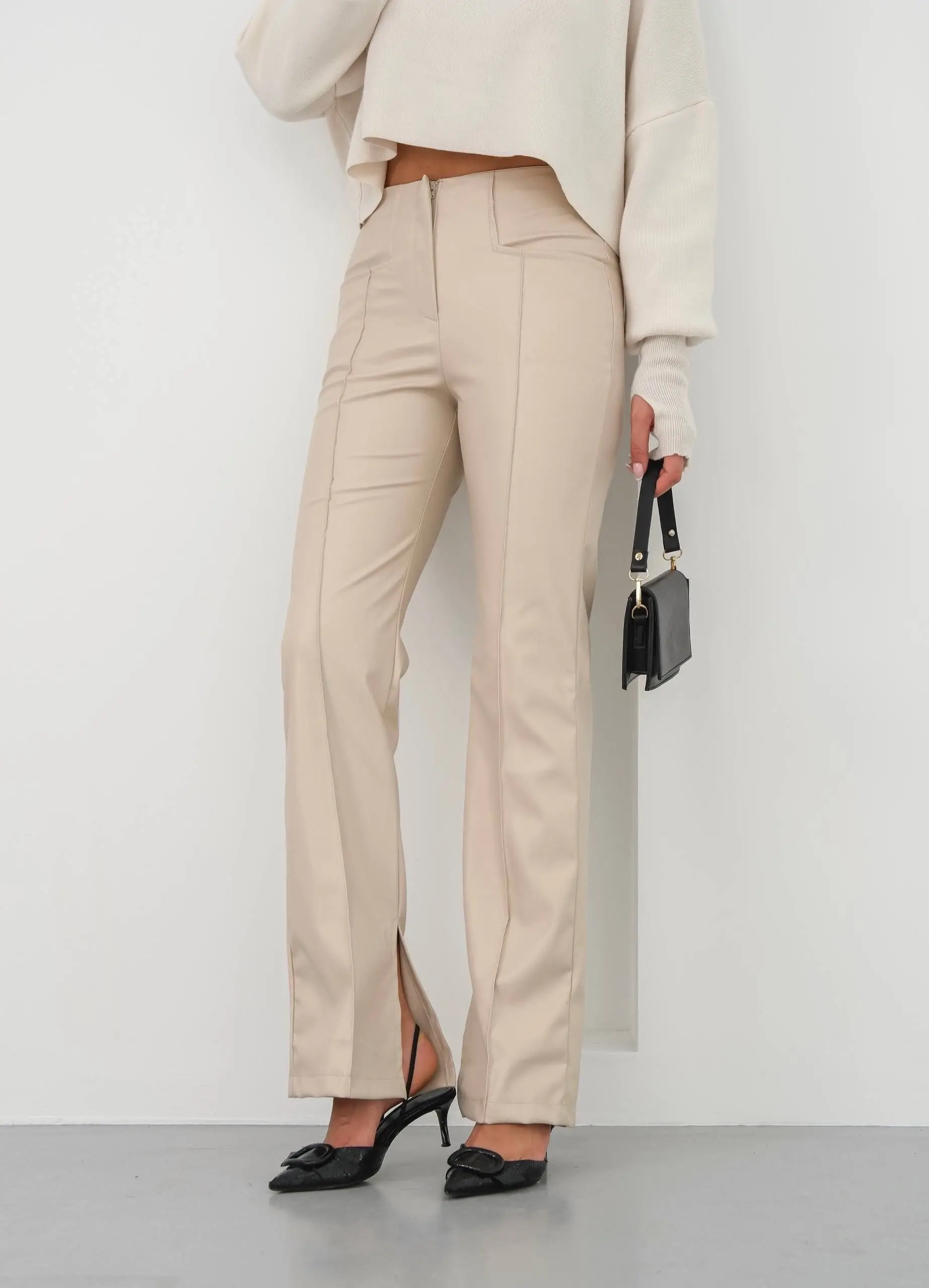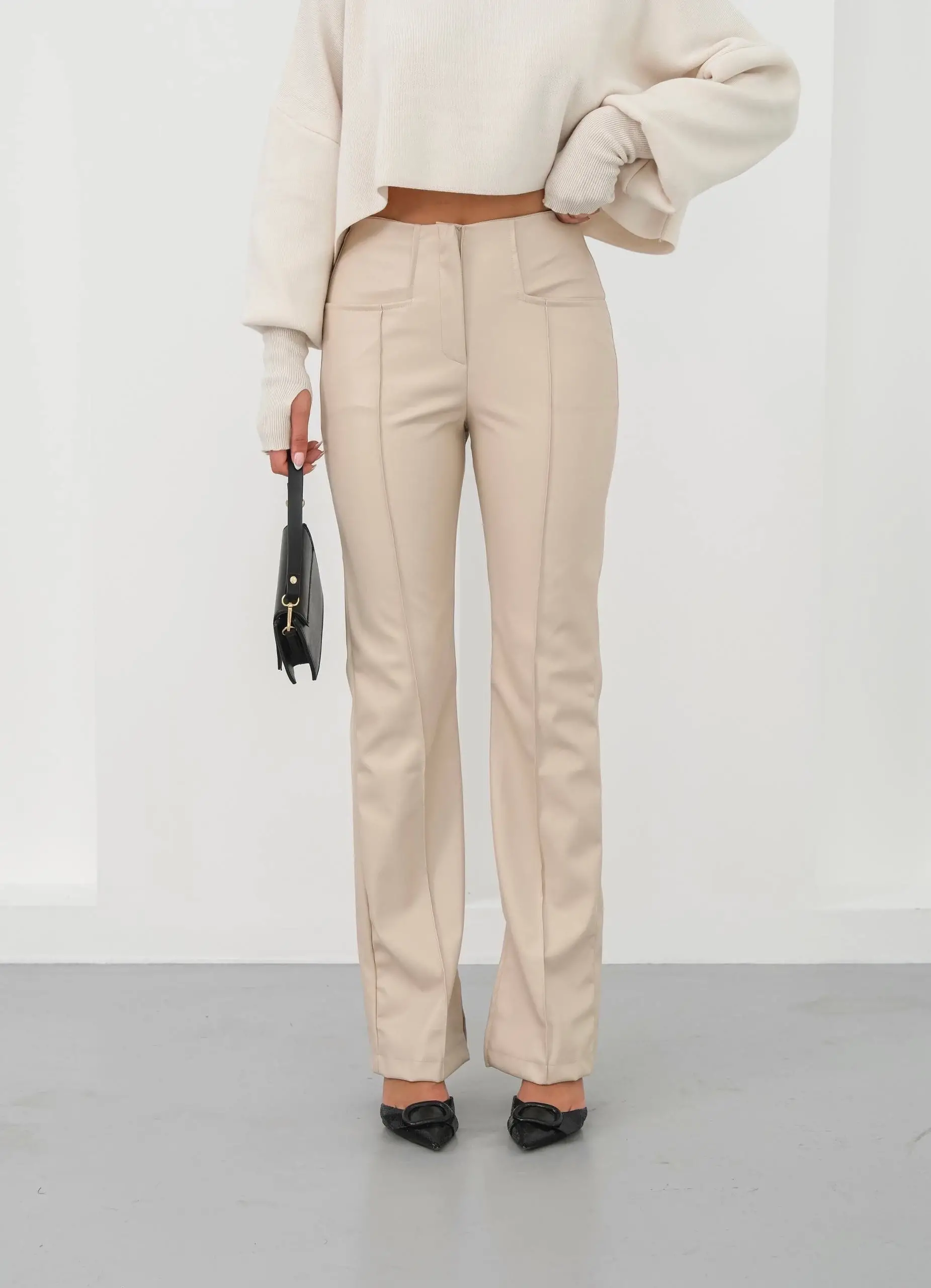 İspanyol yırtmaçlı paça deri pantolon, şıklığı ve rahatlığı bir arada sunar.