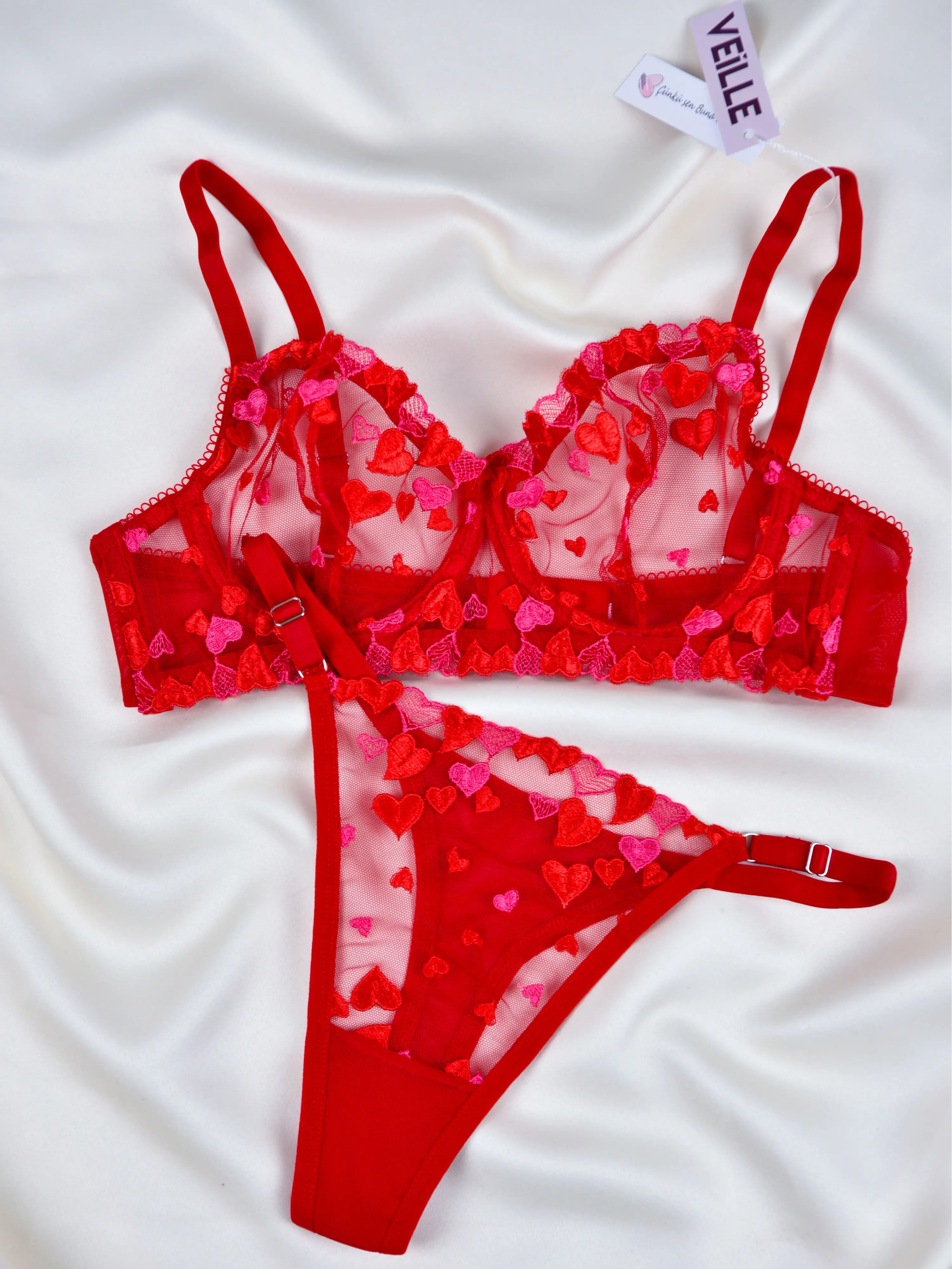 Kadın Kalpli Kırmızı Dantelli Balenli Sütyen Külot Takım, modern tasarımı ve üstün konforu bir araya getiren eşsiz bir üründür. Günlük kullanıma uygun yapısı, kaliteli malzeme seçimi ve şık görünümü ile kadınların gardırobunun vazgeçilmez parçalarından biri olmaya adaydır.