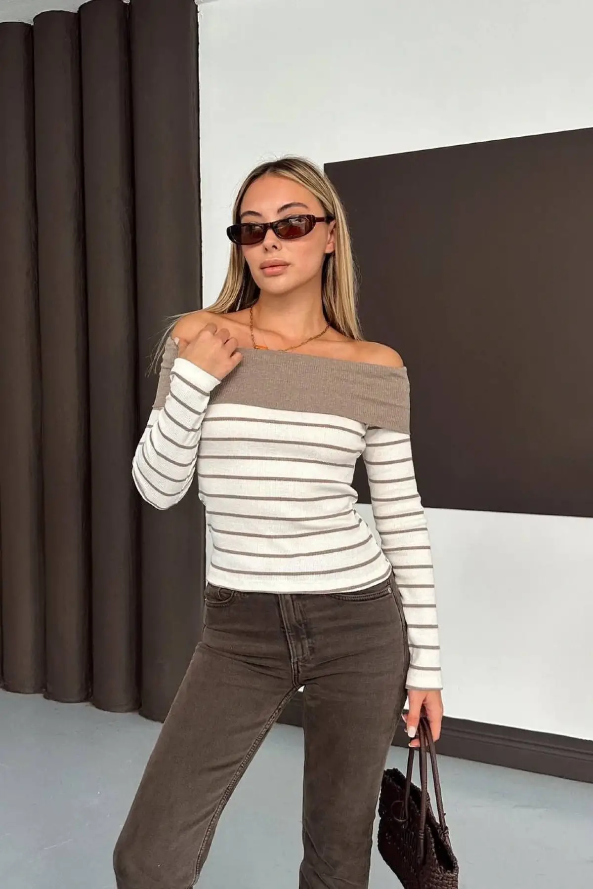 Çizgili Madonna Yaka Kaşkorse Bluz Bej A844