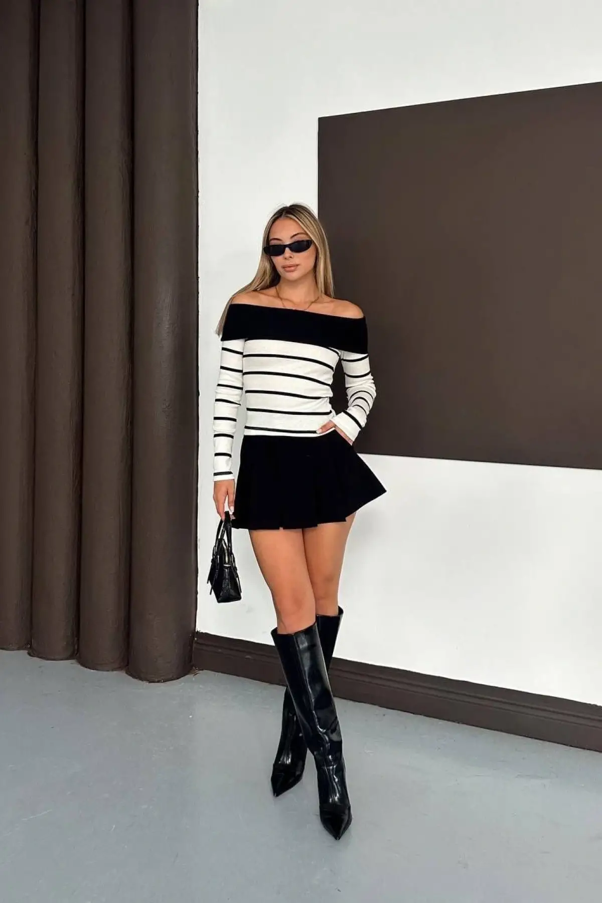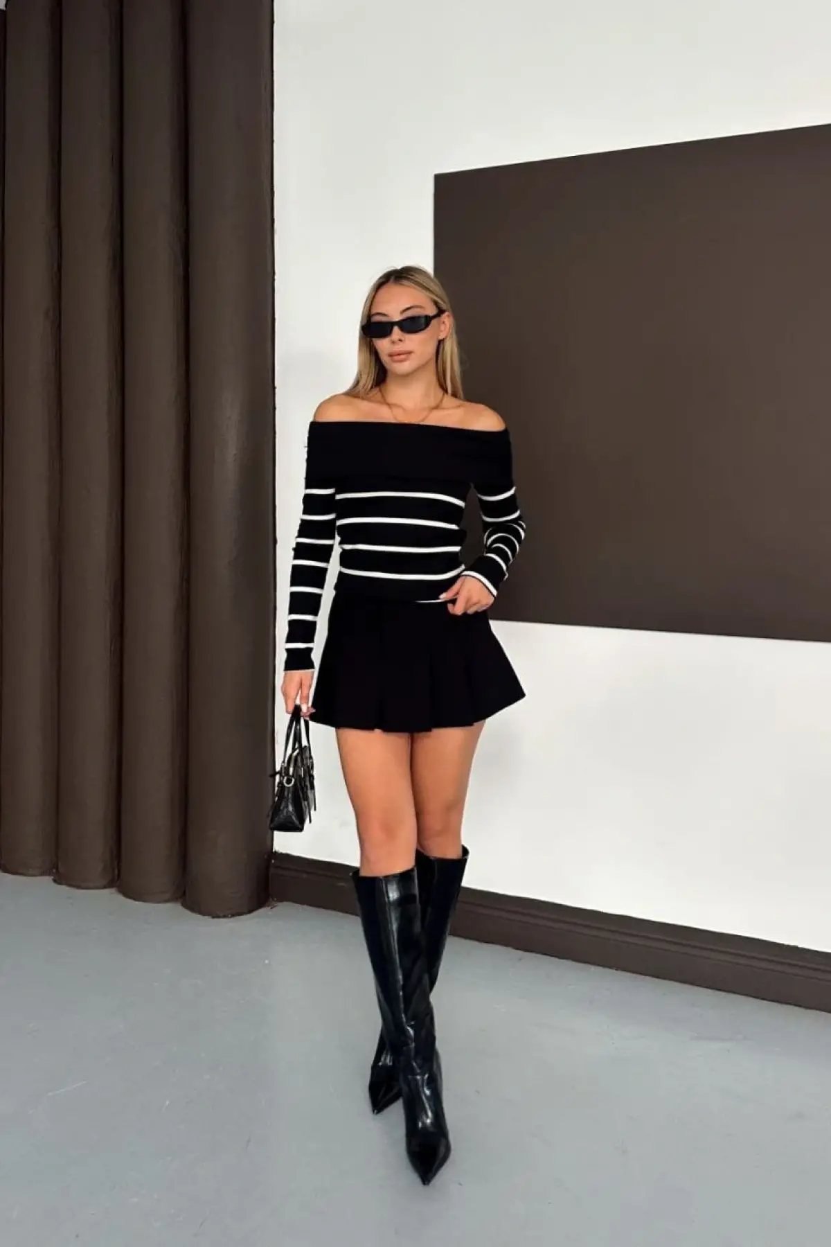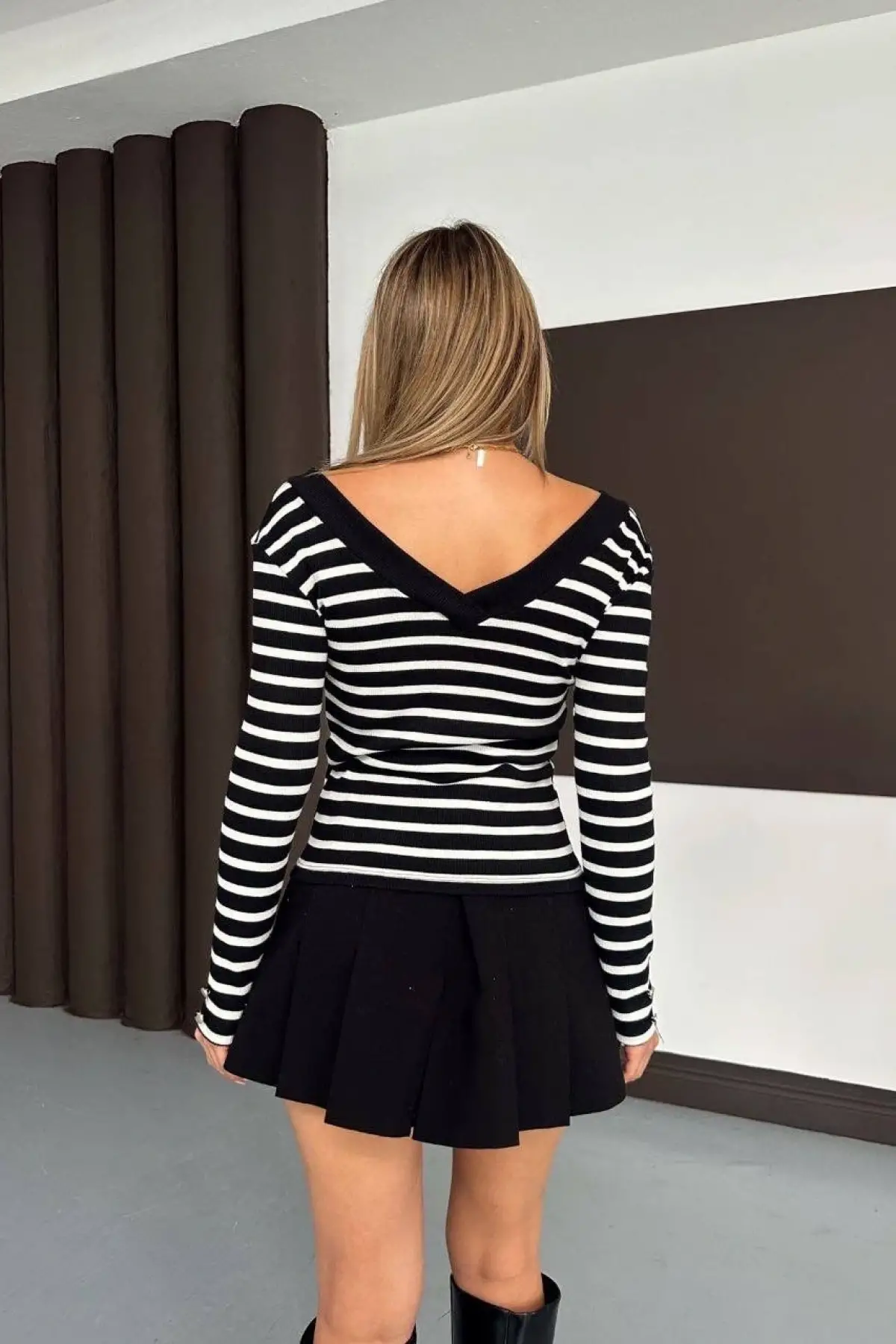 Çizgili Madonna Yaka Kaşkorse Bluz Siyah A844