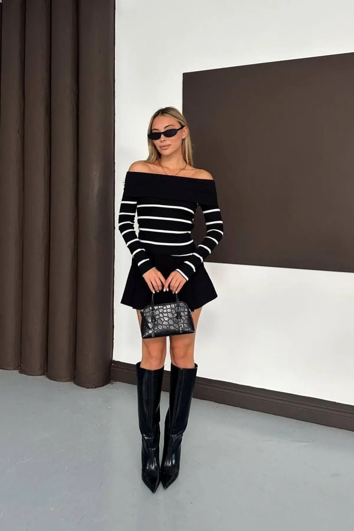 Çizgili İspanyol Kol Triko Boğazlı Kazak Siyah Elf