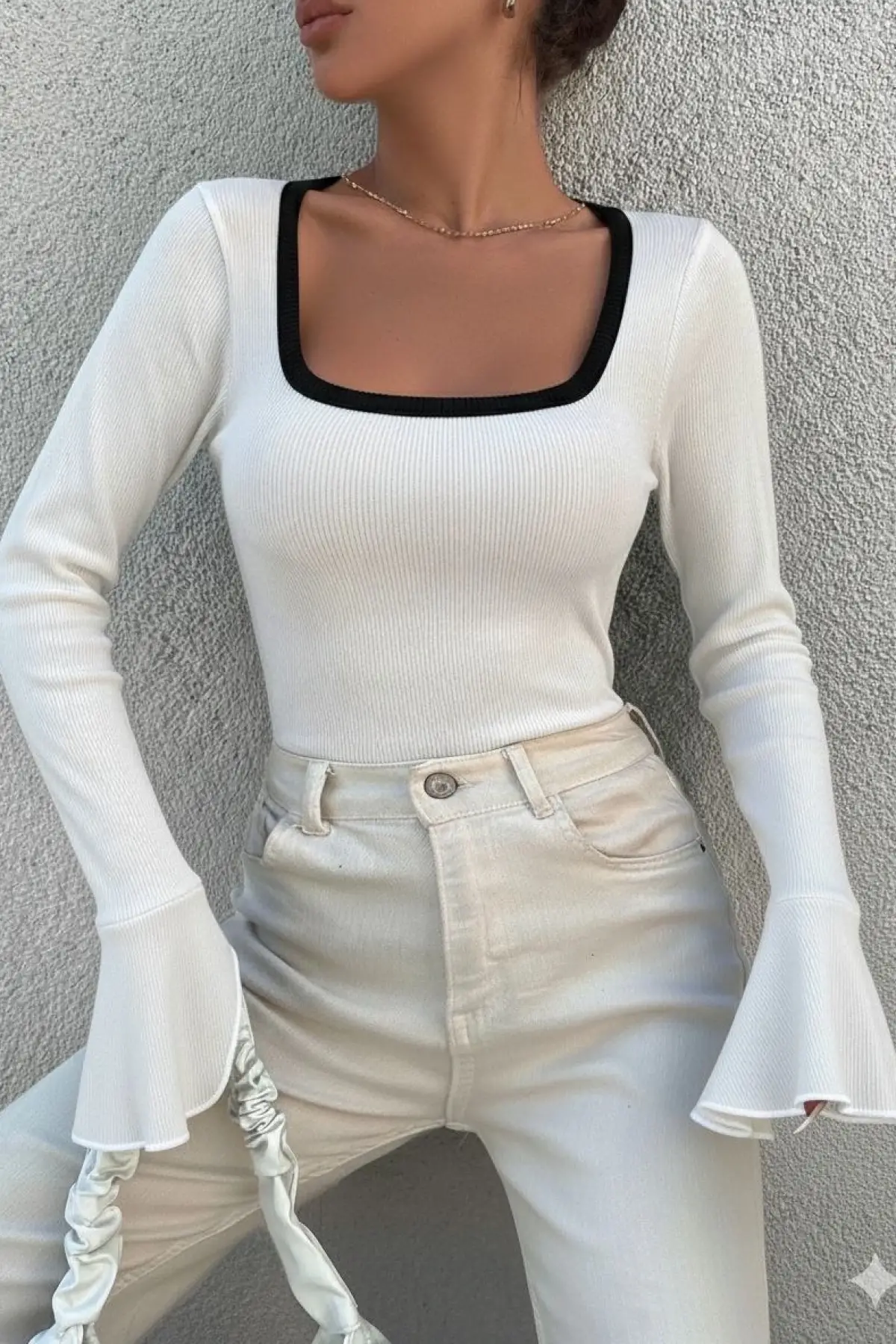 Kare Yaka Garni Detay İspanyol Kol Bluz Beyaz A3105