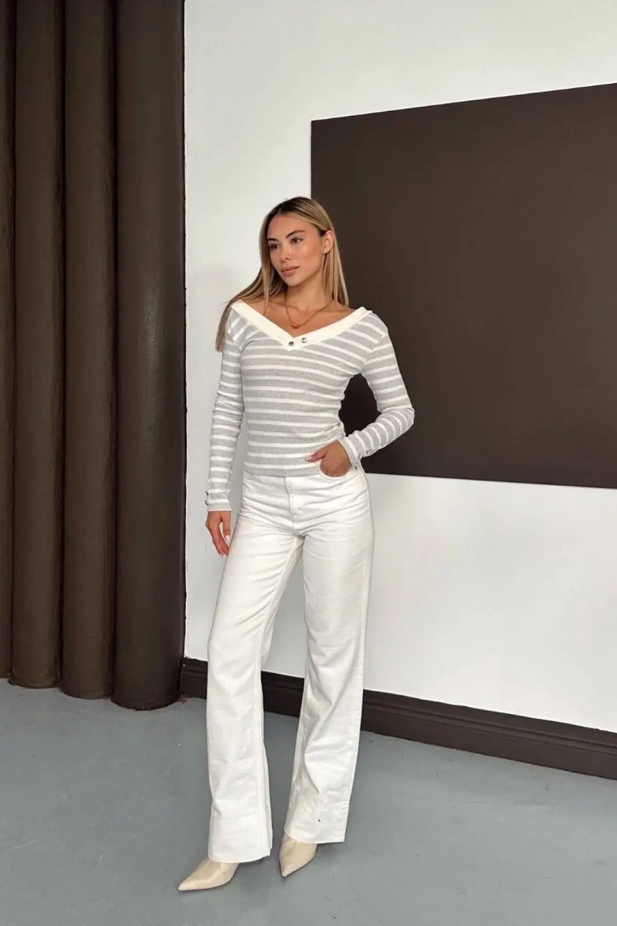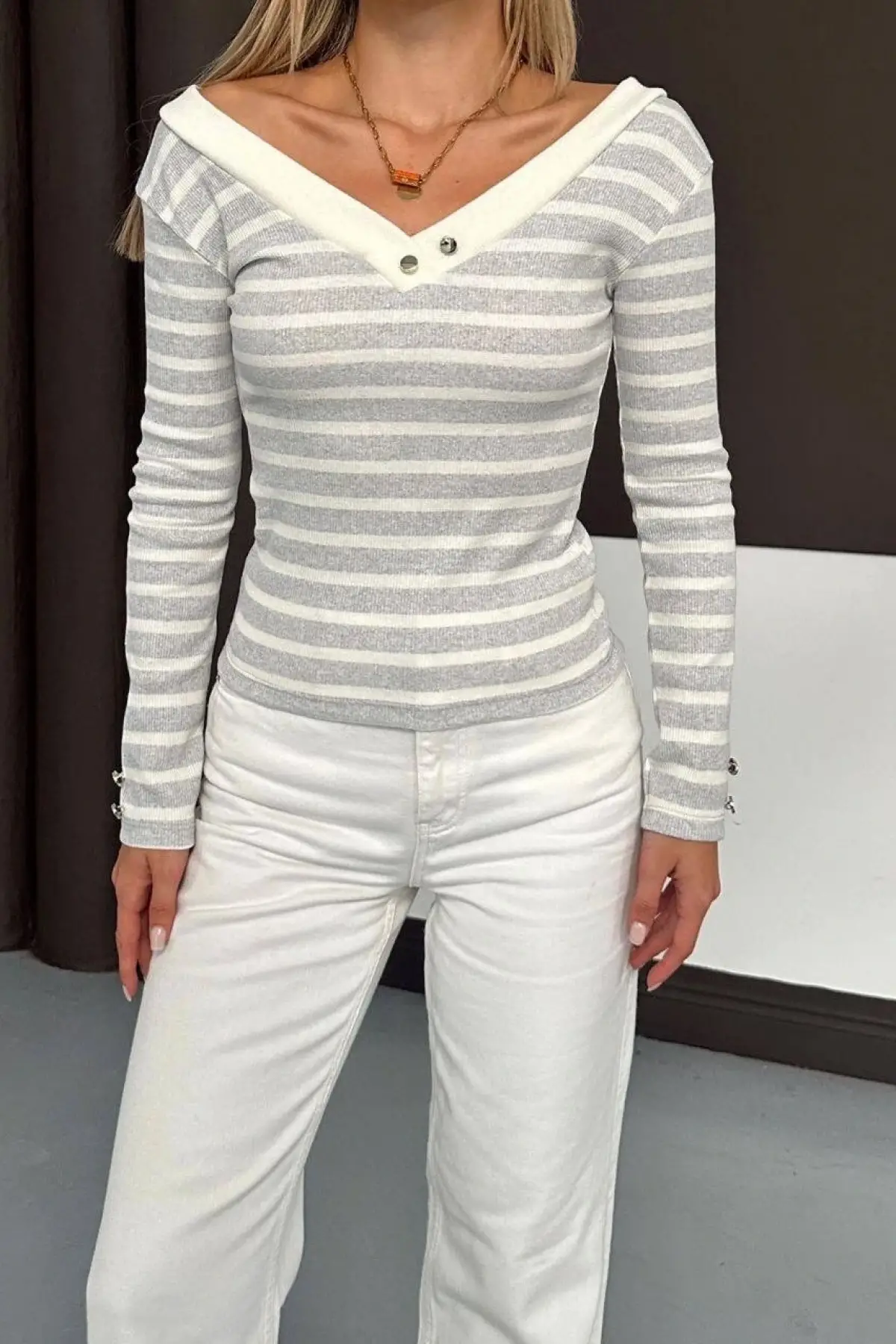 V Yaka Kol Ve Yaka Düğmeli Bluz Gribeyaz A4047