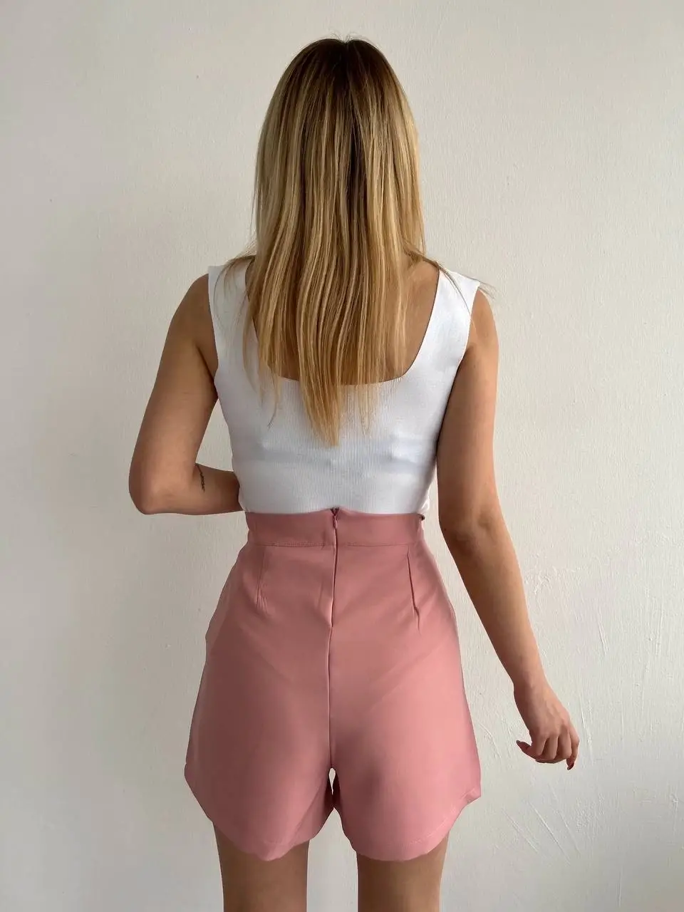 Kapaklı şort etek pudra S208, şıklık ve rahatlığı bir arada sunar.