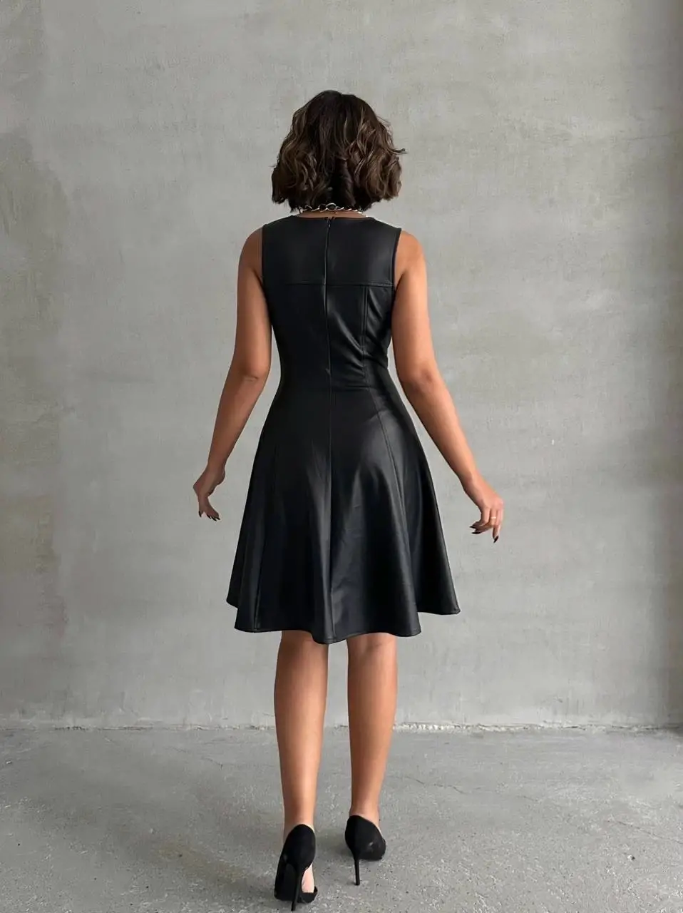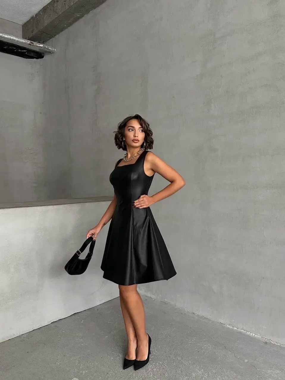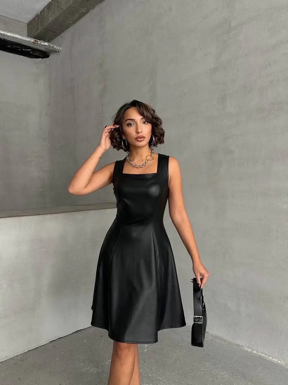 Şıklık ve zarafetin buluştuğu Kare Yaka Deri Elbise Siyah H24442, gardırobunuzun vazgeçilmezi olmaya aday!