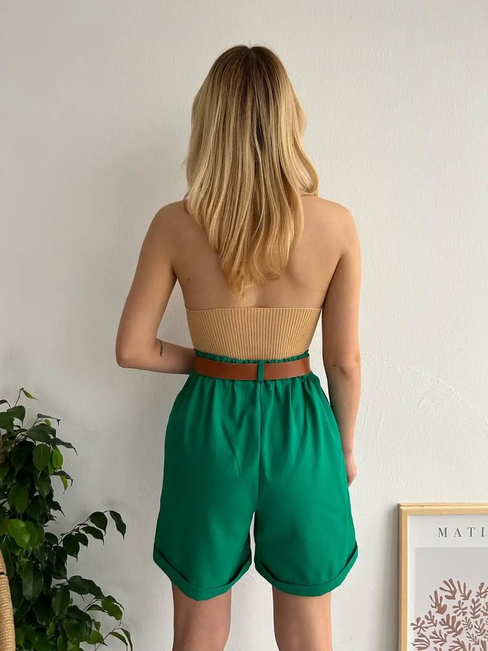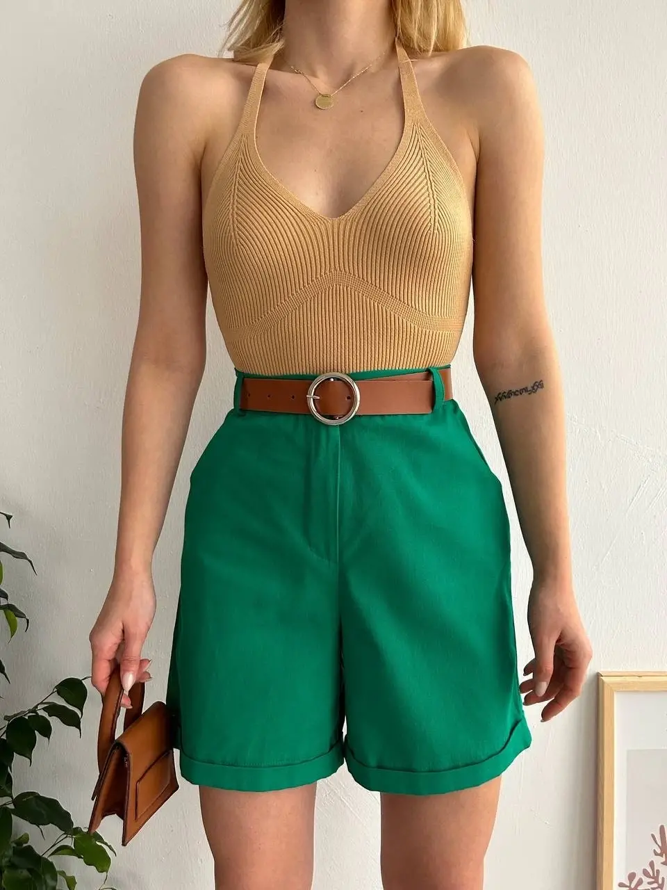 Modern ve şık tasarımıyla kadınların favorisi olmaya aday Yeşil Kemerli Gabardin Şort, gardırobunuzun vazgeçilmezi olacak.