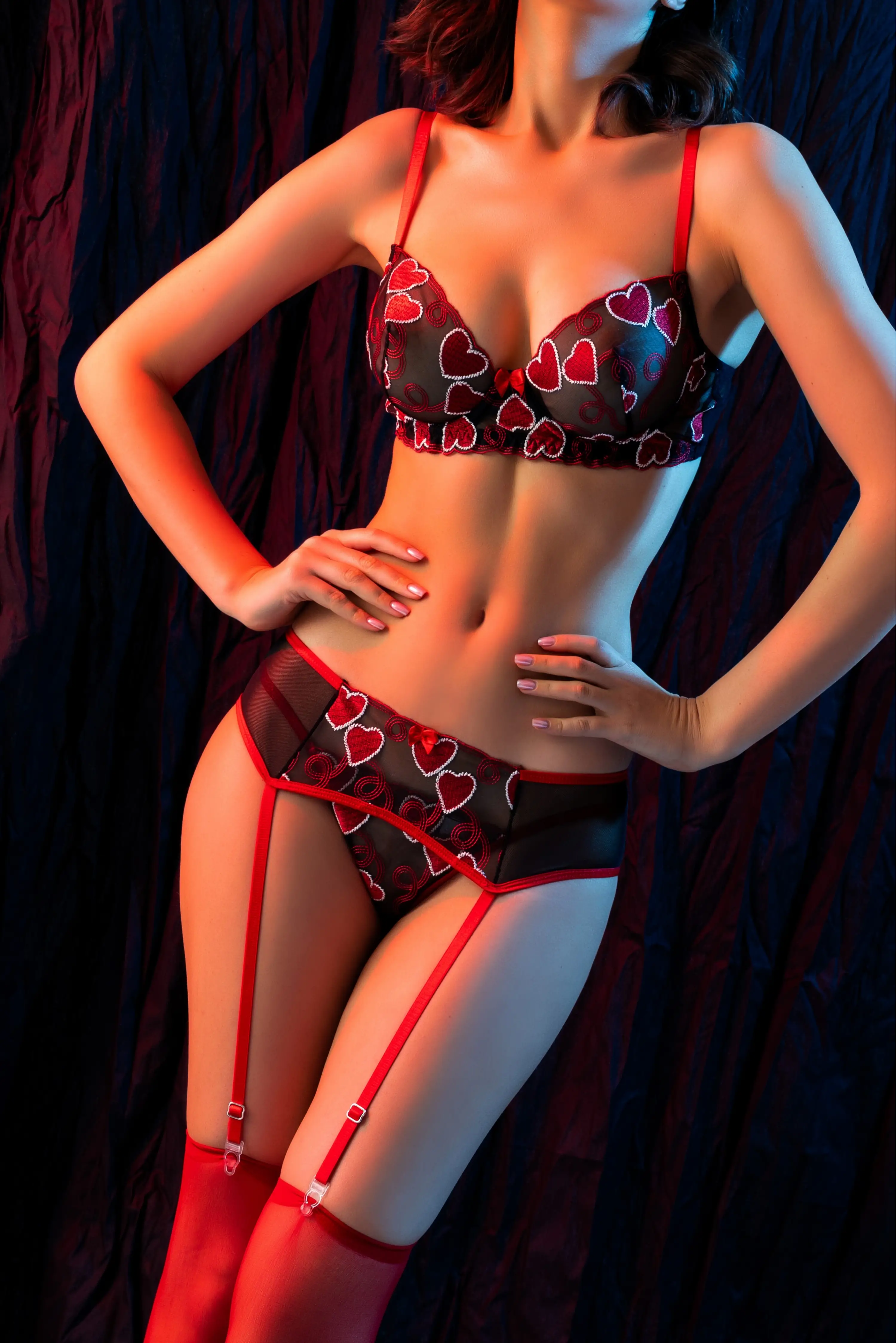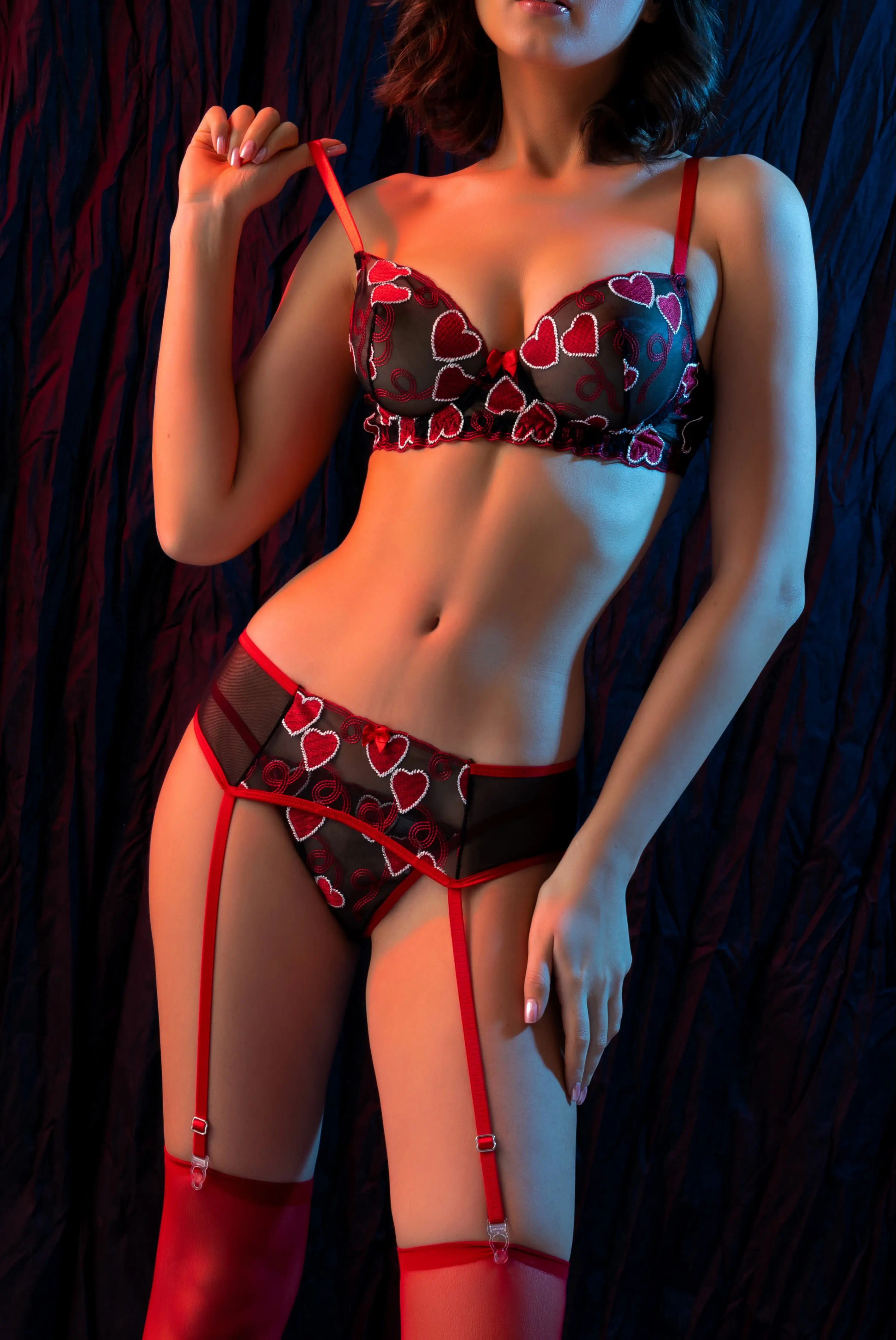 Kendine güvenen, cesur ve zarif kadınlar için özel olarak tasarlanan bu üçlü iç giyim setiyle sınırlarını aş. Transparan tül üzerine işlenmiş kalp motifleriyle hem romantik hem de seksi bir görünüm sunan bu takım, aşkı vücuduna yazıyor.