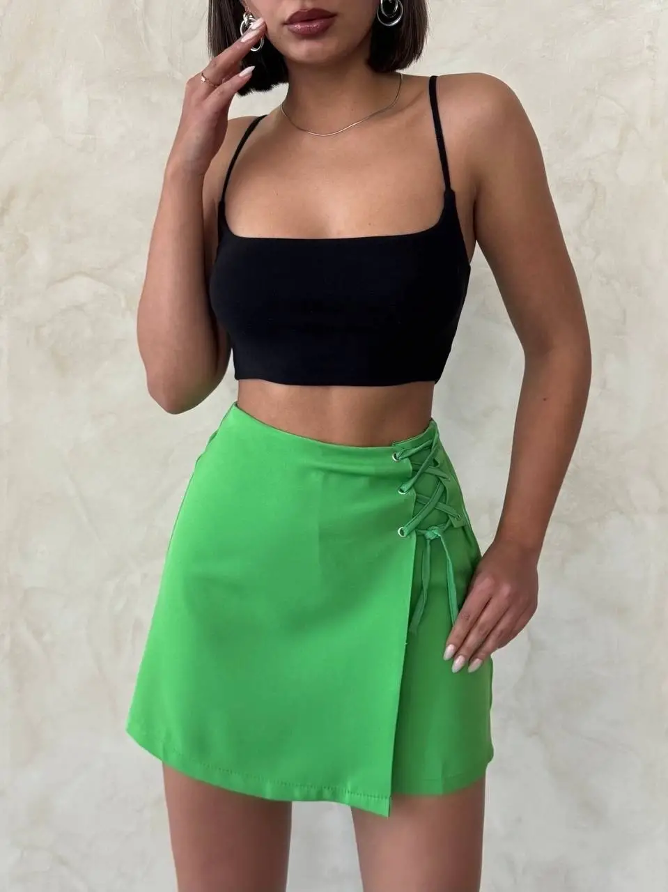 Şık yeşil rengi, yaz aylarında sizi ferah ve stil sahibi gösterecek. Yazın vazgeçilmezi olan şort etek, her kombinle rahatlıkla uyum sağlar.