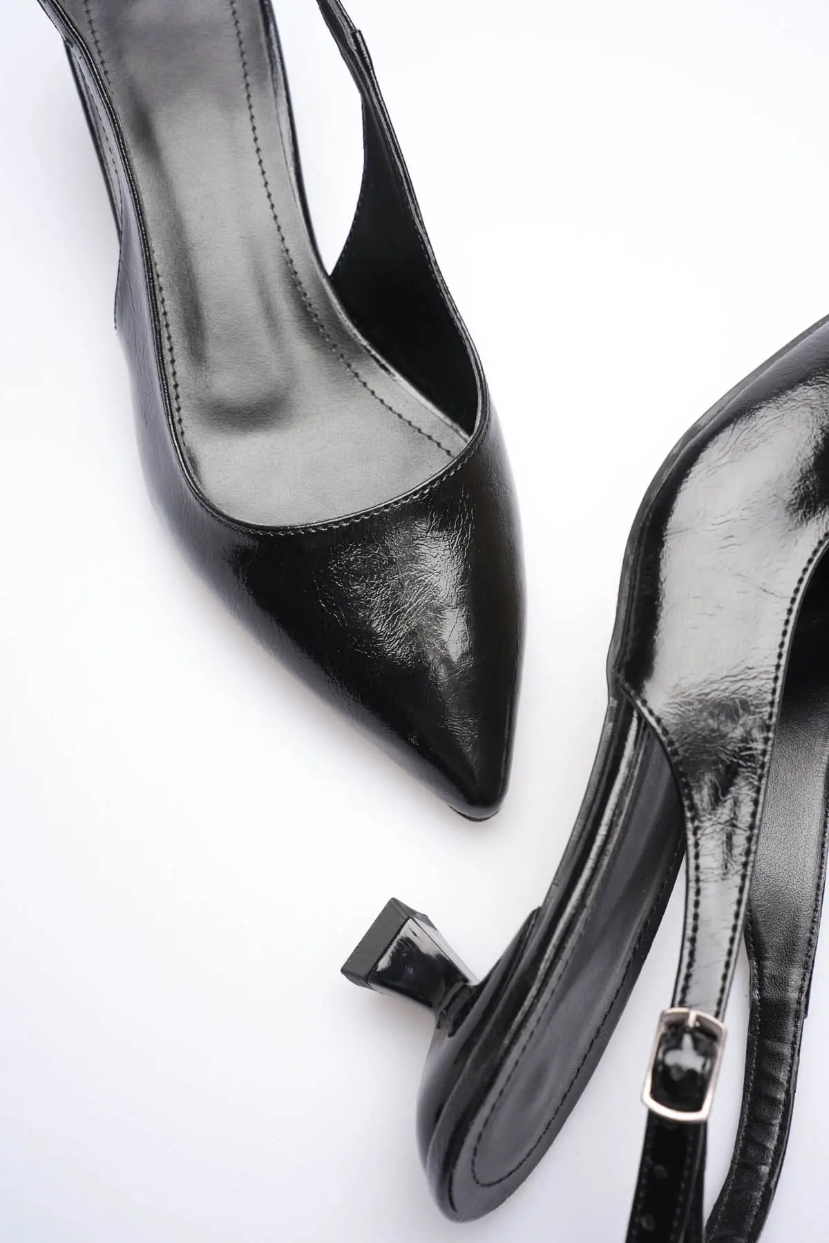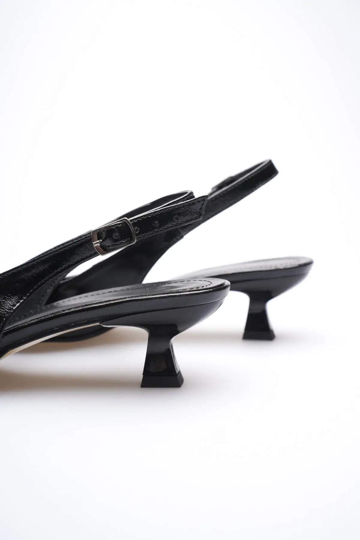 Kadın Siyah Kırışık Rugan Sivri Burun Slingback Kısa Topuklu Ayakkabı TR20MS04C