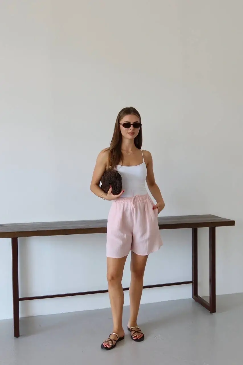 Bu şık pembe şort, rahatlığı ve şıklığı bir arada sunuyor. %100 pamuklu müslin kumaştan üretilmiştir ve sıcak havalarda serin kalmanızı sağlar. Bağcıklı detayı sayesinde belinize göre ayarlayabilir ve istediğiniz şekilde kullanabilirsiniz. Zarif tasarımı ile günlük hayatta ve tatilde rahatlıkla tercih edebilirsiniz.