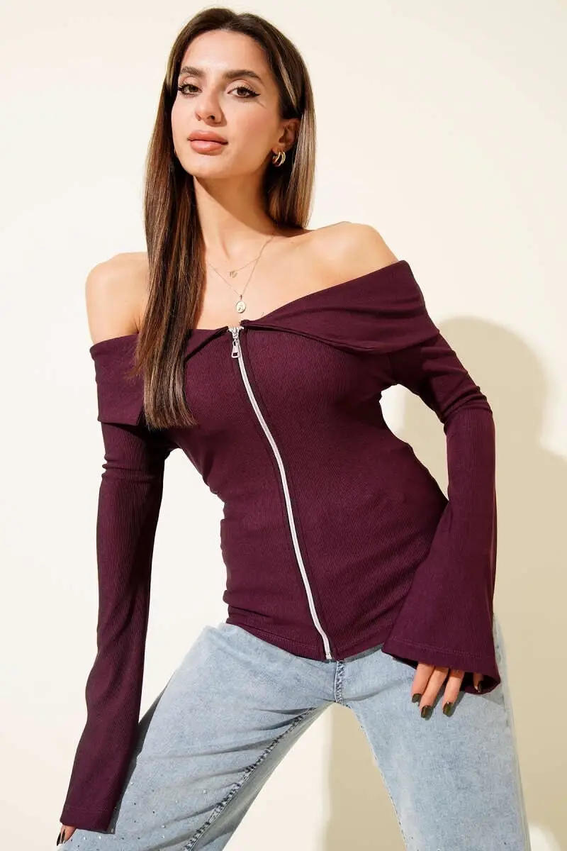 Bu bluz ile hem günlük hayatta hem de özel günlerde tarzınızı konuşturabilirsiniz. Omzu Açık Fermuarlı Bluz Mürdüm T4330, şıklığı ve rahatlığı bir arada arayan kadınların favorisi olacak!