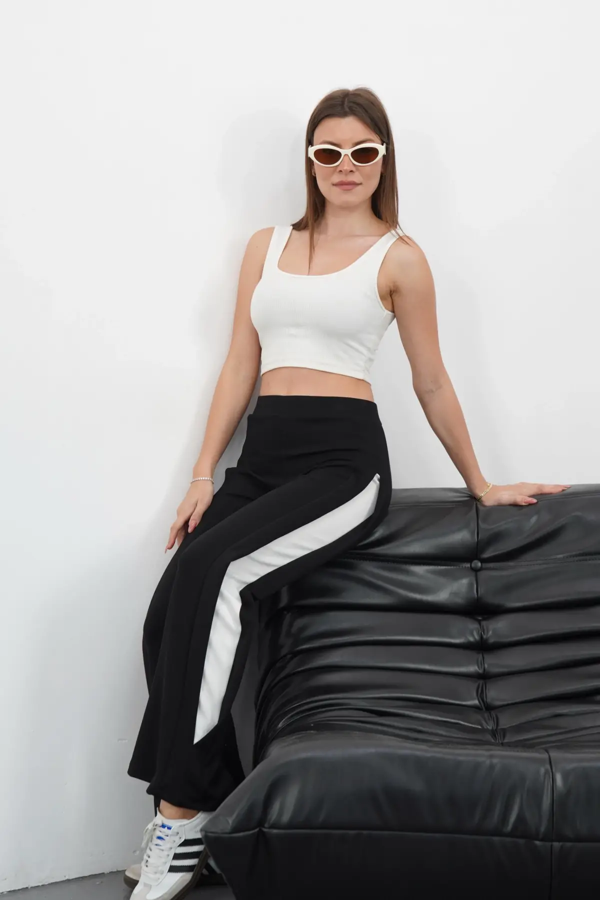 Şıklığı ve rahatlığı bir arada sunan Şeritli Garnili Pantolon Siyah!