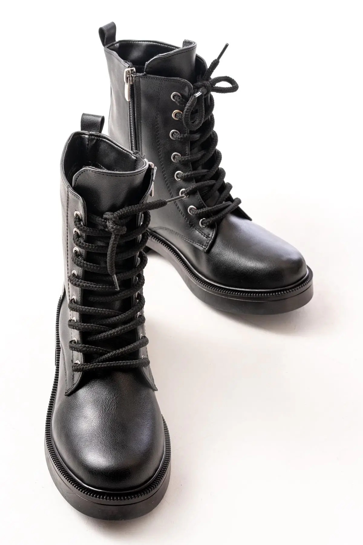 Siyah Düz Topuklu Bağcıklı Fermuarlı Günlük Kadın Bot, modern tasarımı ve üstün konforu bir araya getiren eşsiz bir üründür. Günlük kullanıma uygun yapısı, kaliteli malzeme seçimi ve şık görünümü ile kadınların gardırobunun vazgeçilmez parçalarından biri olmaya adaydır.