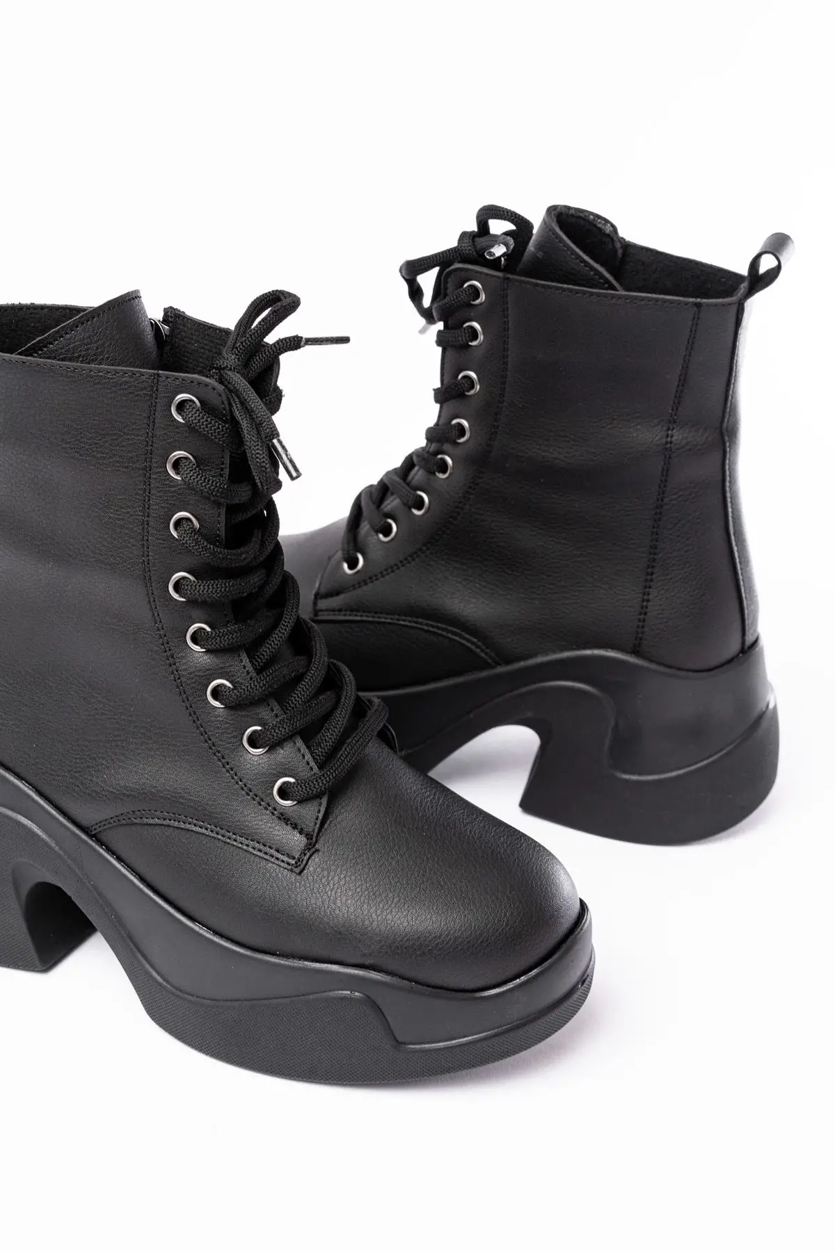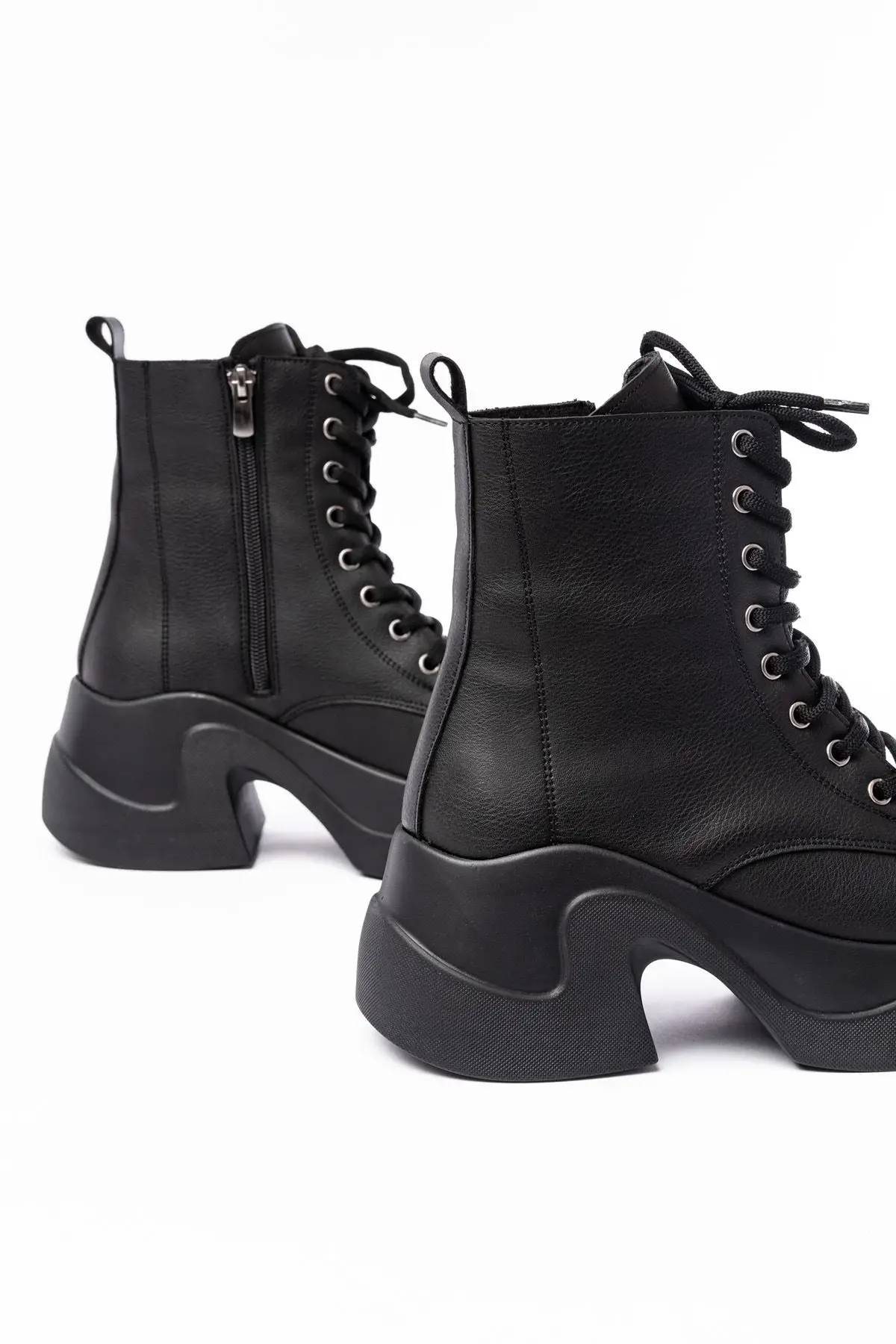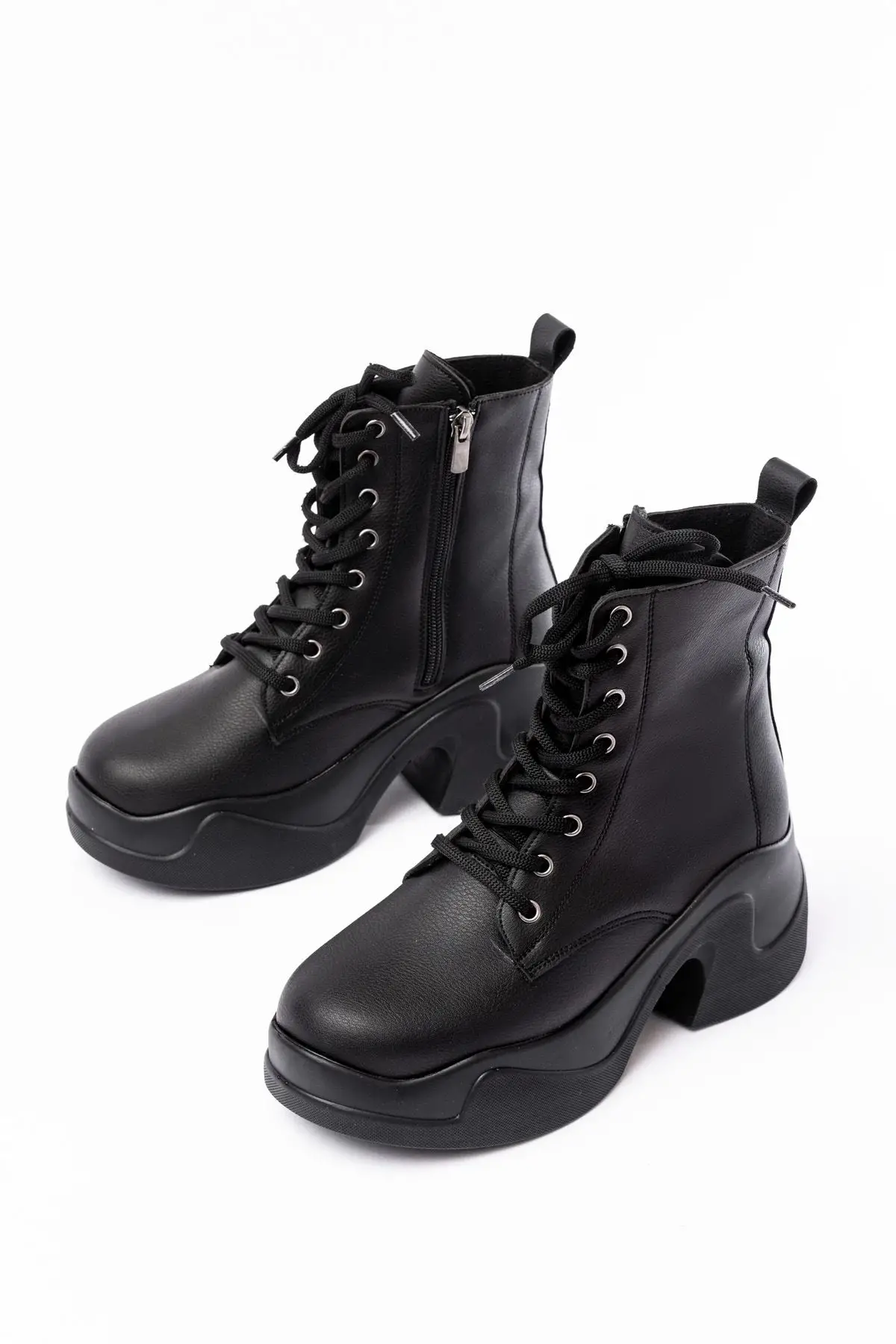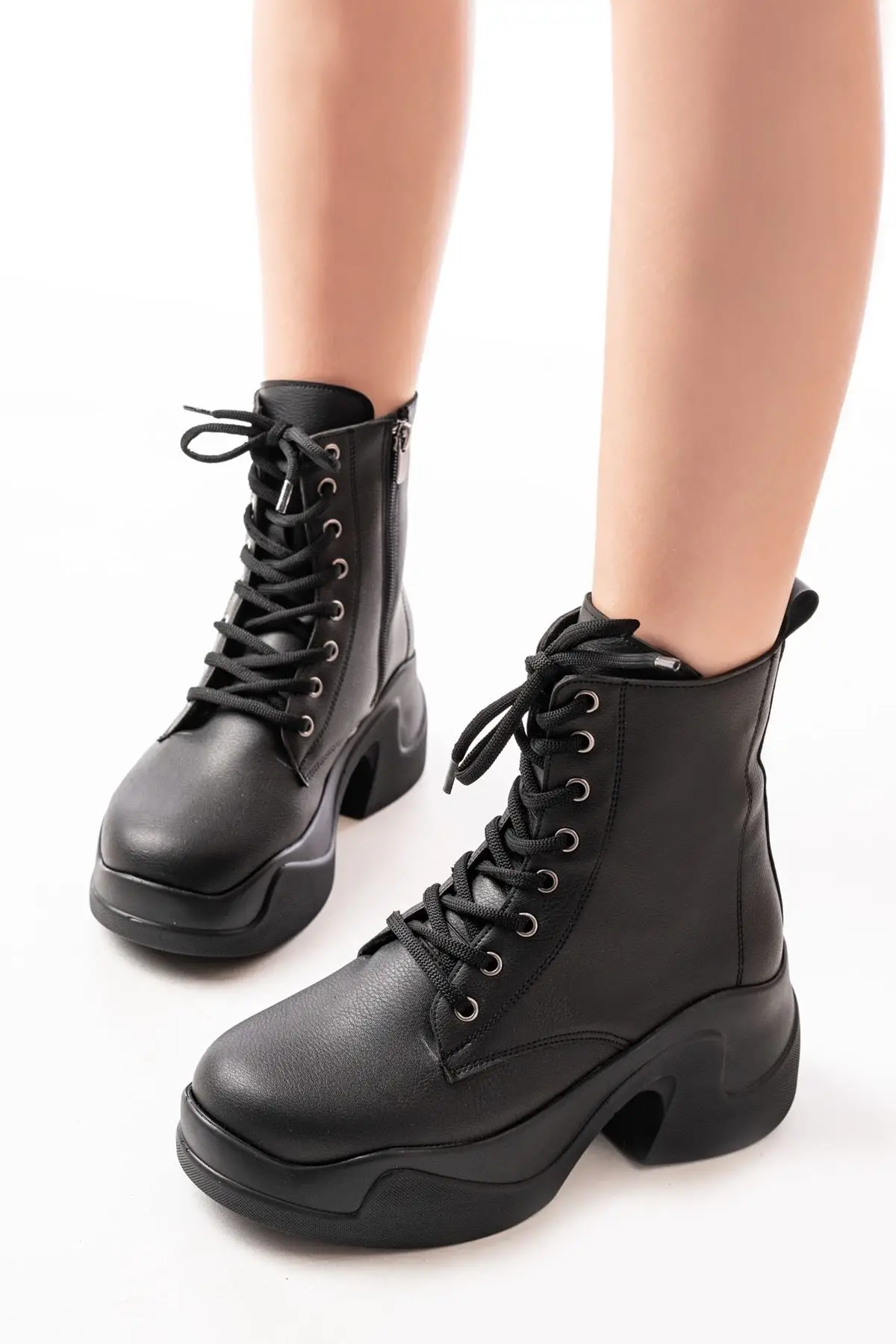 Siyah Yüksek Tabanlı Bağcıklı Fermuarlı Günlük Kadın Bot, modern tasarımı ve üstün konforu bir araya getiren eşsiz bir üründür. Günlük kullanıma uygun yapısı, kaliteli malzeme seçimi ve şık görünümü ile kadınların gardırobunun vazgeçilmez parçalarından biri olmaya adaydır.