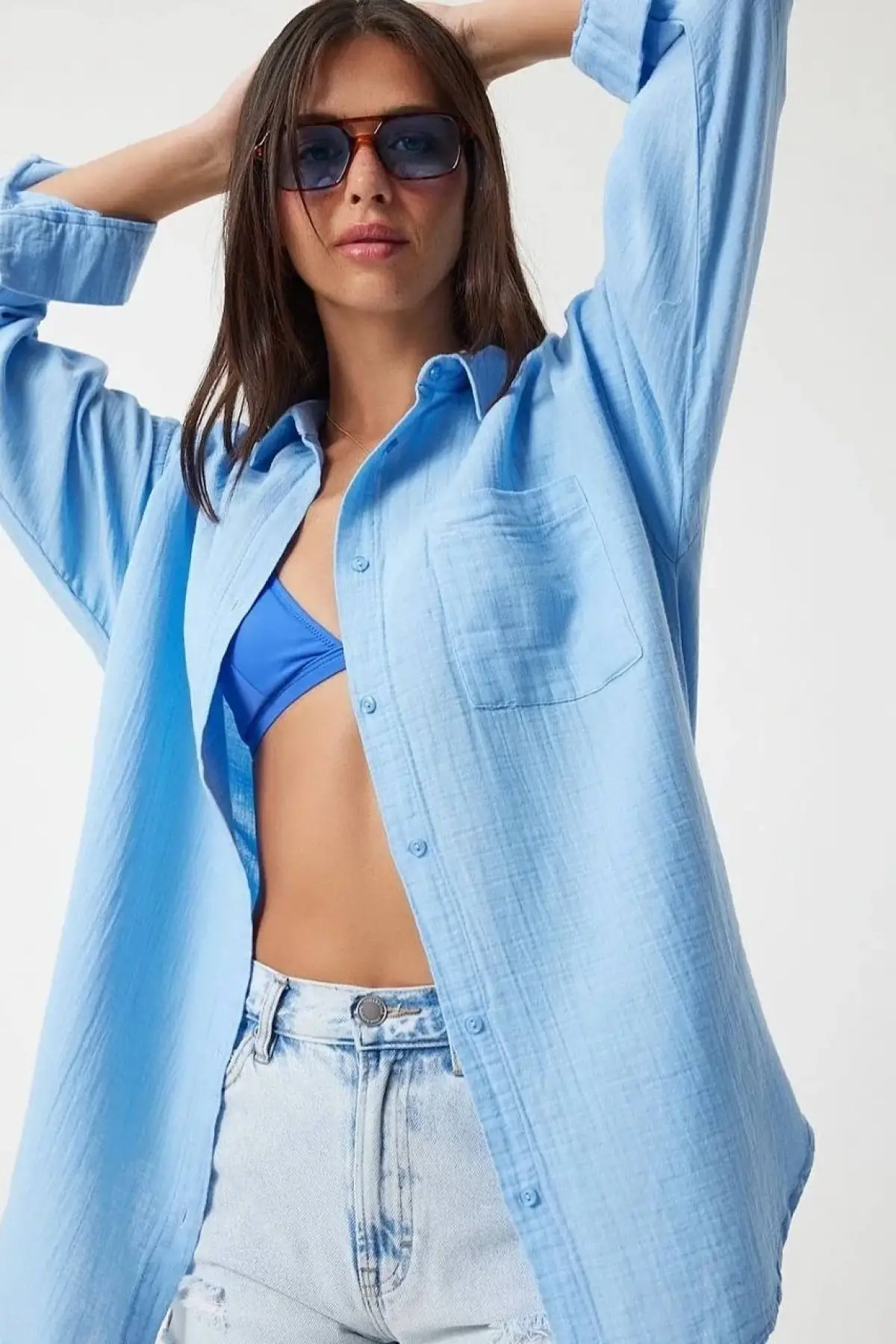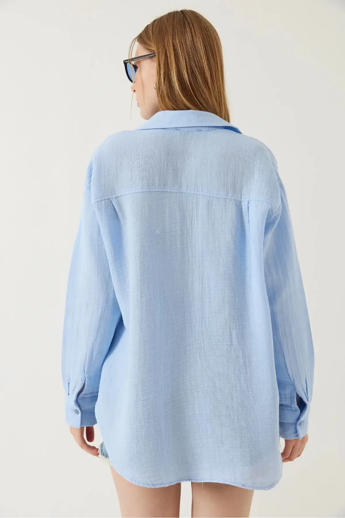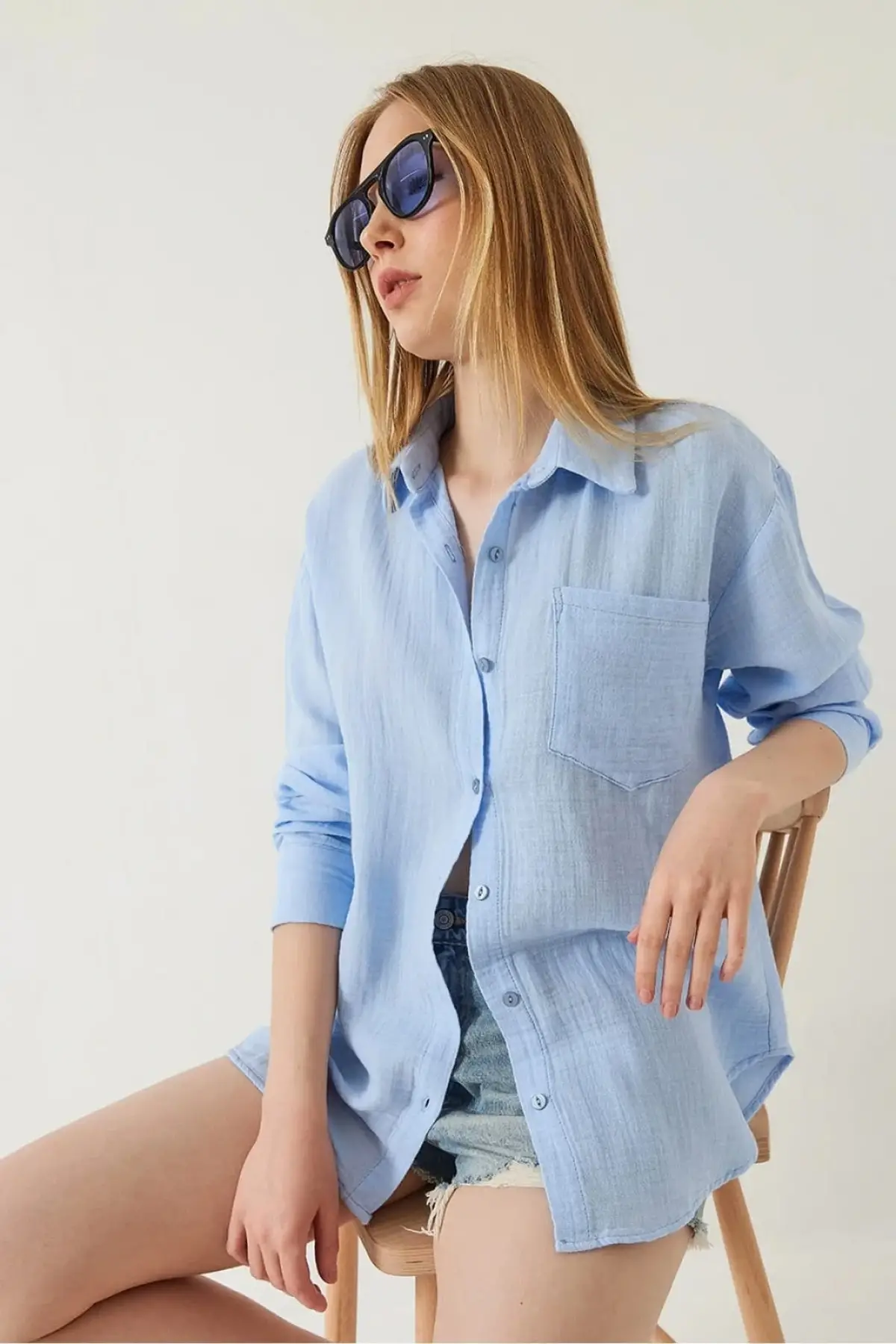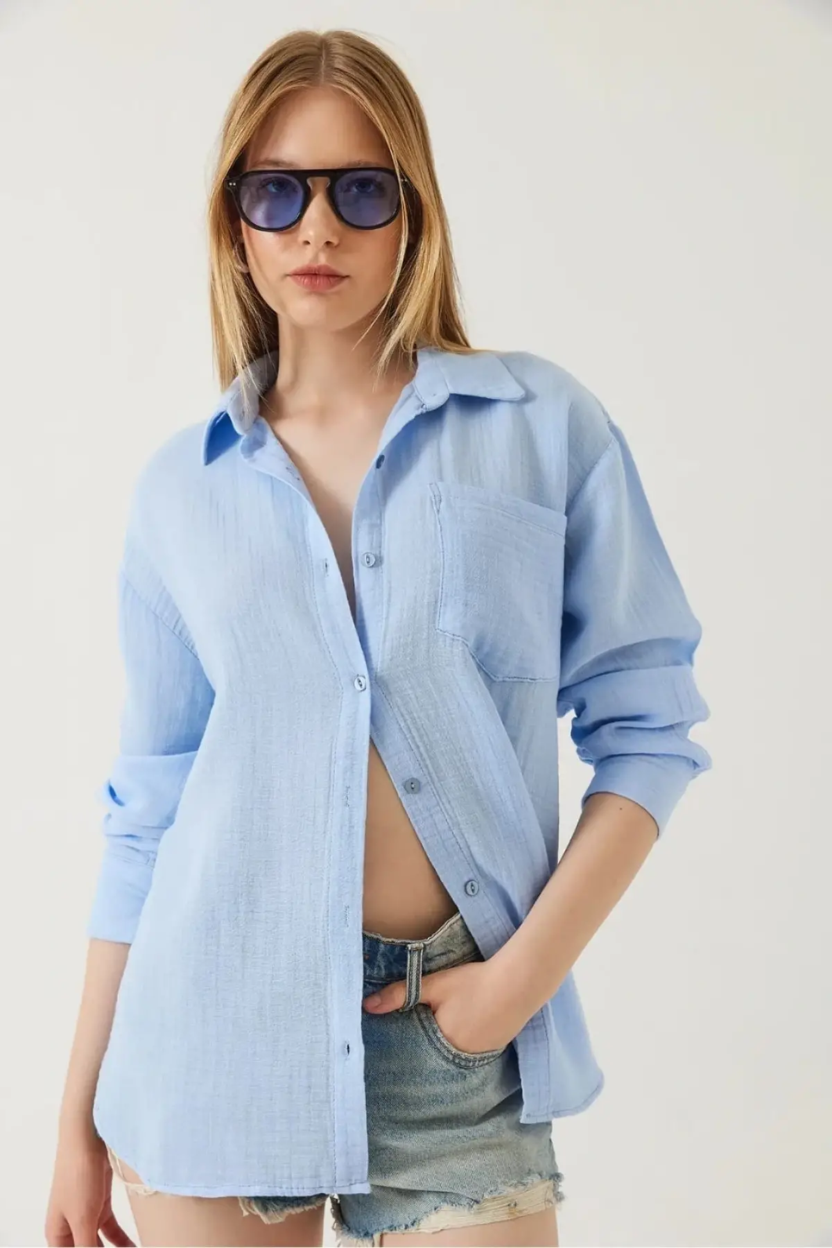 Şıklığı ve rahatlığı bir arada sunan Tek Cep Müslin Gömlek Mavi, gardırobunuzun vazgeçilmez parçalarından biri olmaya aday. Detaylı dikişleri ve kaliteli kumaşı ile gün boyu konfor sağlar.