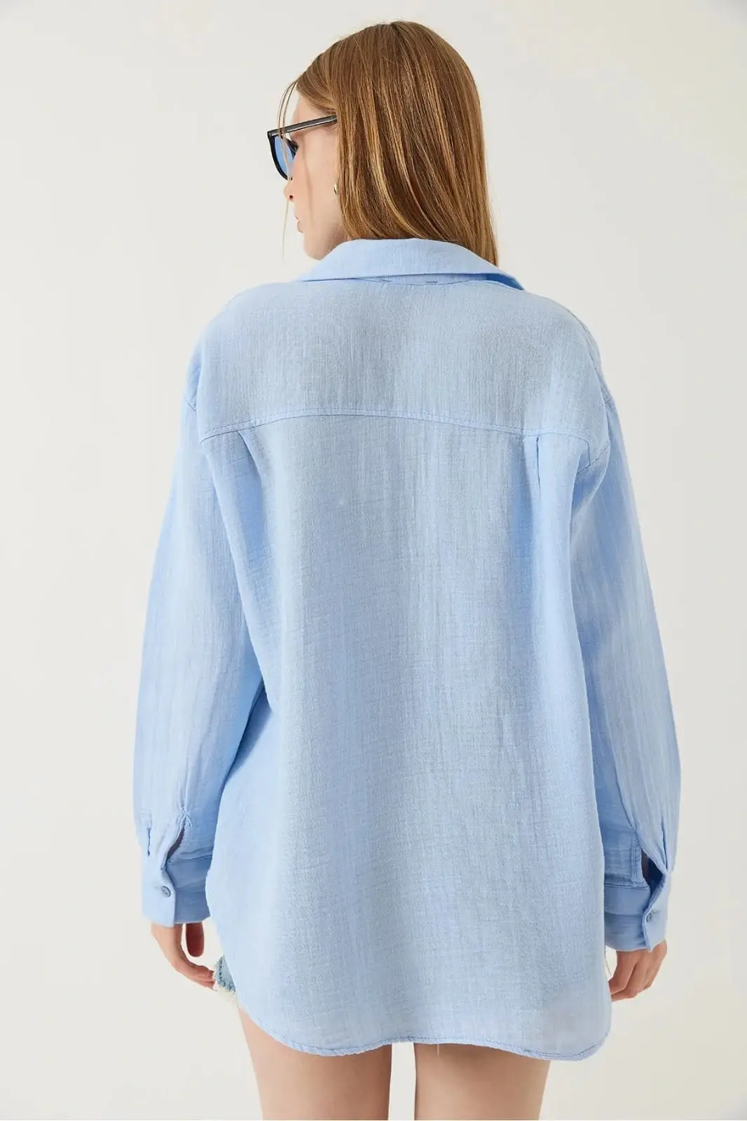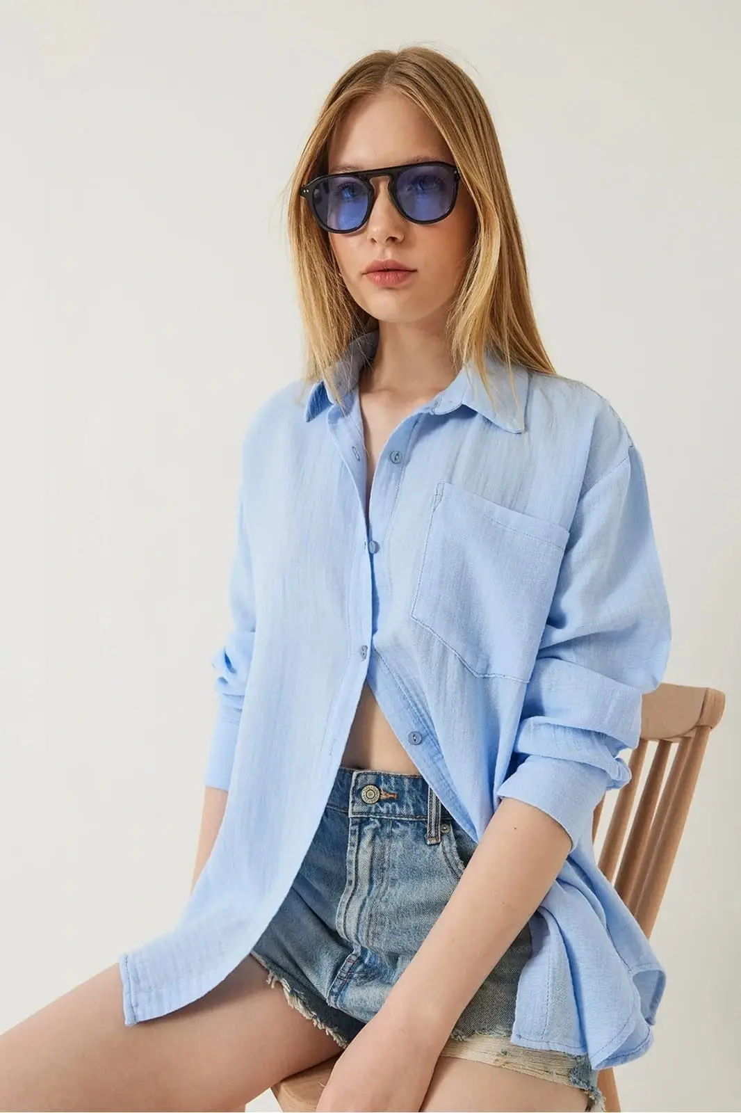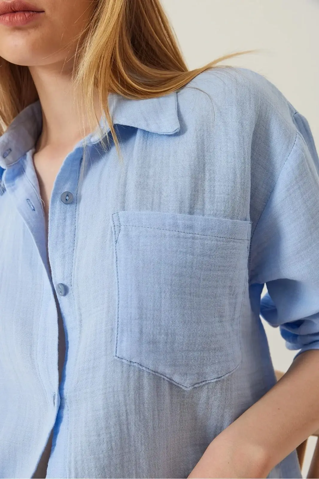 Bu mavi tek cepli müslin gömlek, gardırobunuzun vazgeçilmezi olmaya aday! Zarif tasarımı ve rahat kesimiyle şıklığı ve konforu bir arada sunar.
