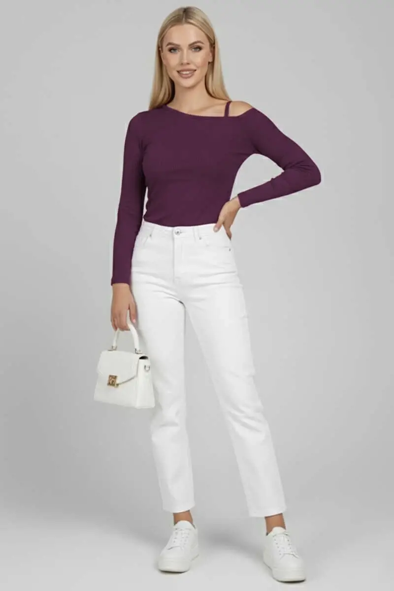 Şıklığı ve rahatlığı bir arada sunan Tek Omuz İpli Bluz Mürdüm T4328, gardırobunuzun vazgeçilmezi olmaya aday.