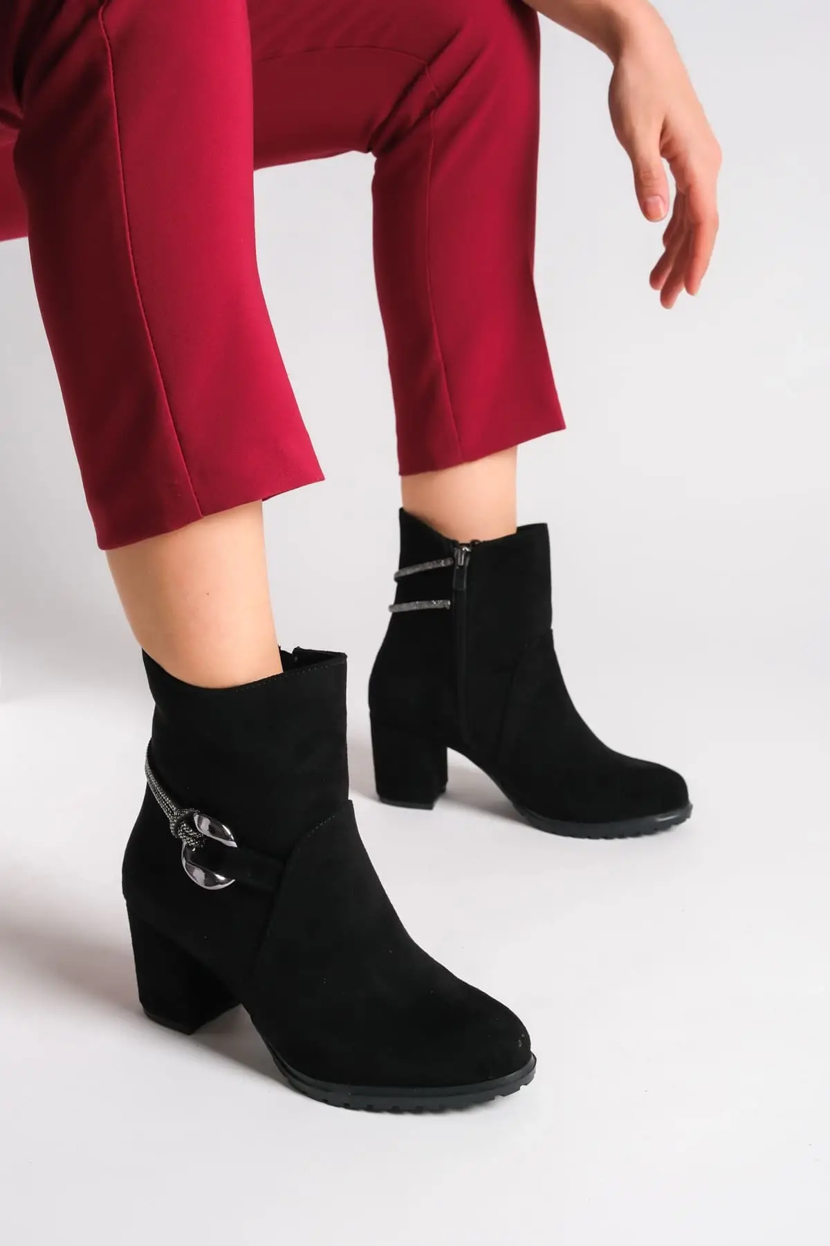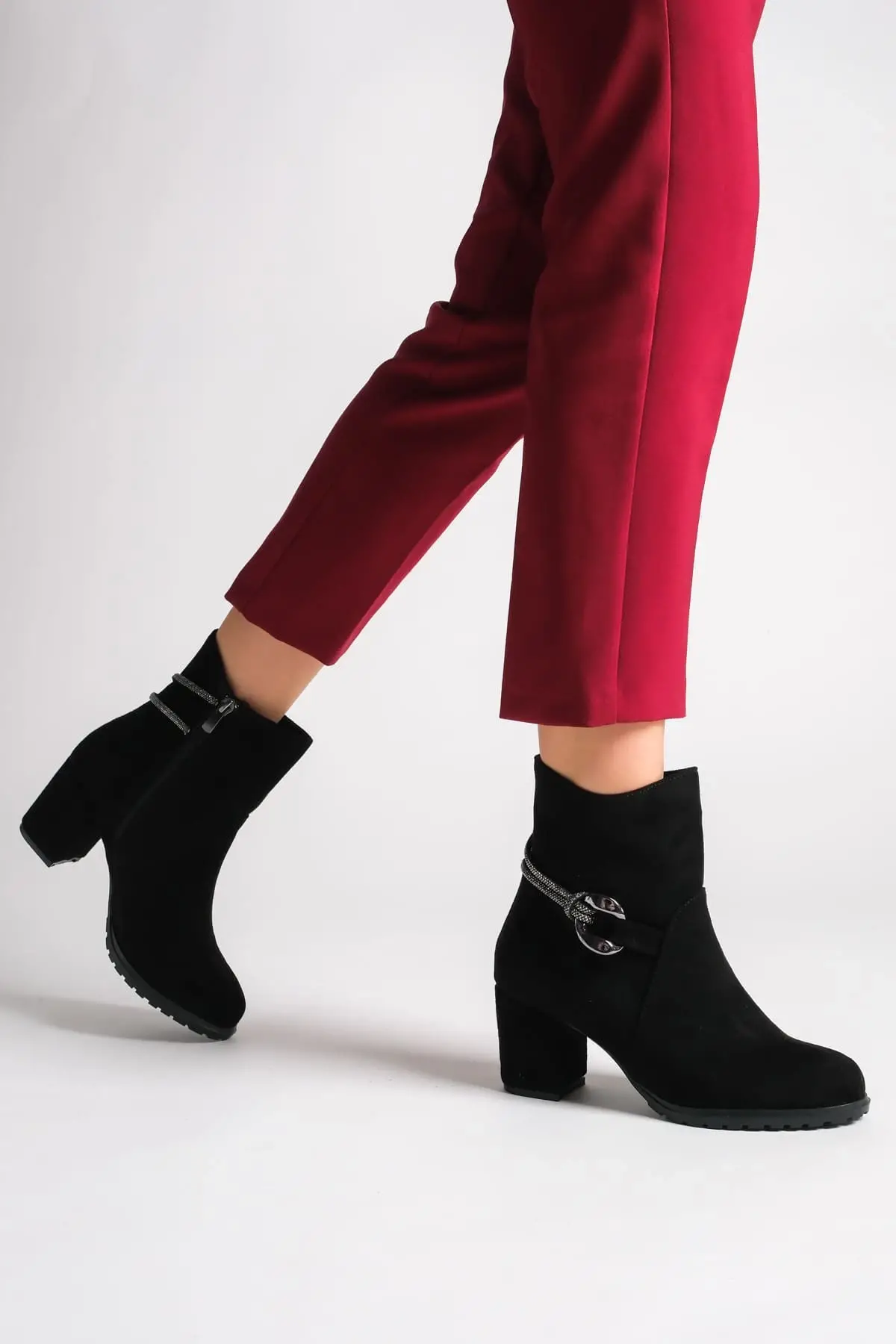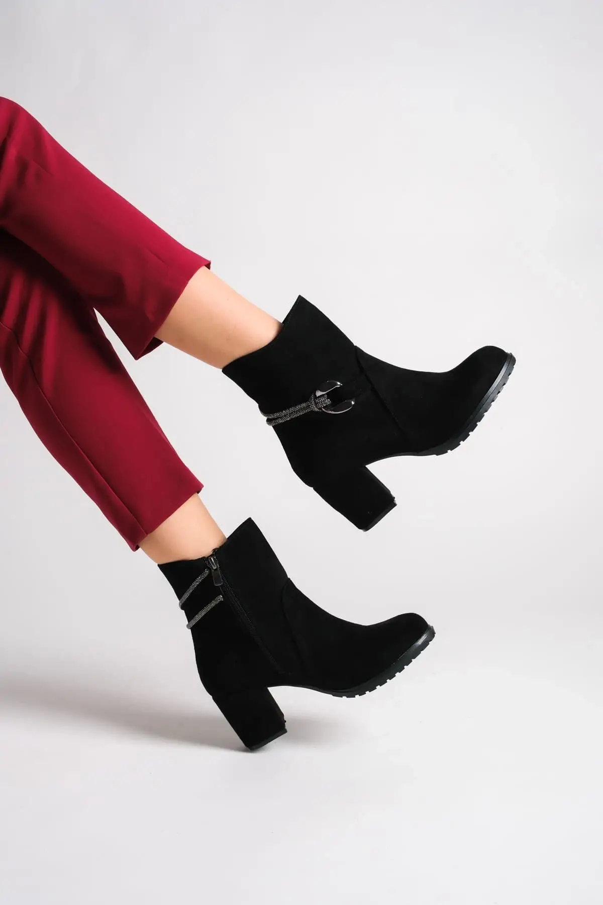 Edna Fermuarlı Ortopedik Taban Taşlı Topuklu Süet Kadın Bot St - Siyah